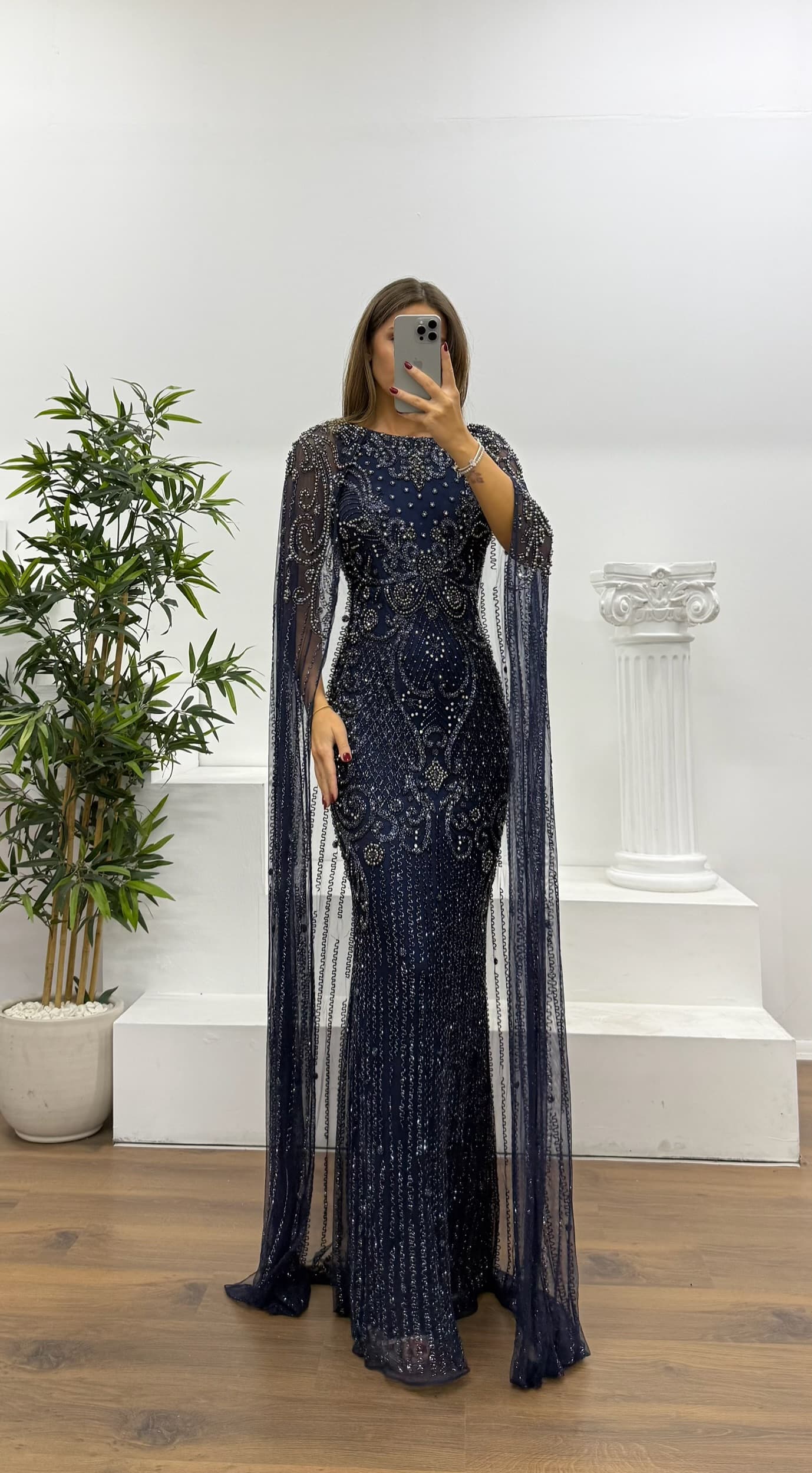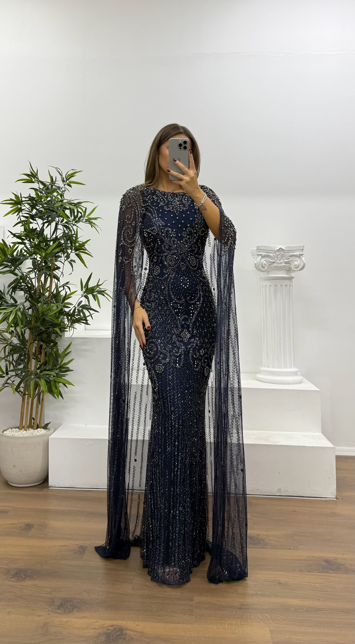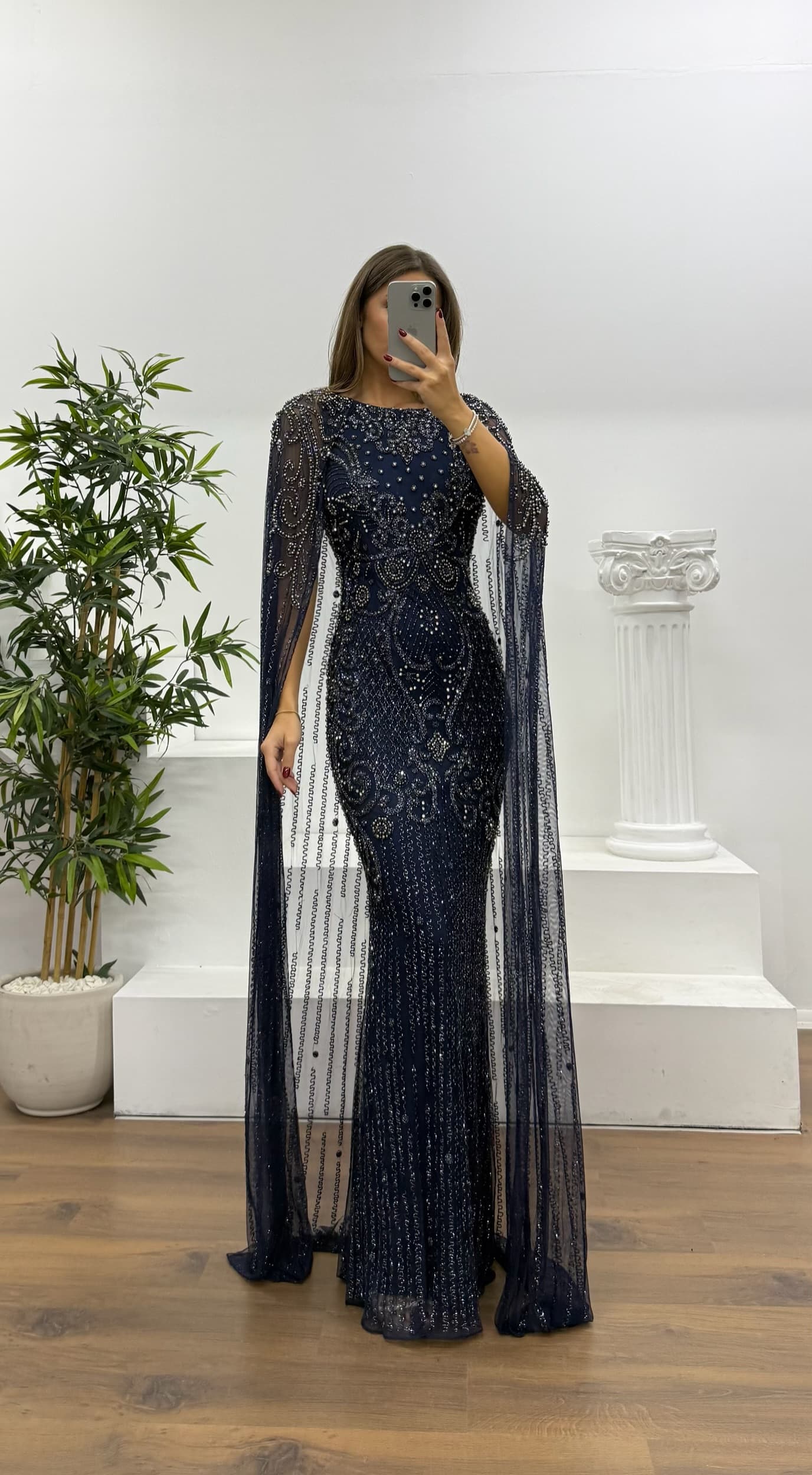 Ürün 36-46 bedene kadar uyumlu, göğüs pedli, astarlı, arka kapama fermuar, pelerin detay, işlemeli abiye olarak tasarlanmıştır.