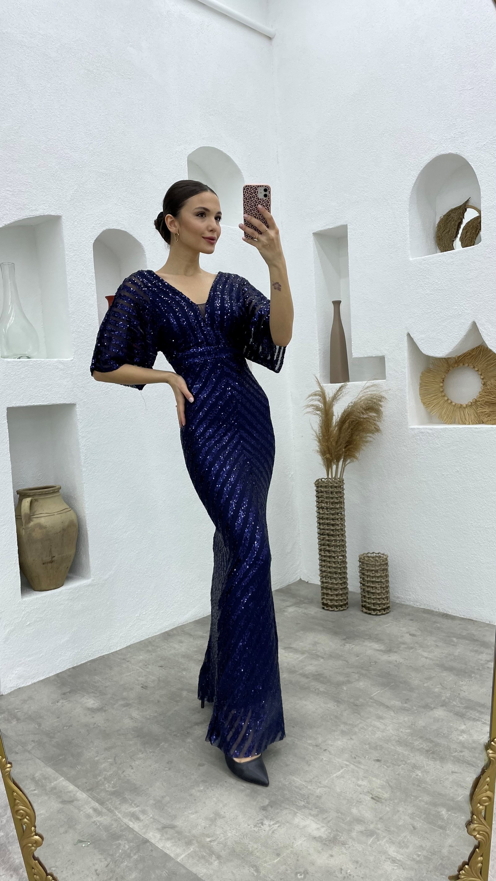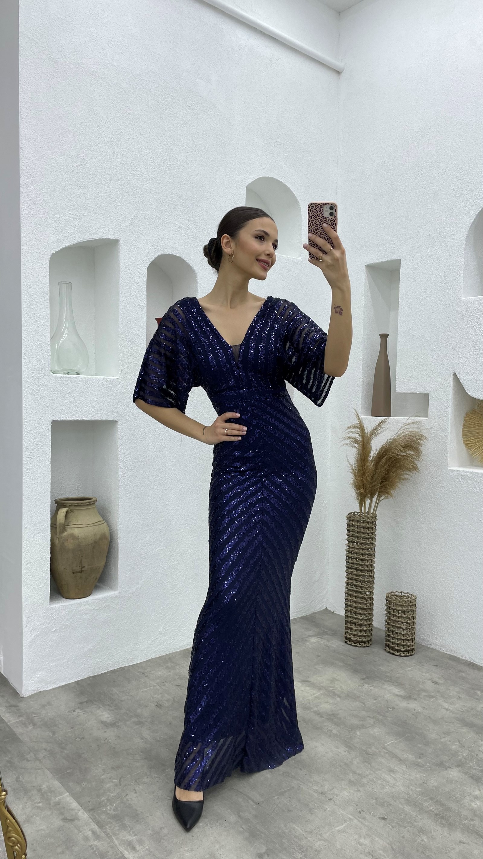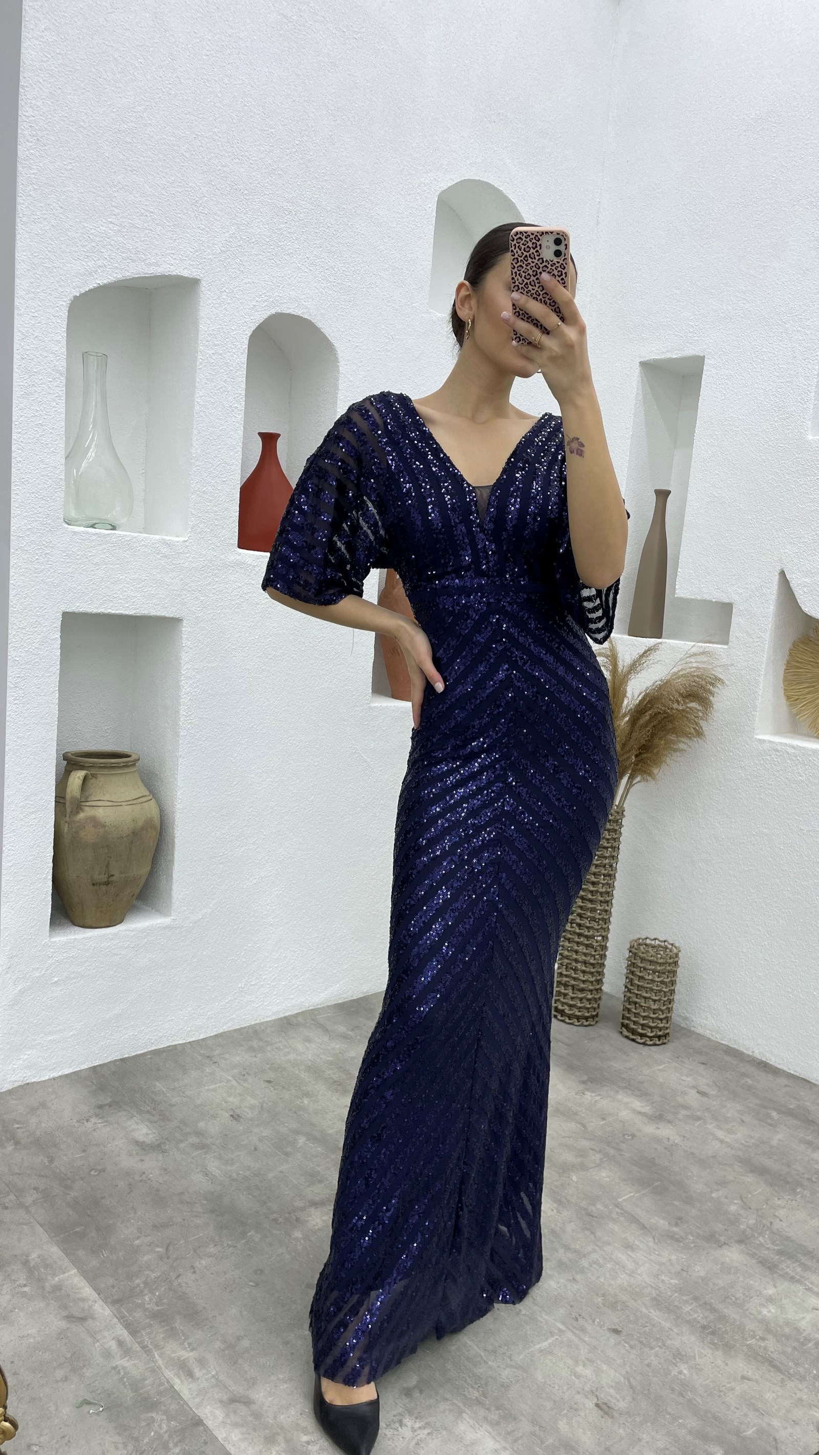 Lacivert Pul Payet V Yaka Uzun Abiye Elbise