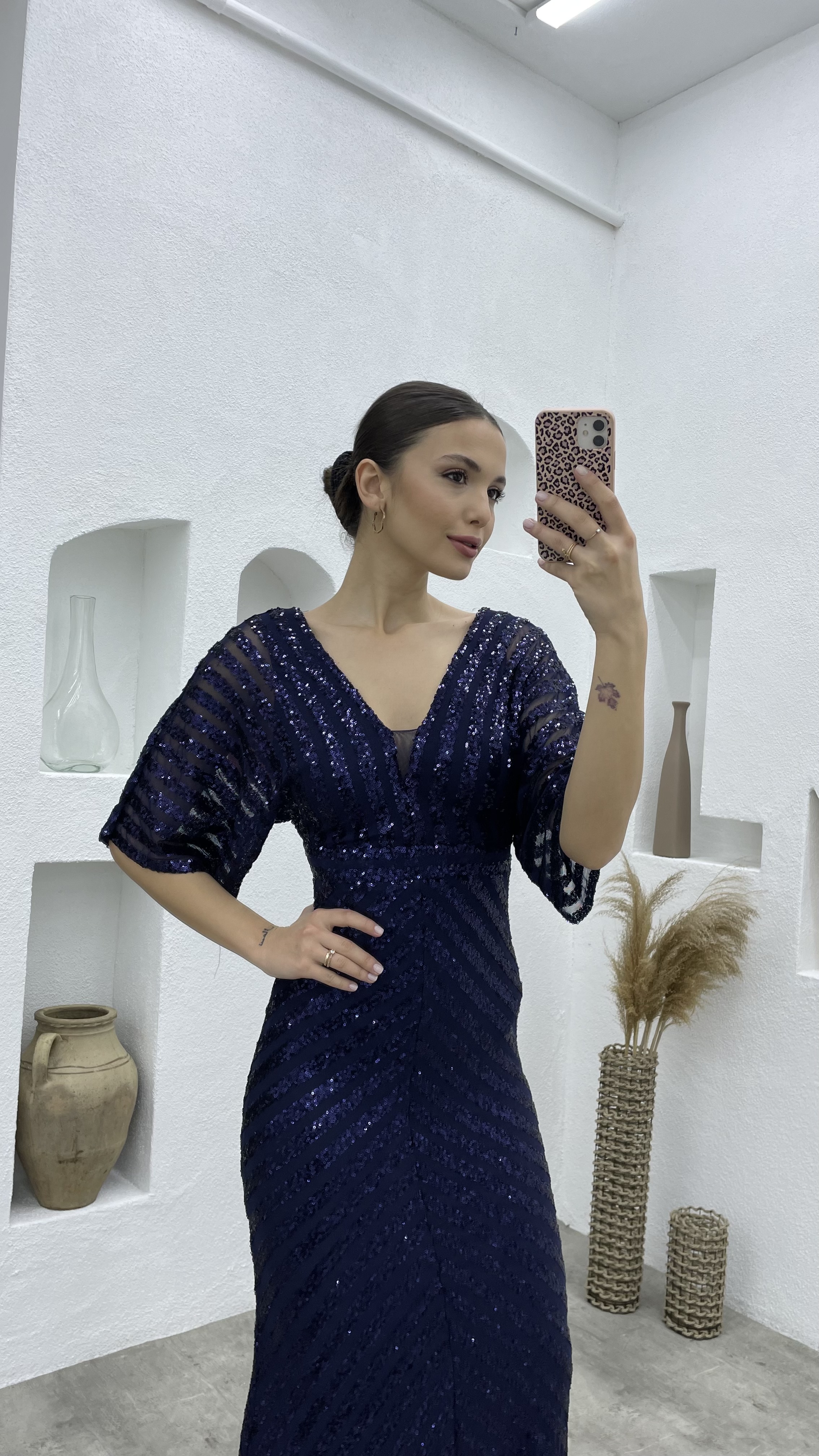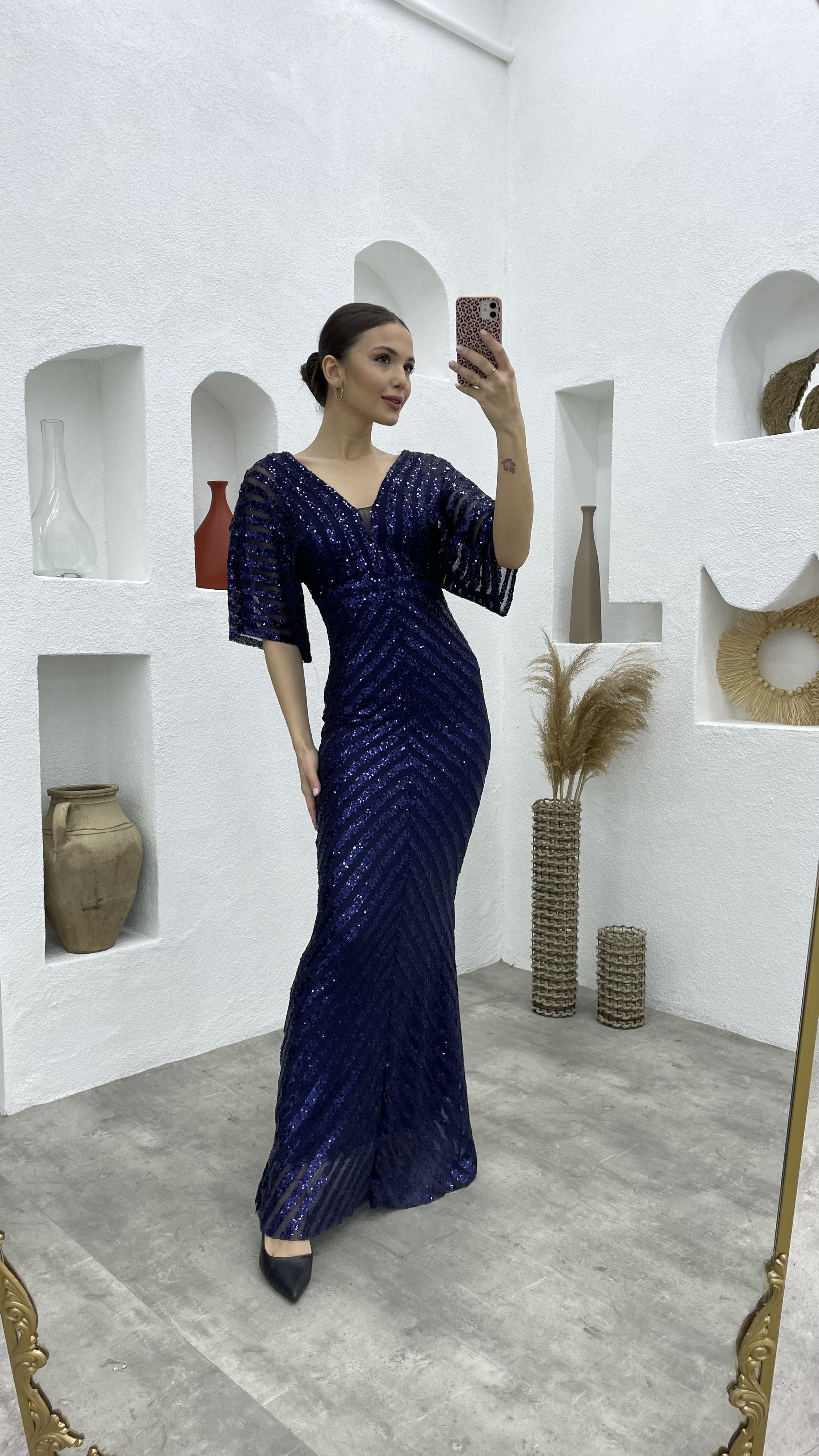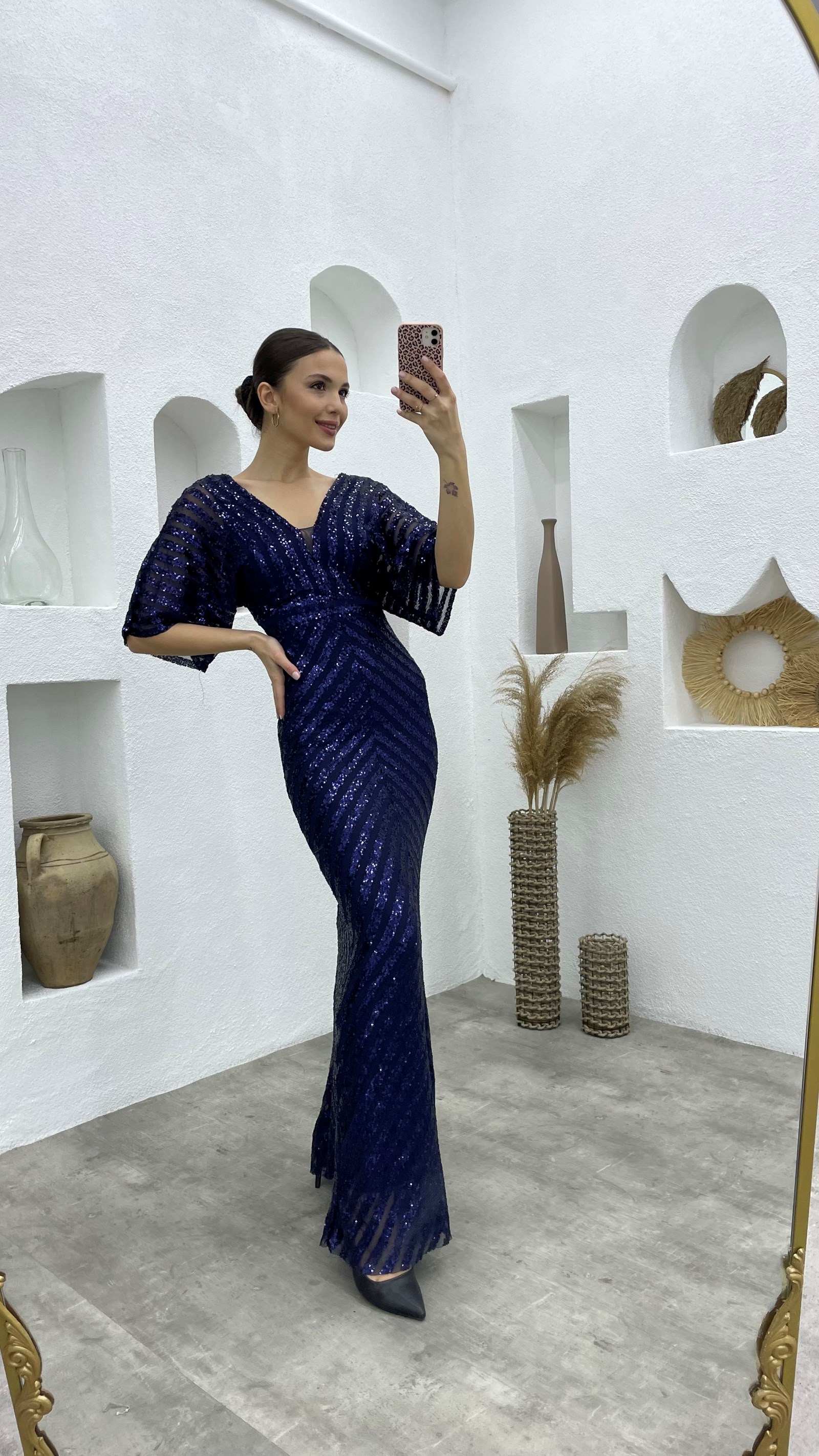 Lacivert Pul Payet V Yaka Uzun Abiye Elbise