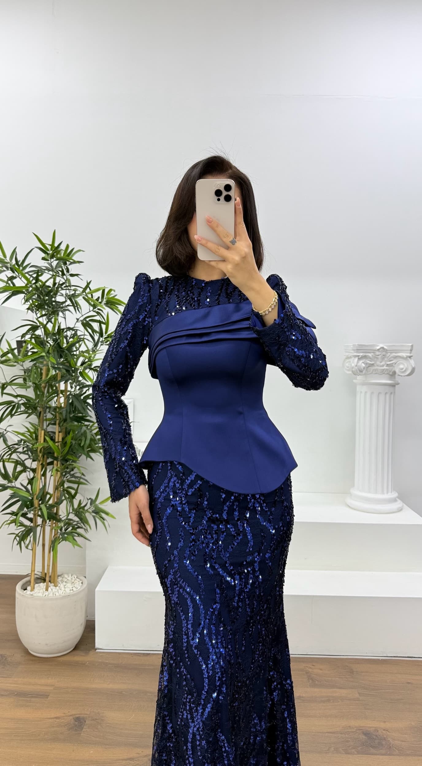 • Lacivert Saten Büstiyerli Payetli Balık Abiye Elbise