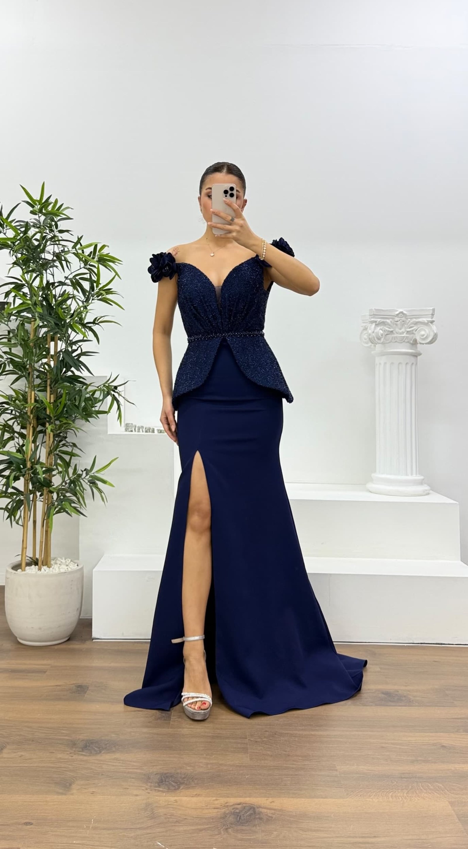 Simli çiçek askılı peplum kesim abiye elbise