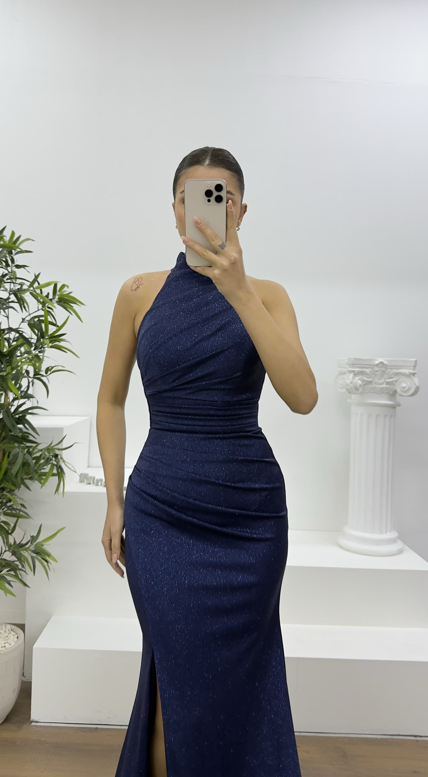 Simli drapeli halter yaka abiye elbise