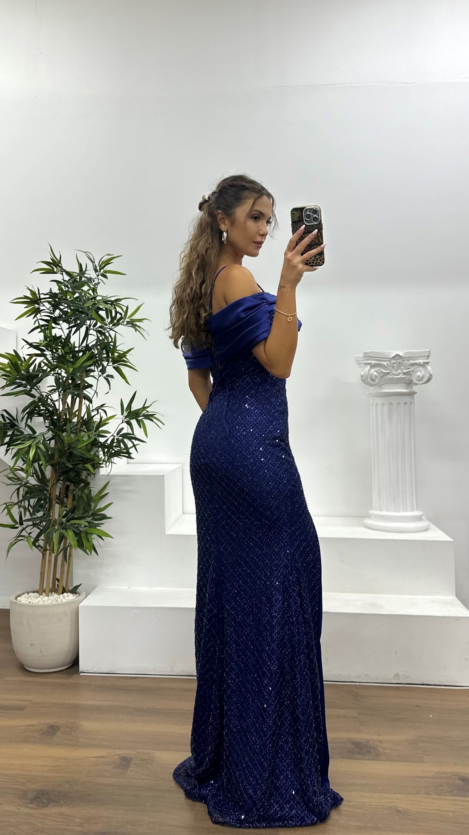 Ürün 36-42 bedene kadar uyumlu, göğüs pedli, astarlı, sırt capraz ip ve fermuar kapamalı, yırtmaçlı, ip askılı, işlemeli abiye olarak tasarlanmıştır.