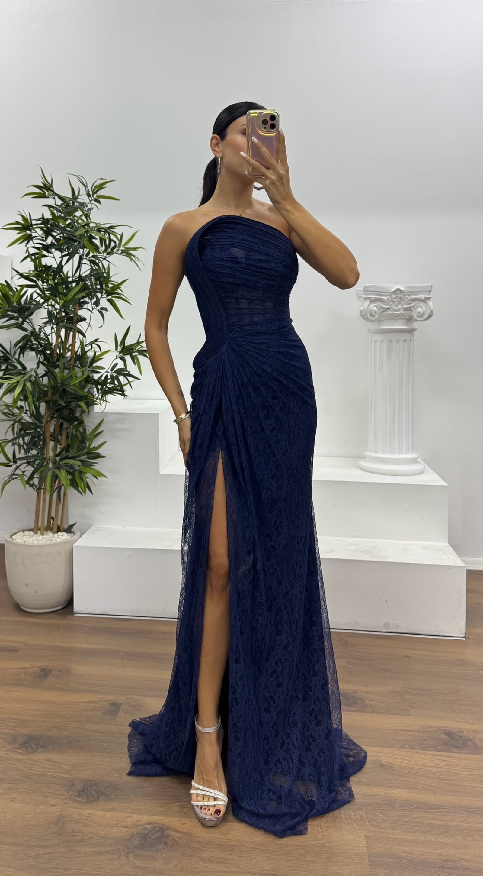• Lacivert Straplez Bel Transparan Dantel Abiye Elbise