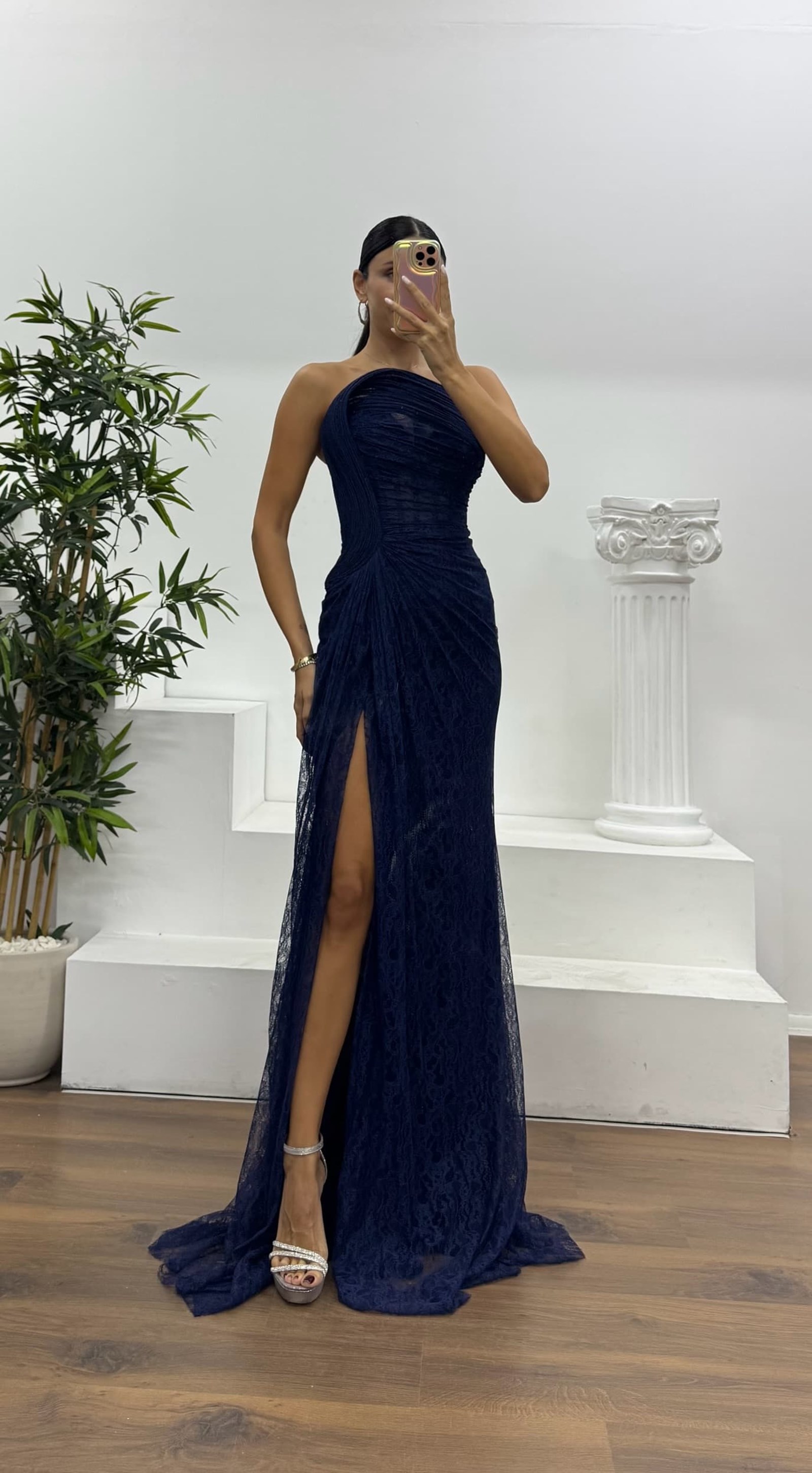 Ürün 36-44 bedene kadar uyumlu, göğüs pedli, astarlı, sırt capraz ip ve fermuar kapamalı, yırtmaçlı abiye olarak tasarlanmıştır.