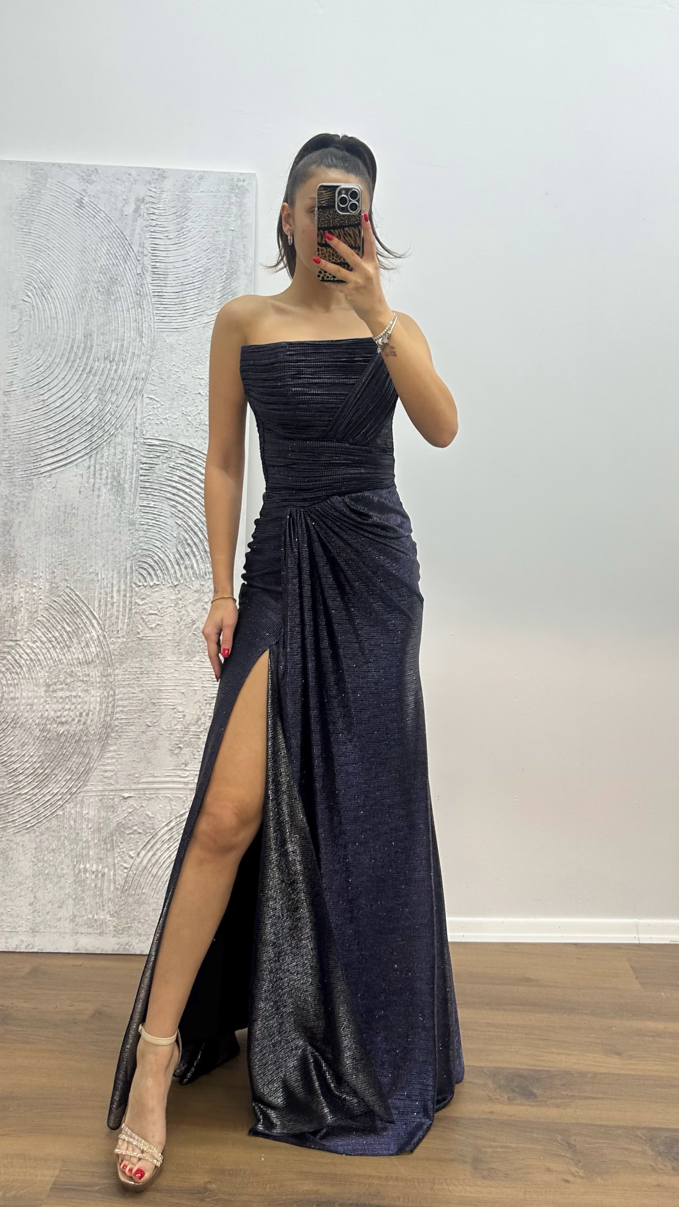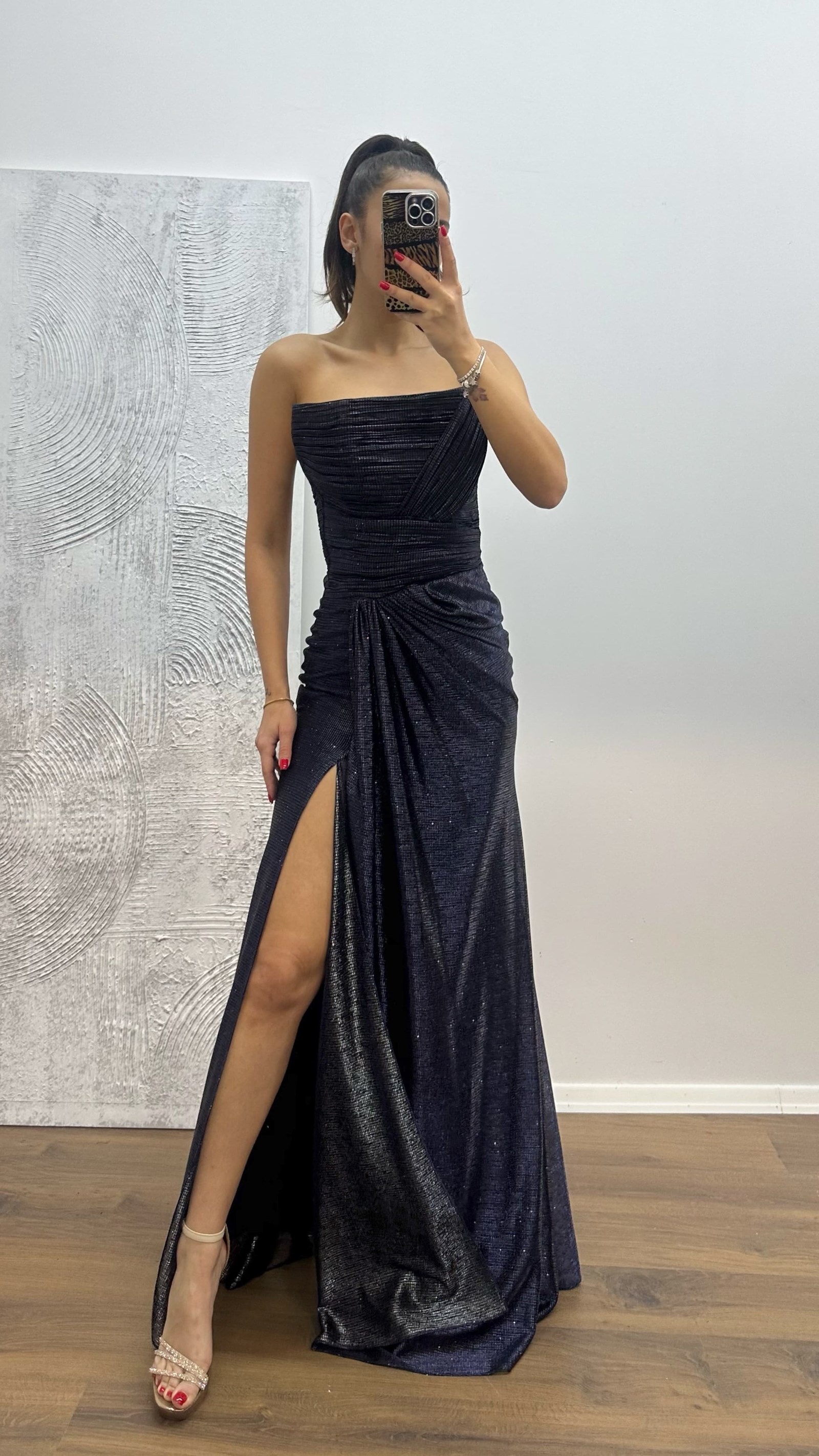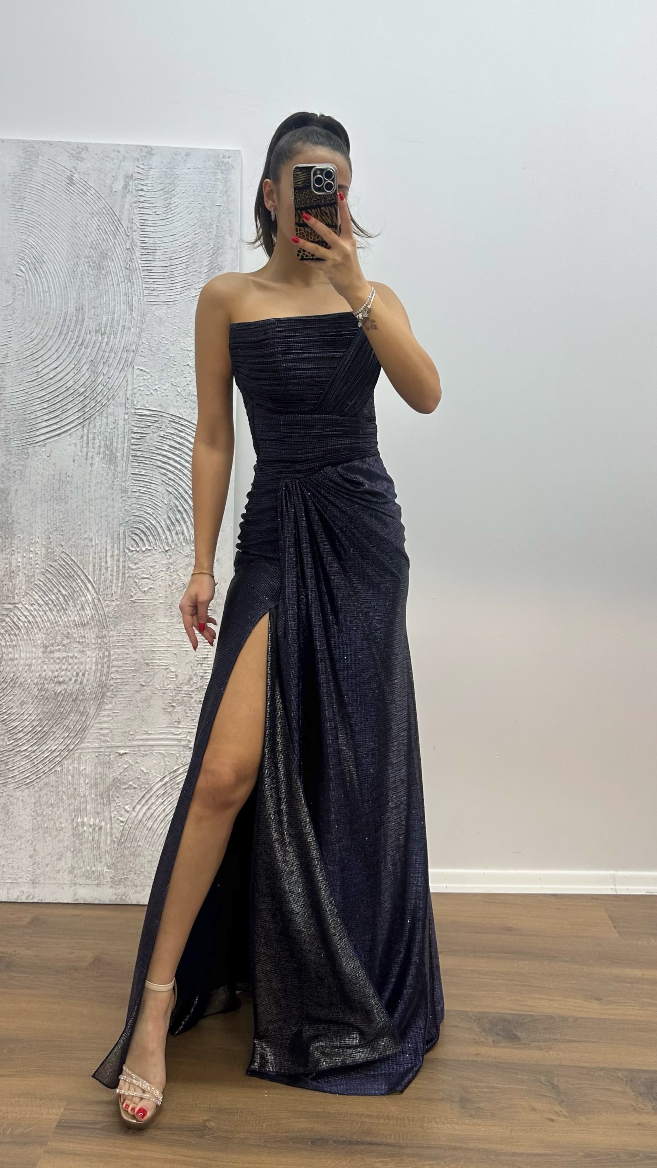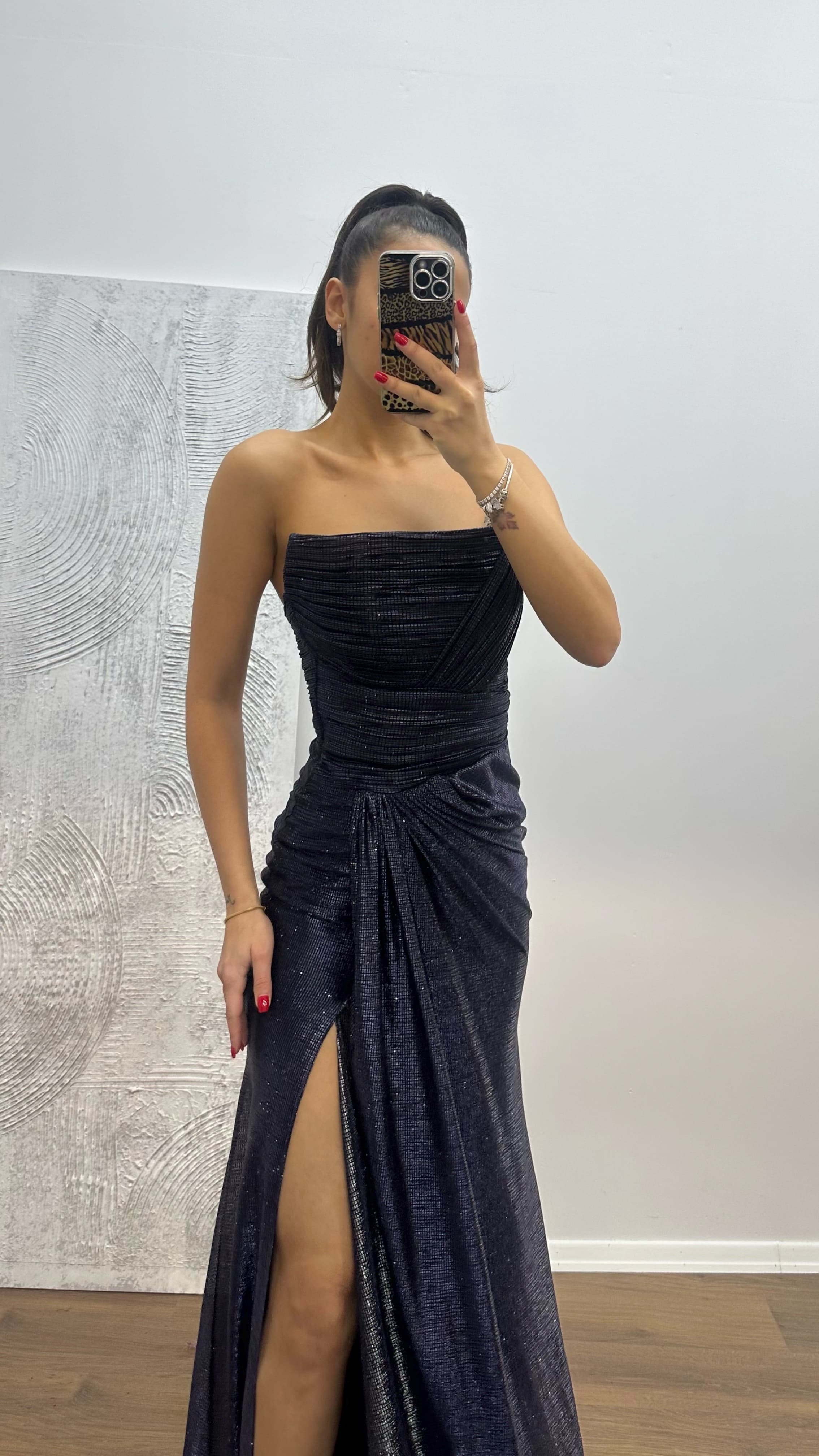 • Siyah Gold Straplez Drapeli Abiye Elbise