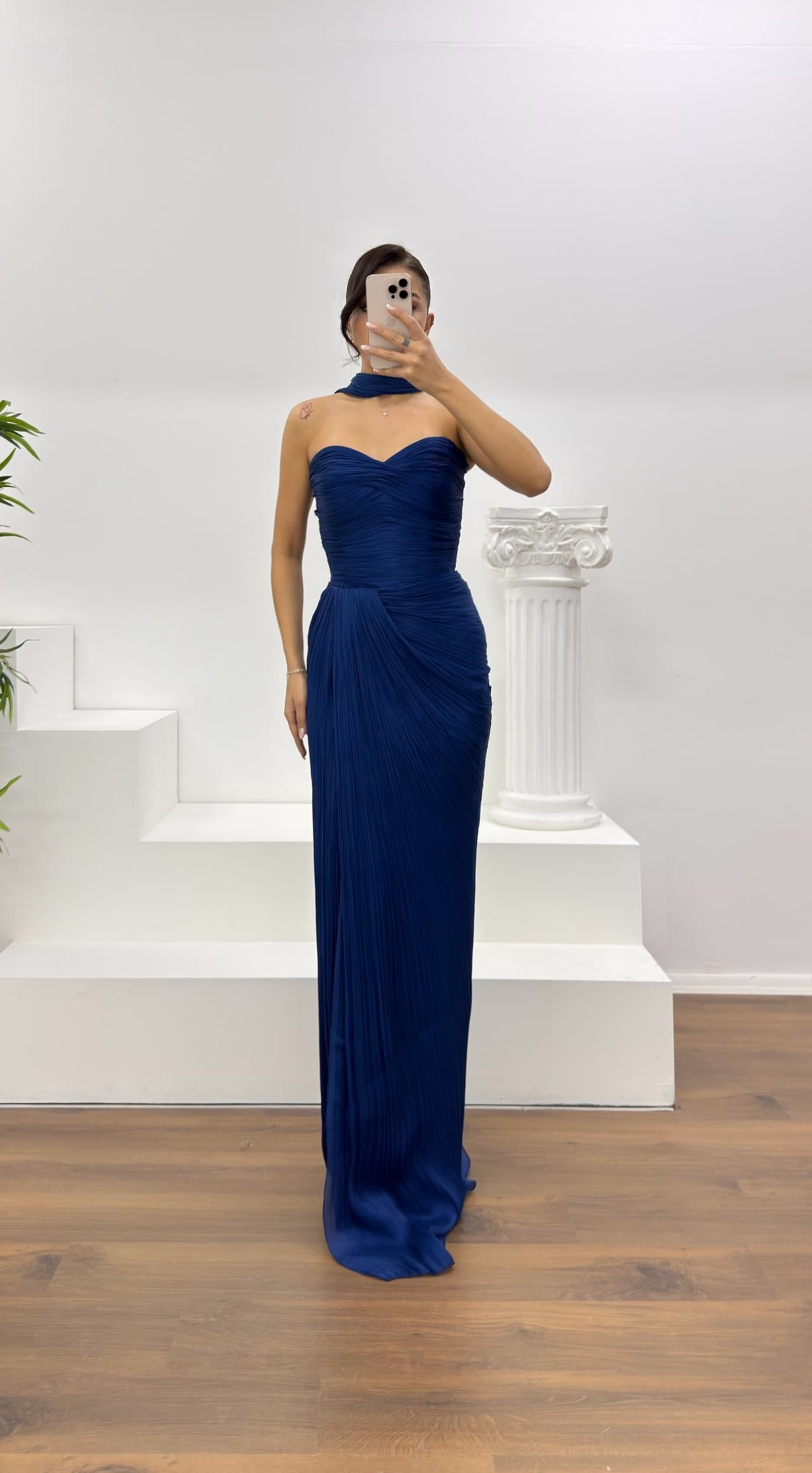 Lacivert Straplez Piliseli Abiye Elbise