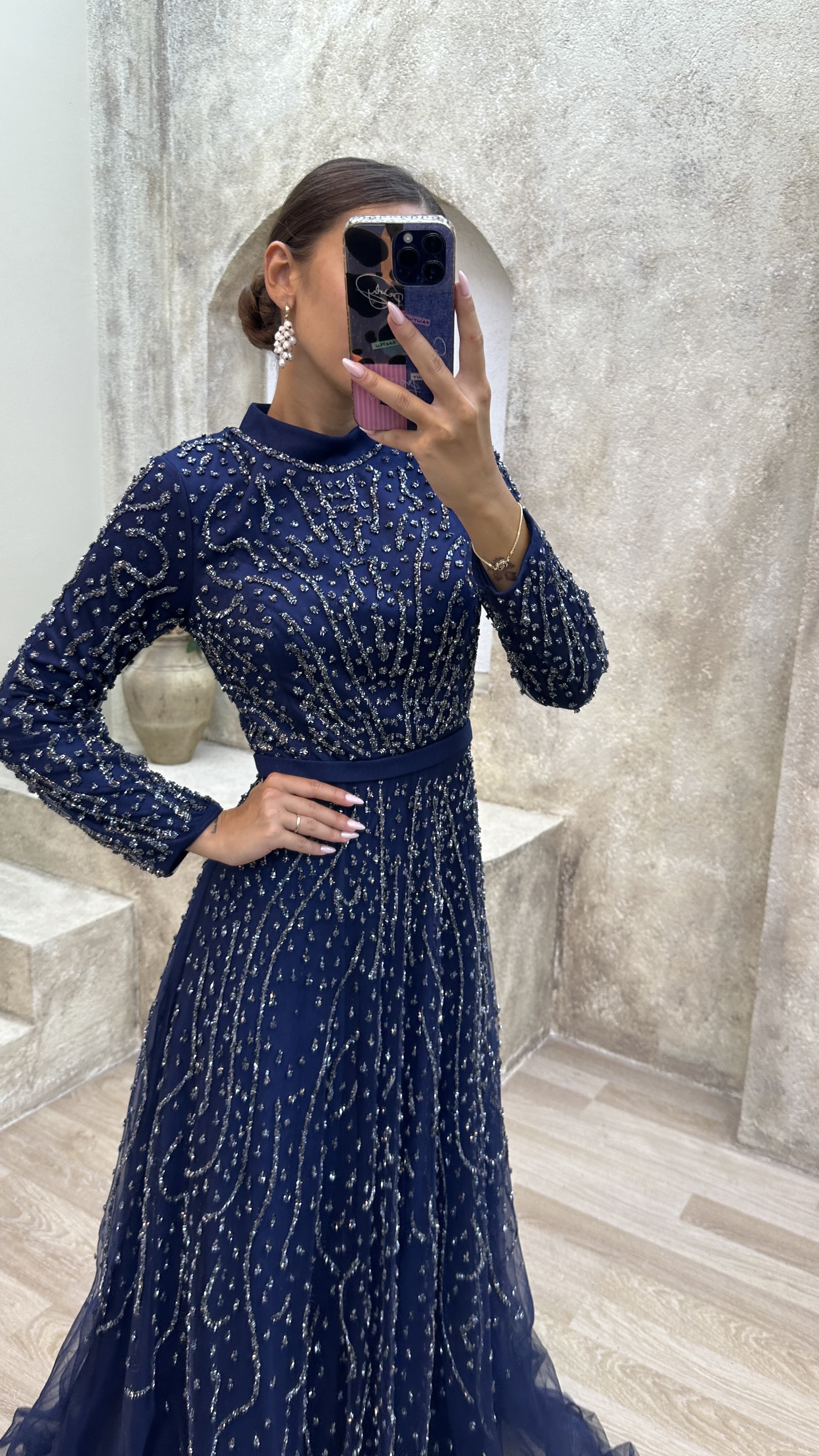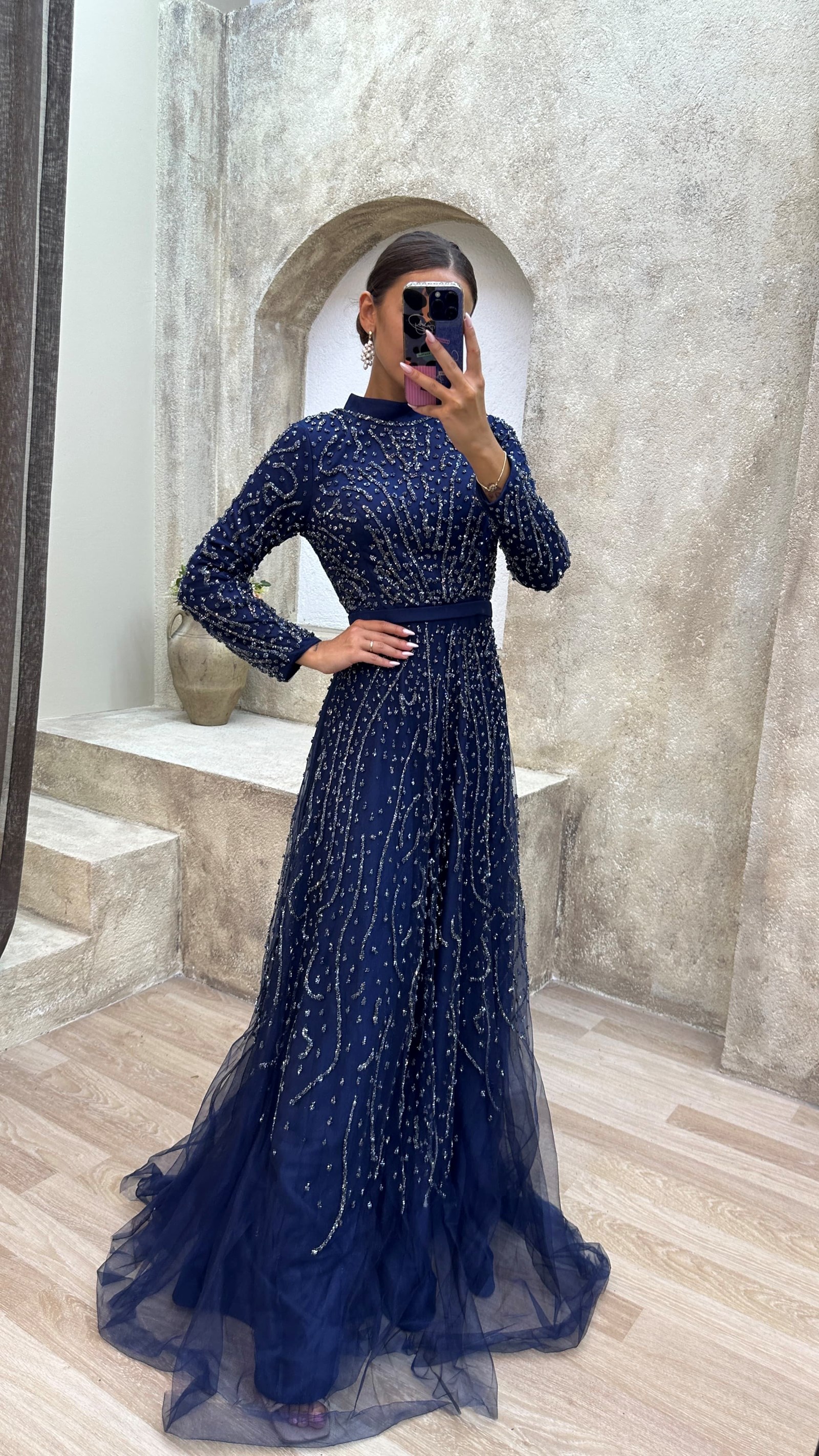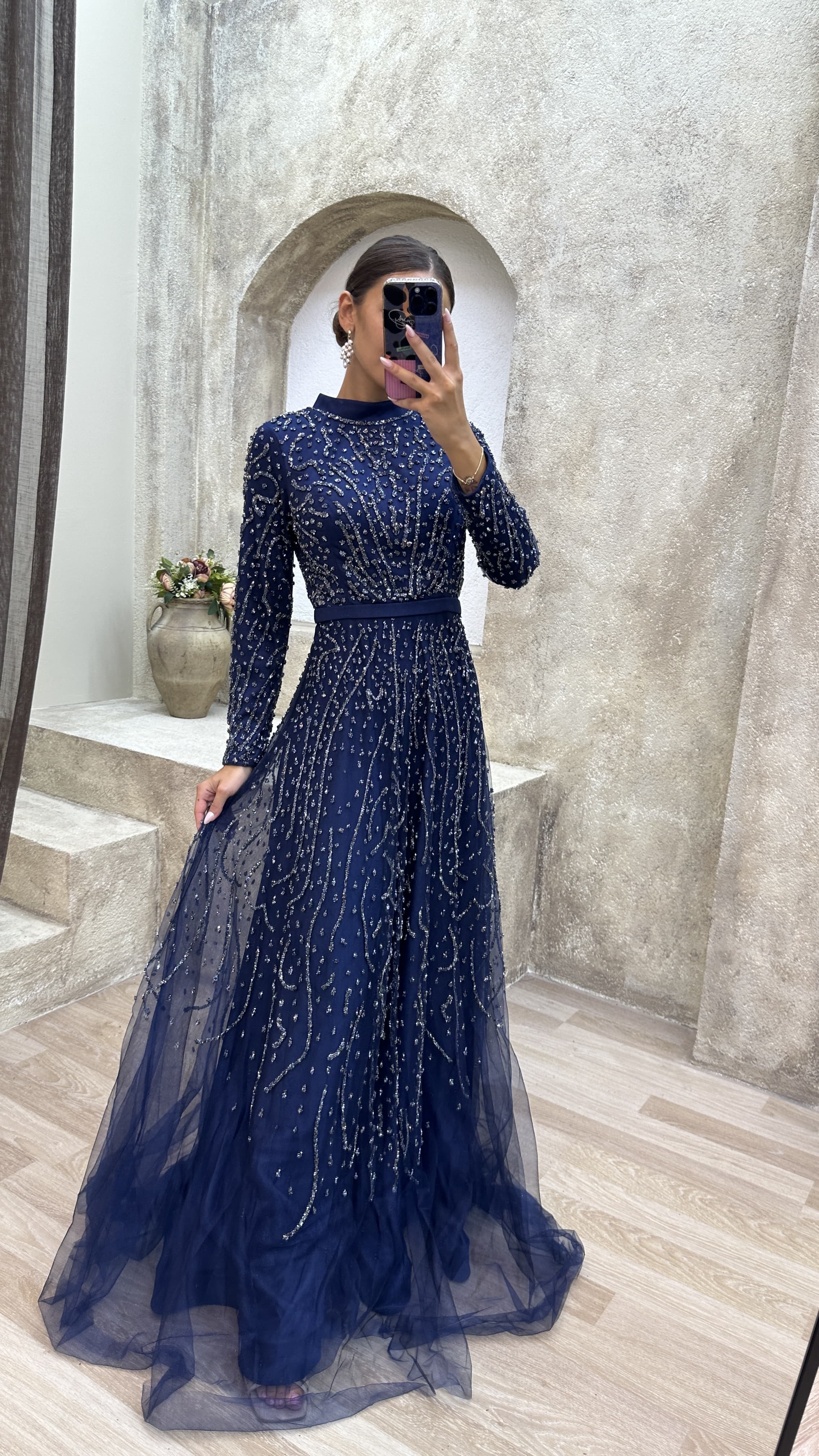 • Lacivert Taş İşlemeli Tül Tesettür Abiye Elbise