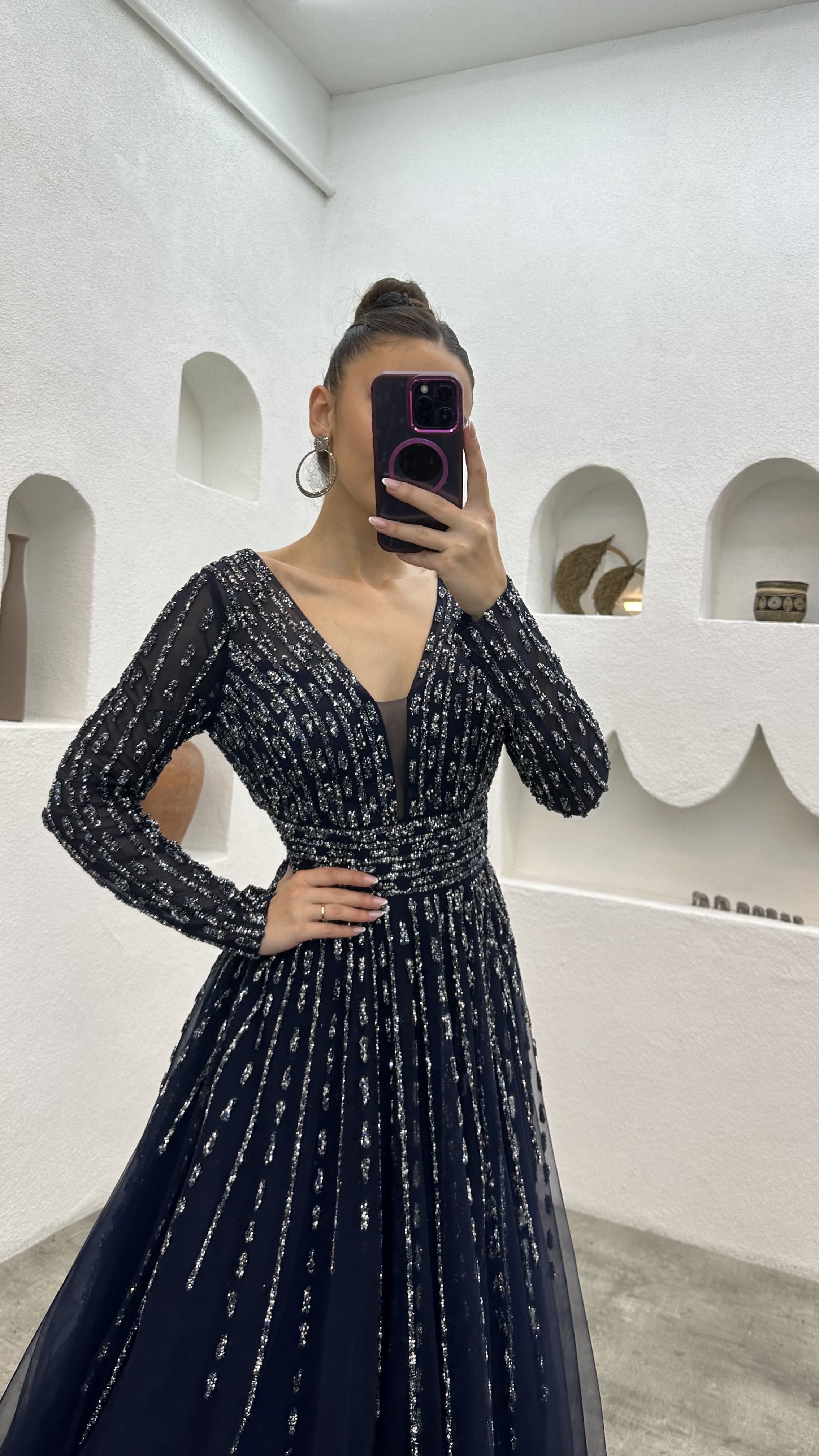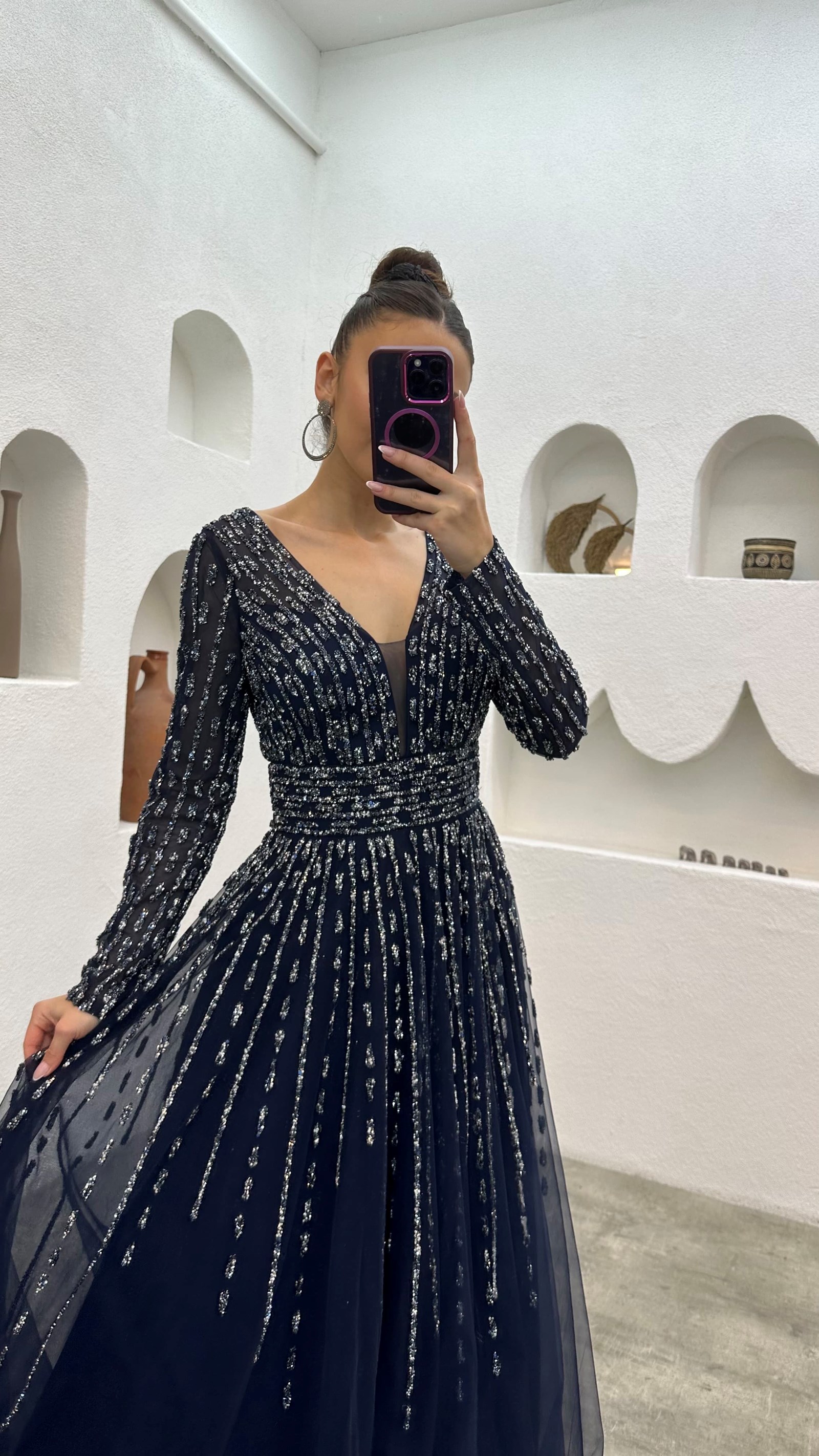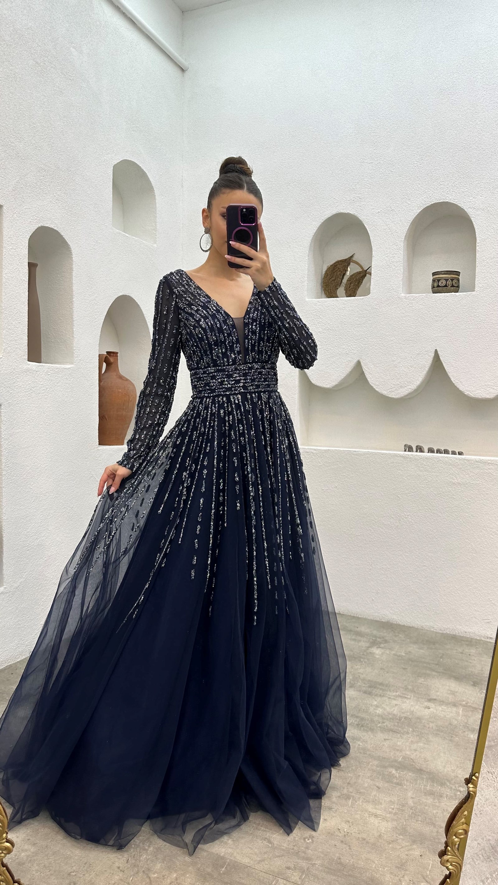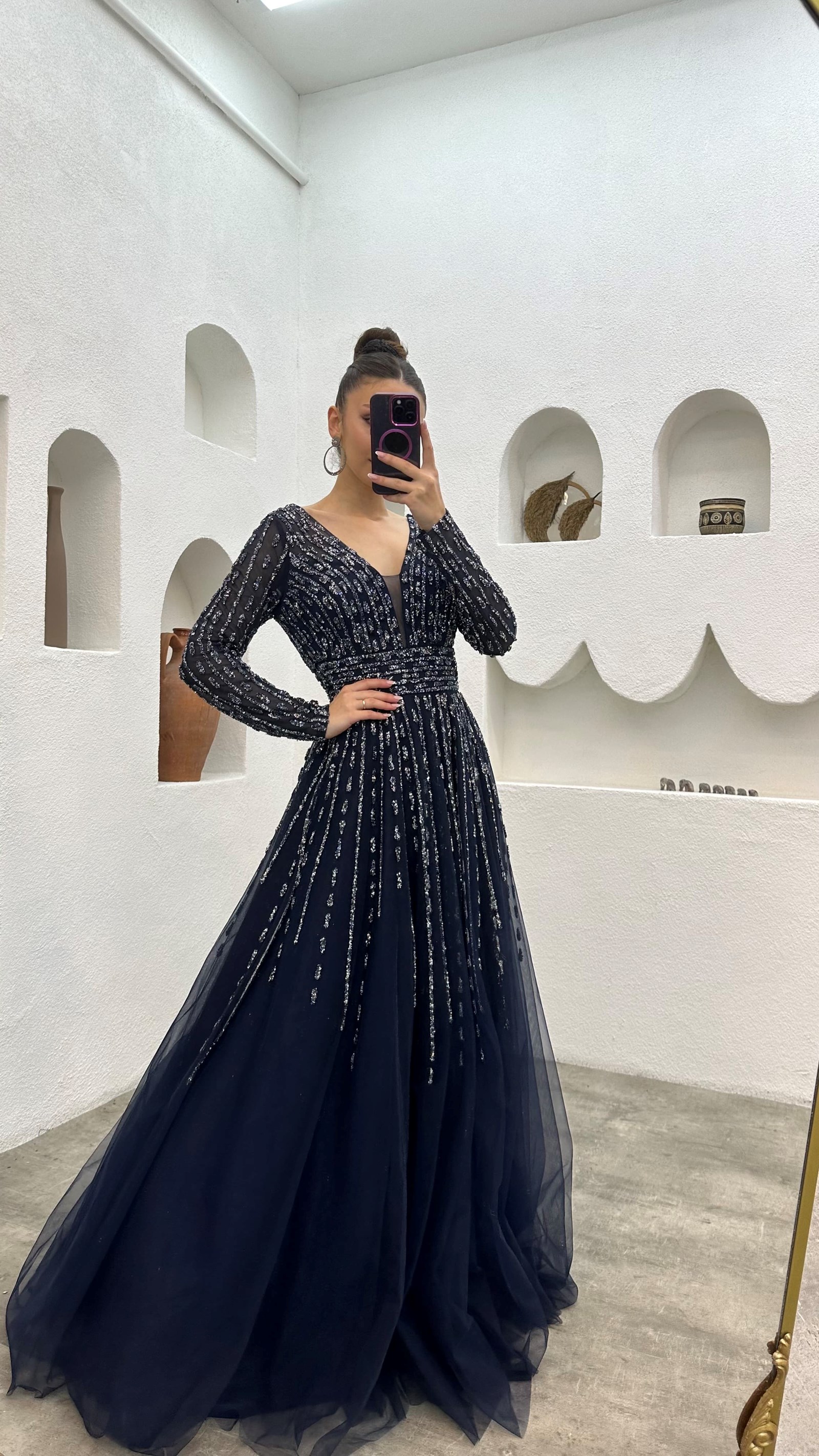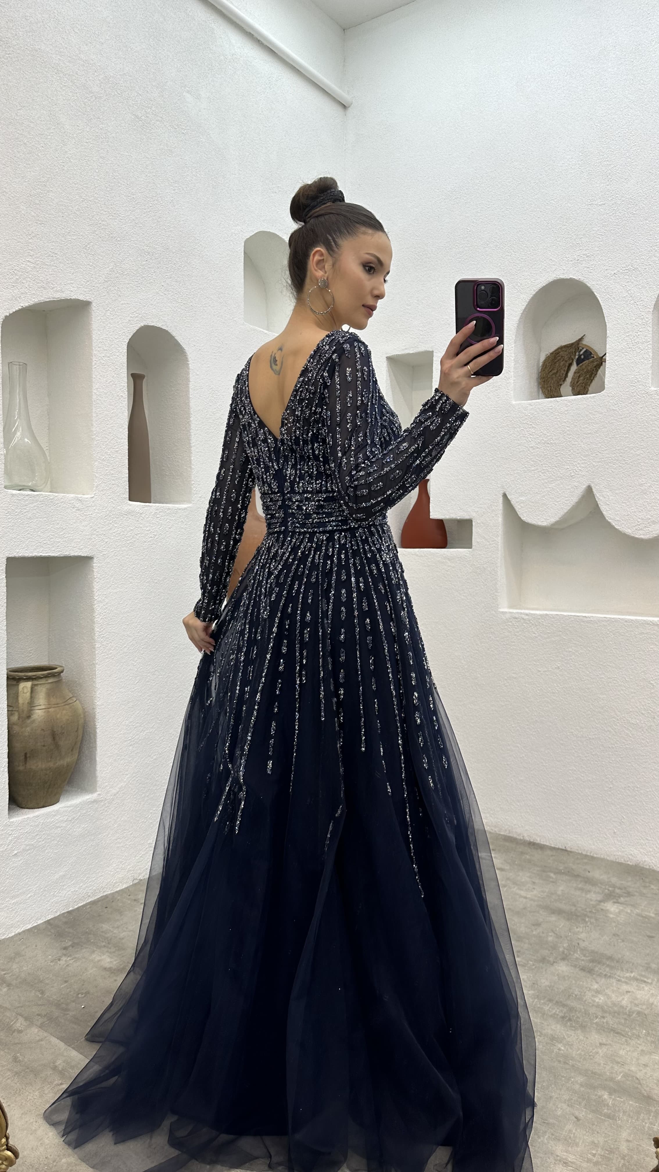 • Lacivert Taşlı İşlemeli Tül Abiye Elbise