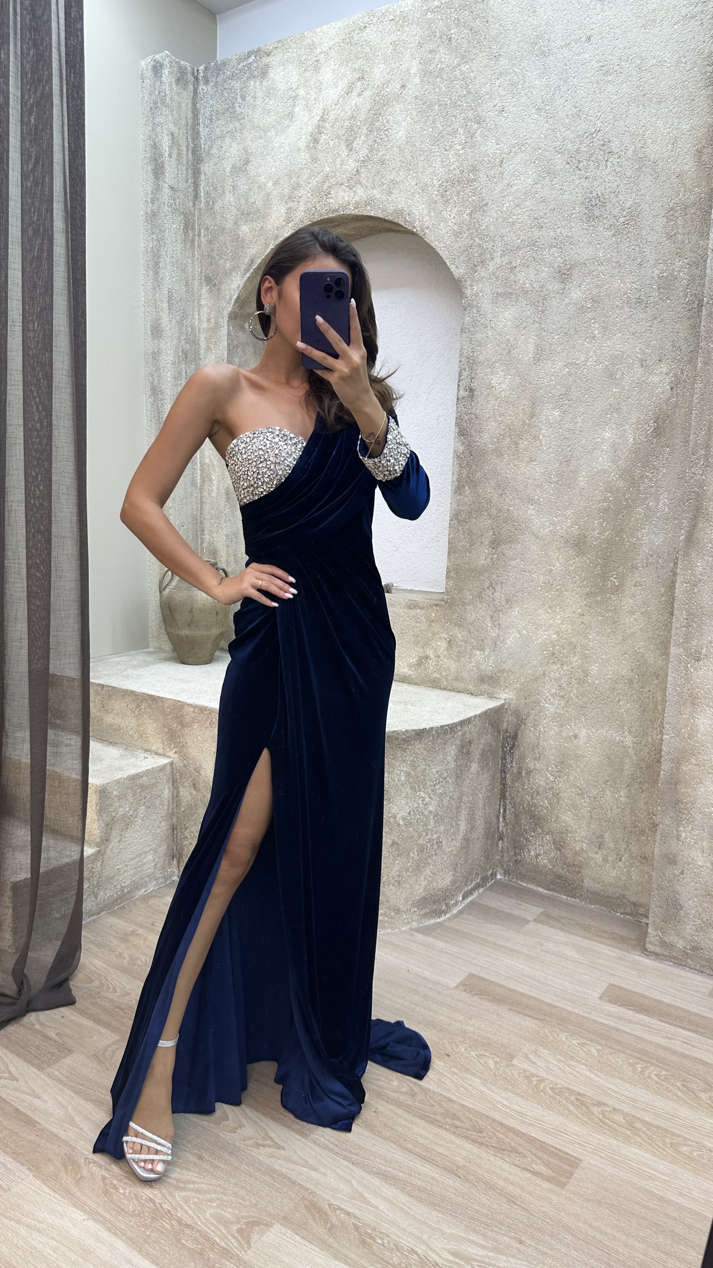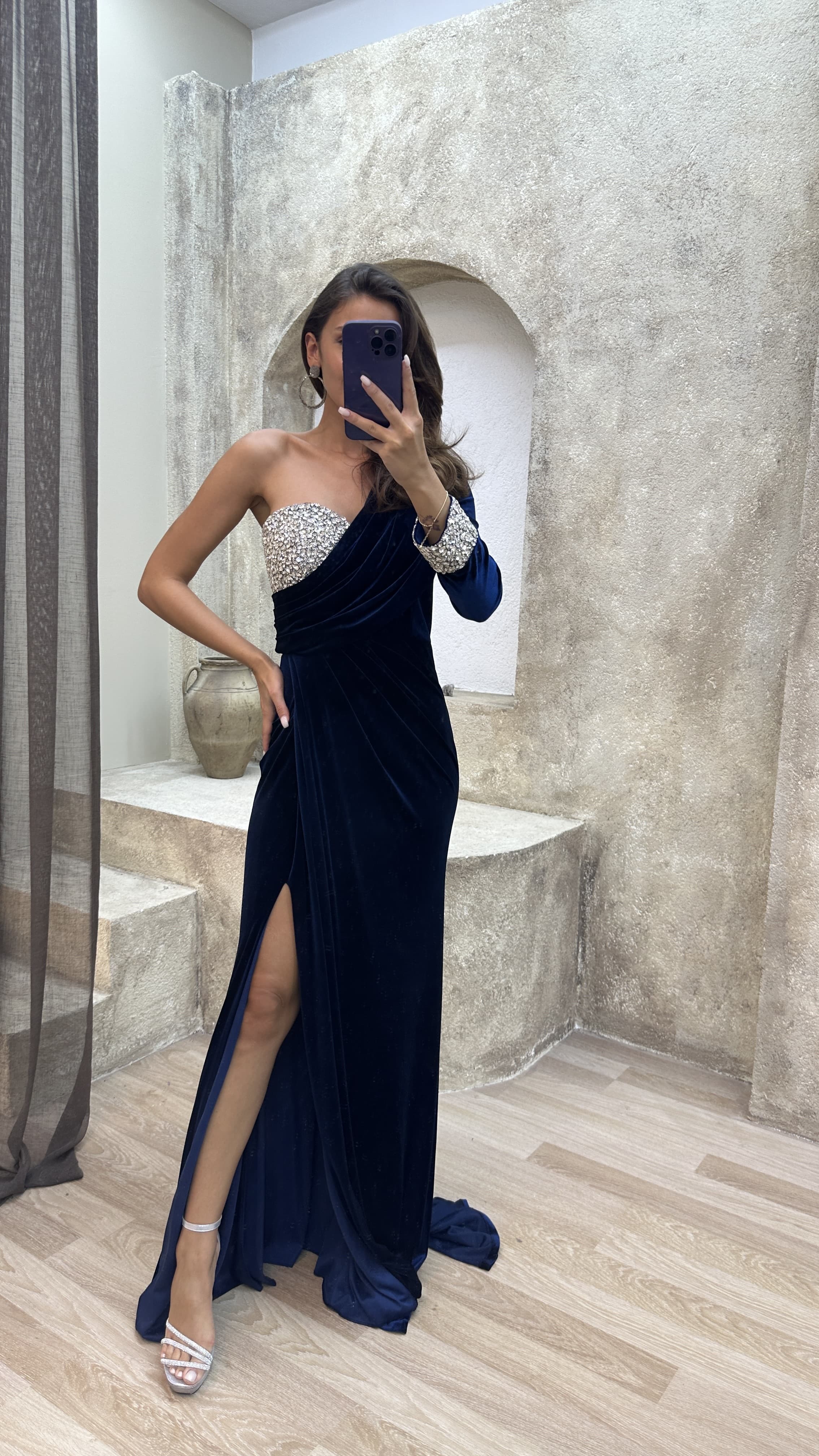 Lacivert Tek Omuz Göğsü İşlemeli Elbise