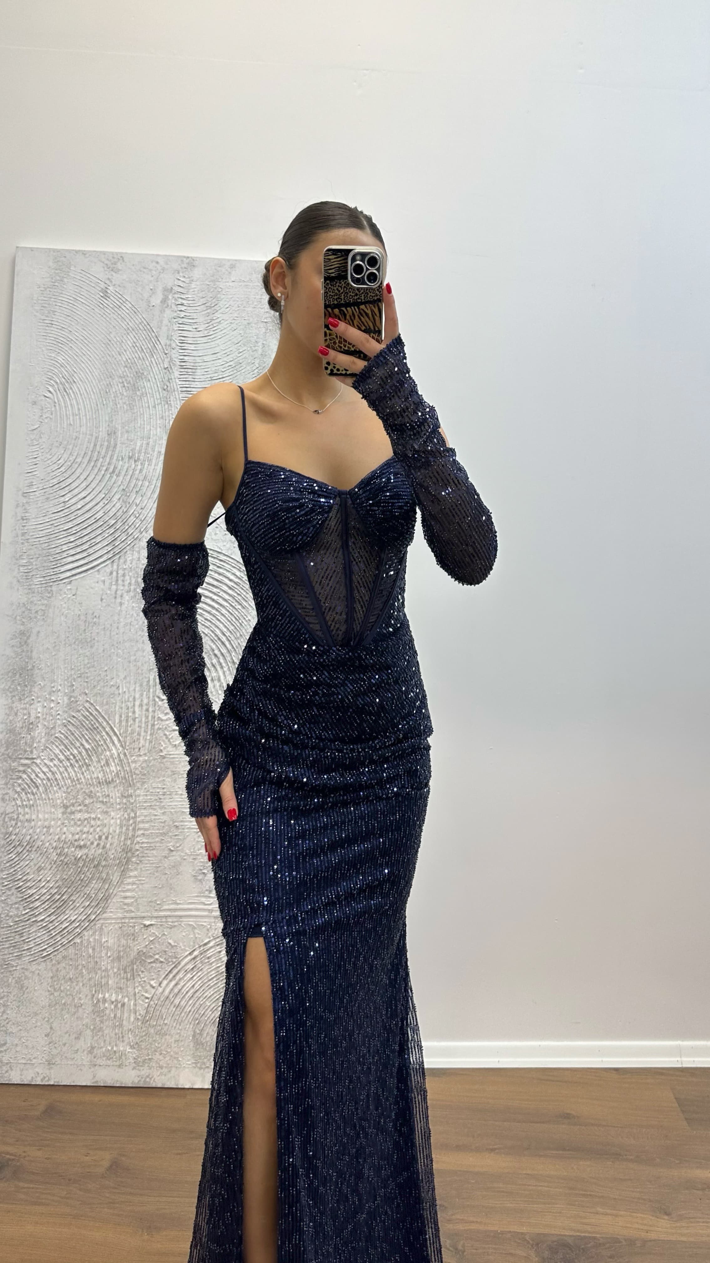 • Lacivert Transparan Detay Pullu Abiye Elbise