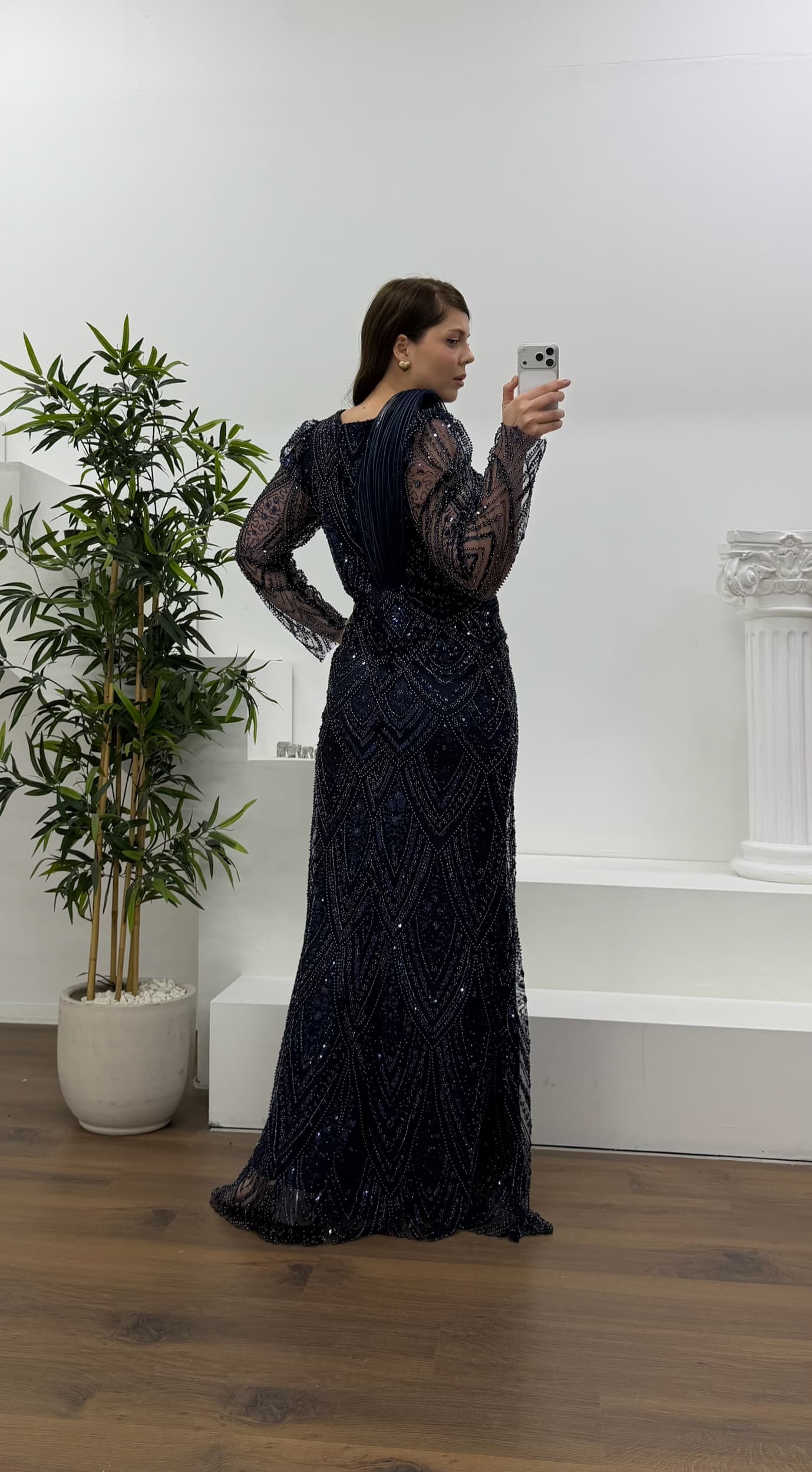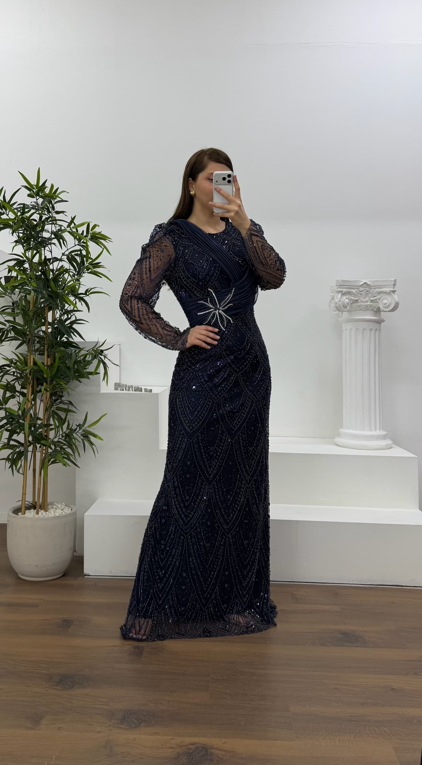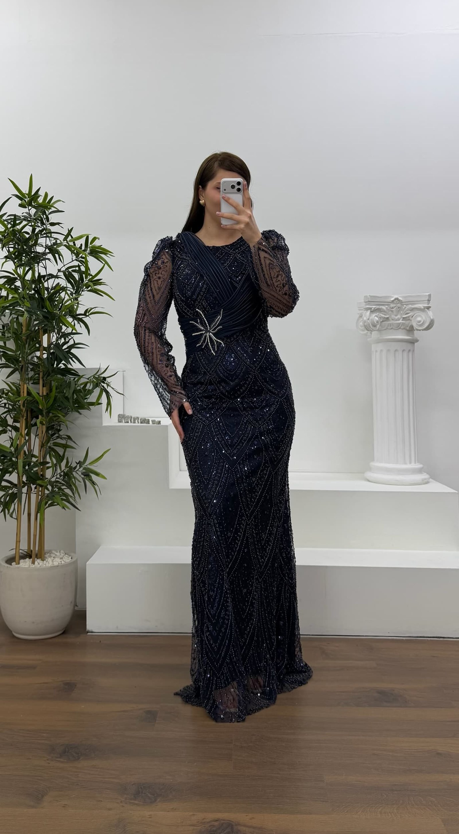 • Lacivert Yıldız Boncuk İşlemeli Kolları Tül  Detaylı Büyük Beden Abiye Elbise