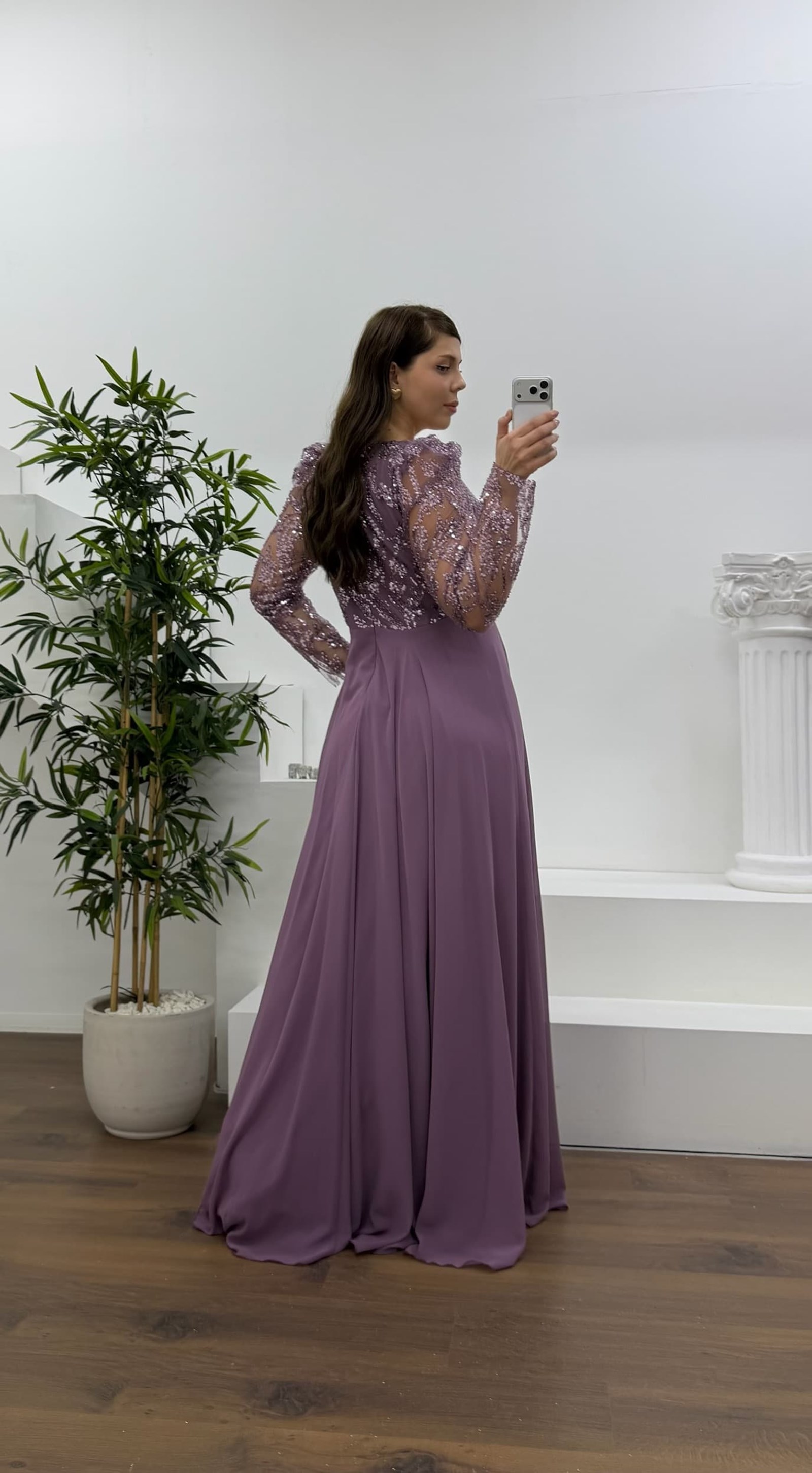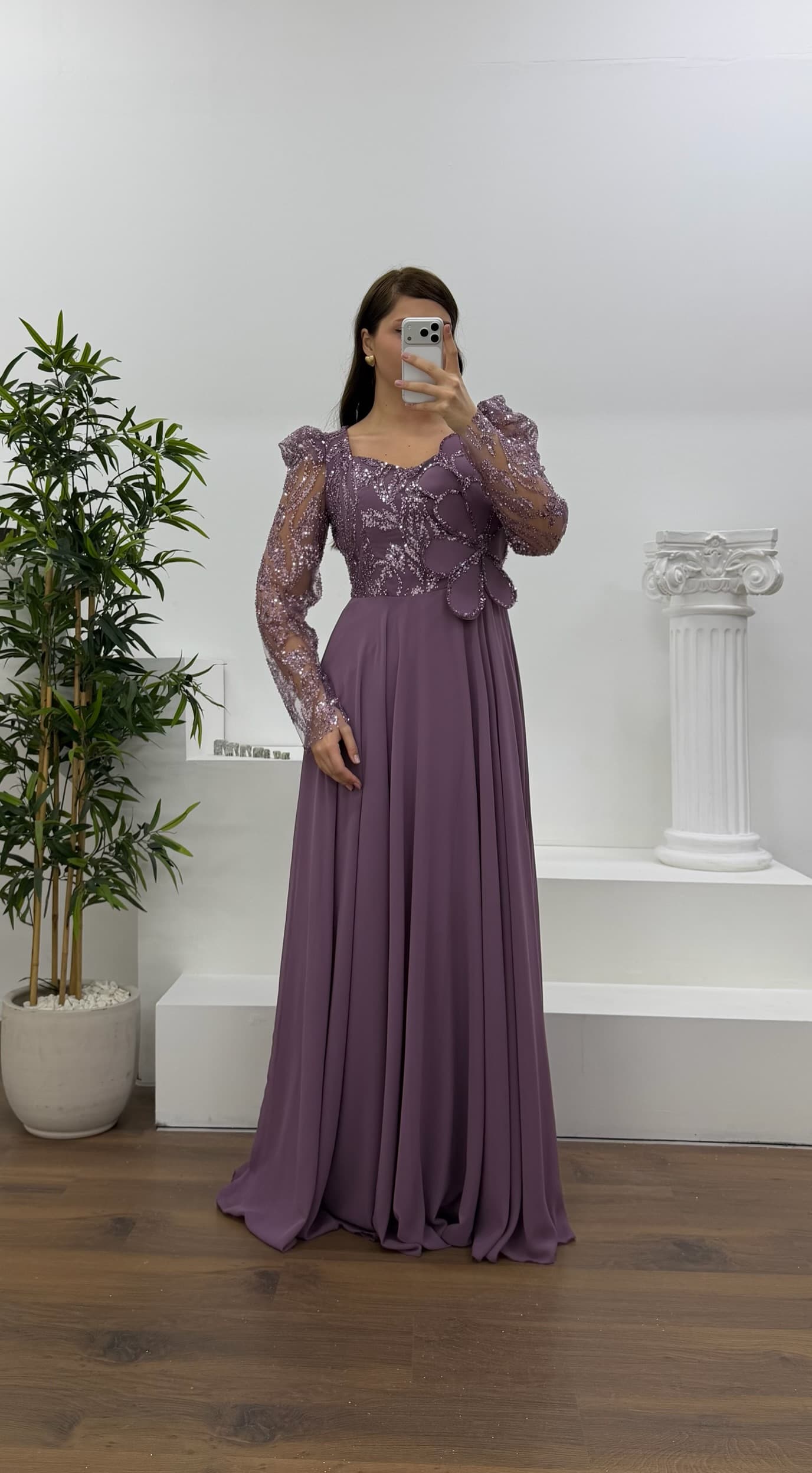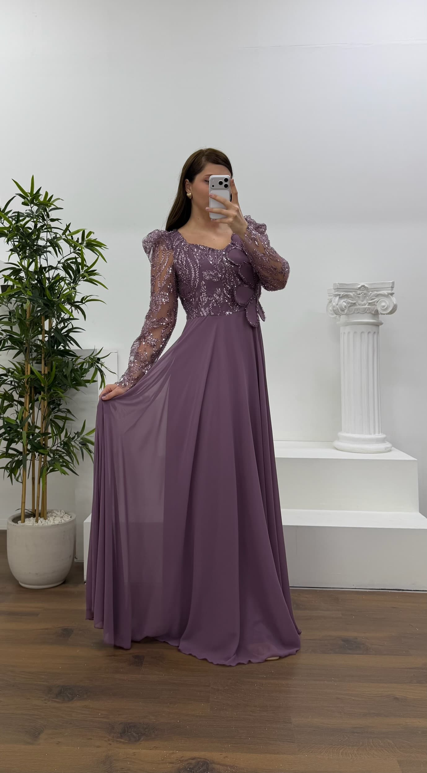 • Lila Beli Çiçek Detay Şifon  Büyük Beden Abiye Elbise
