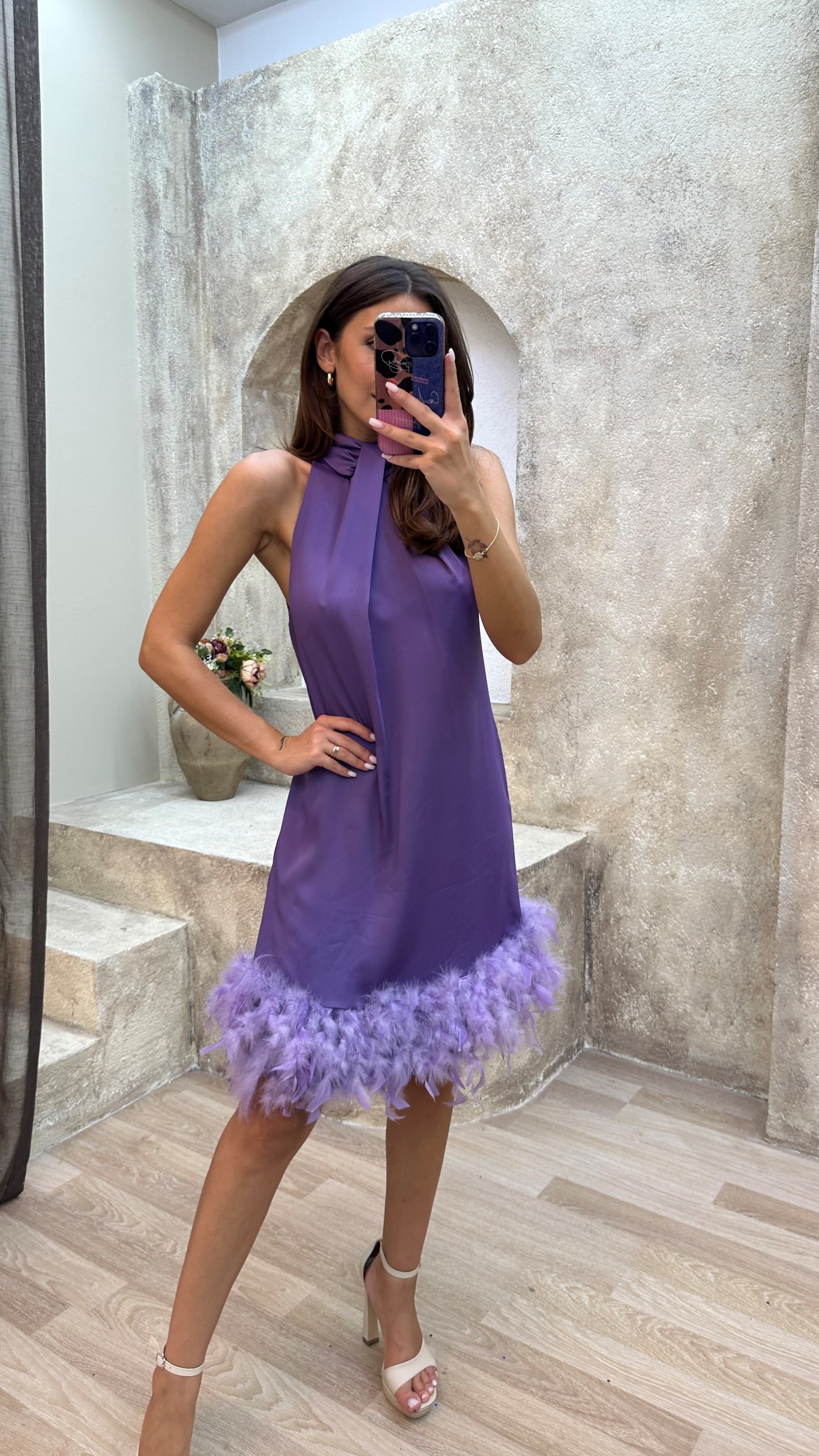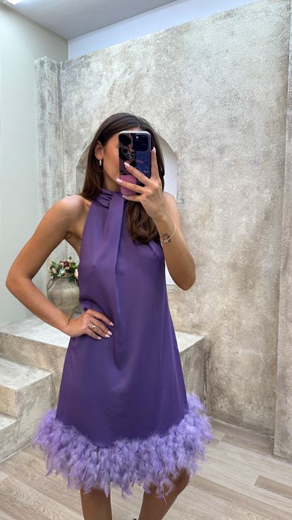 Lila Boyun Detay Tüy Detay Mini Elbise