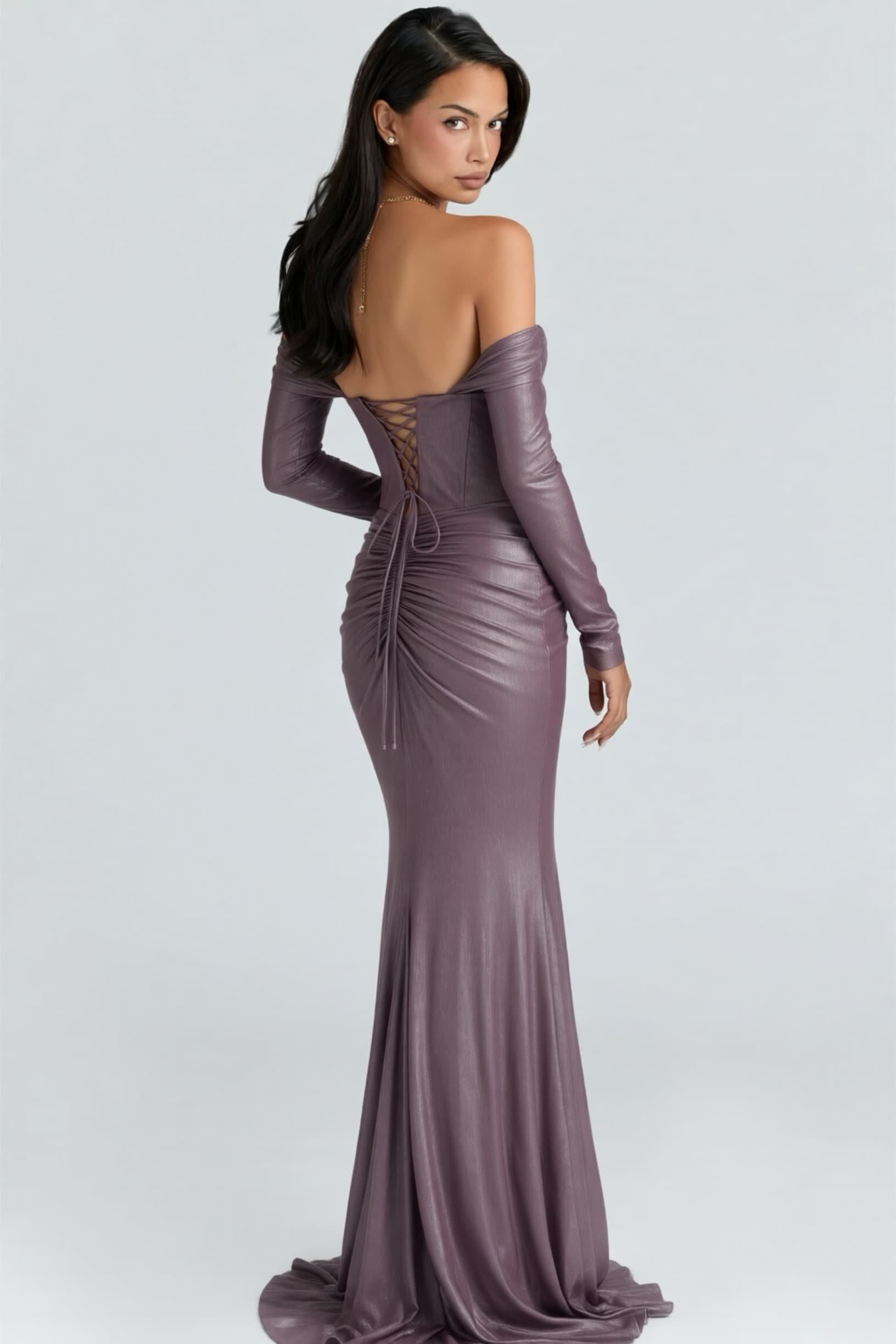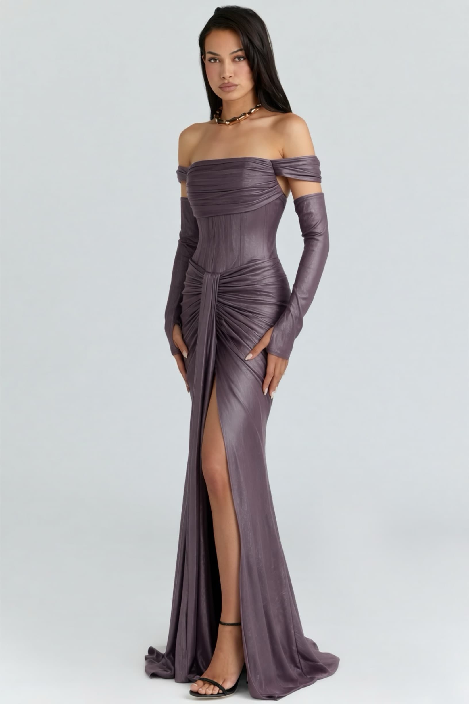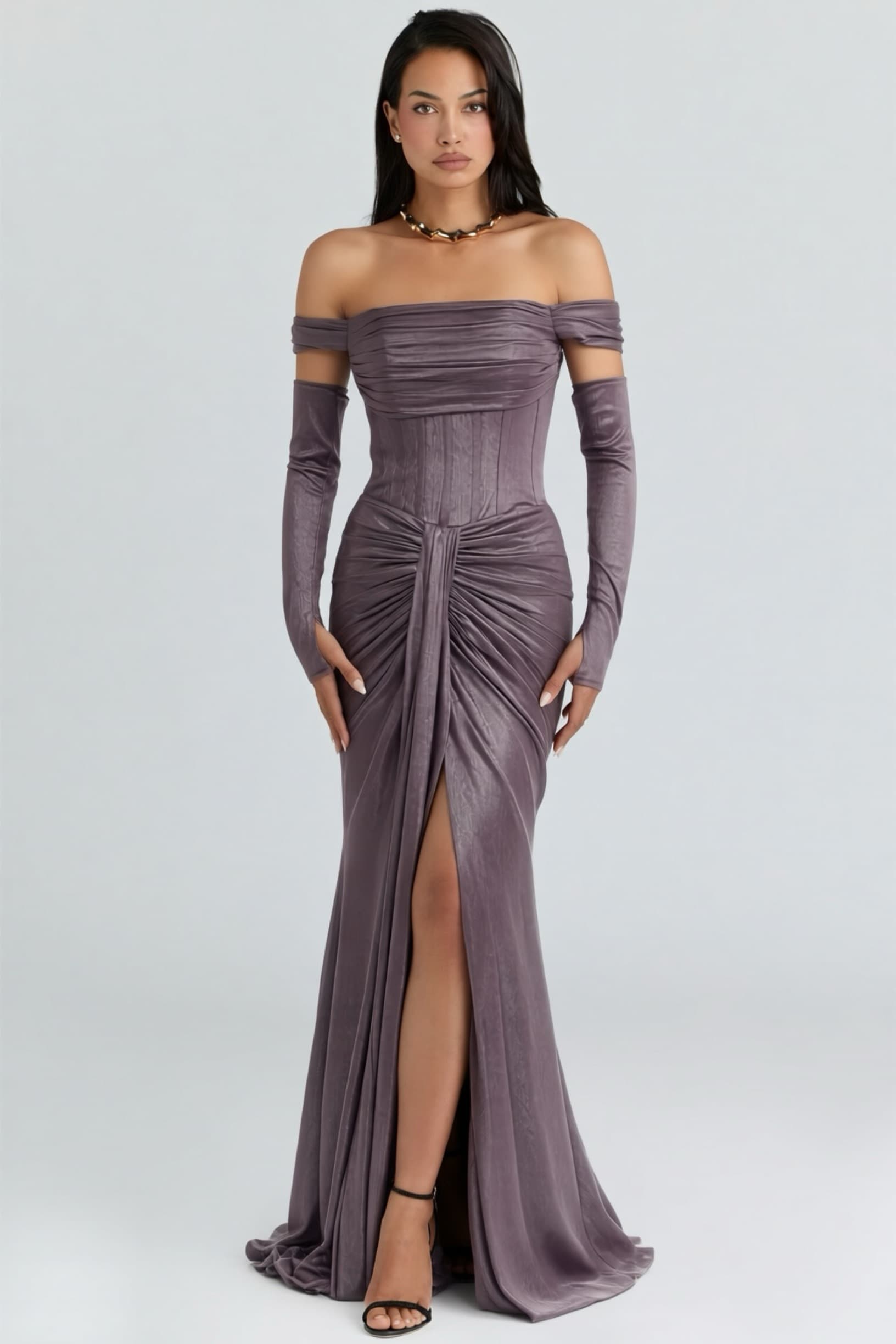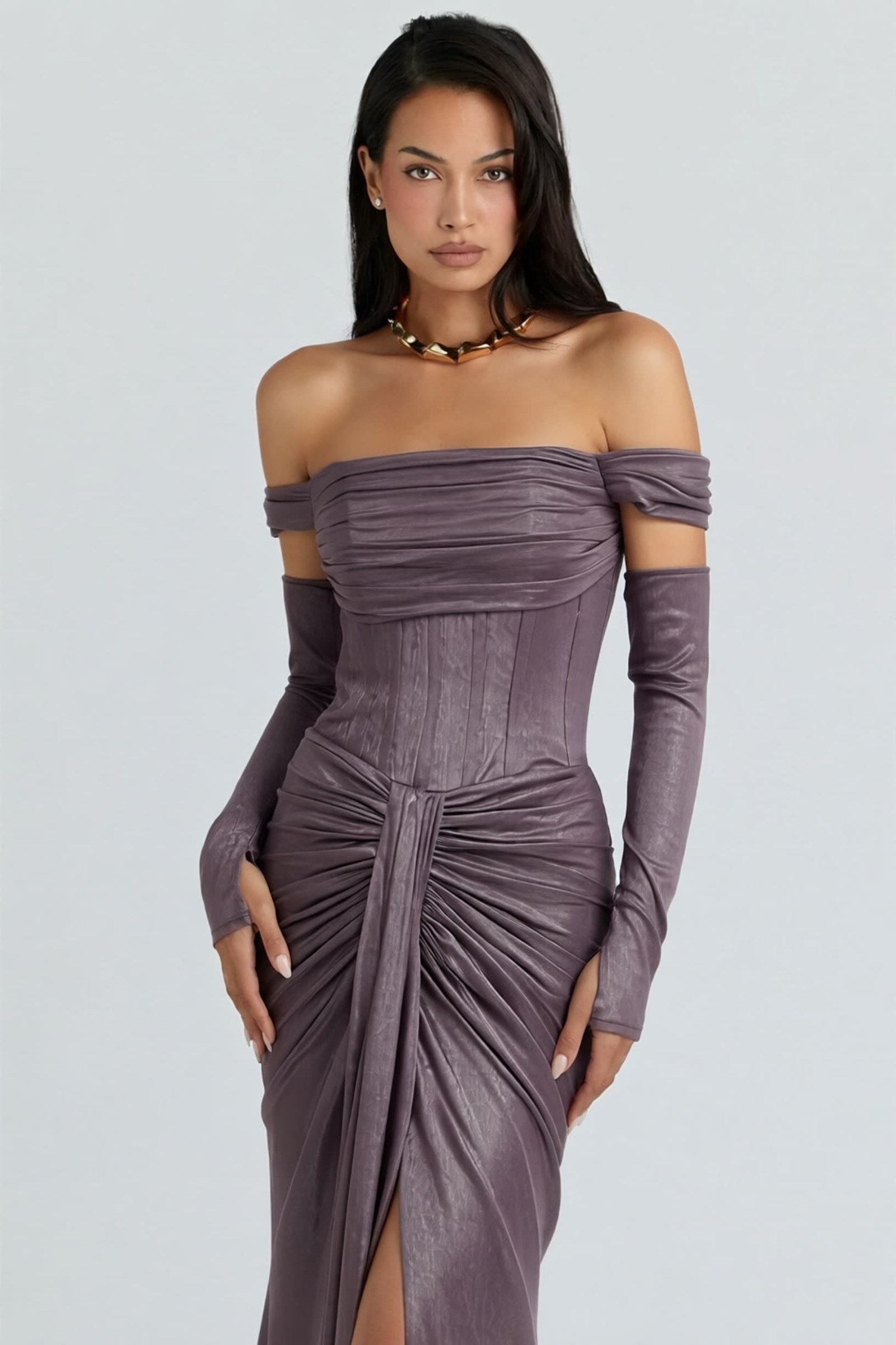 • Lila Eldiven Detaylı Abiye Elbise