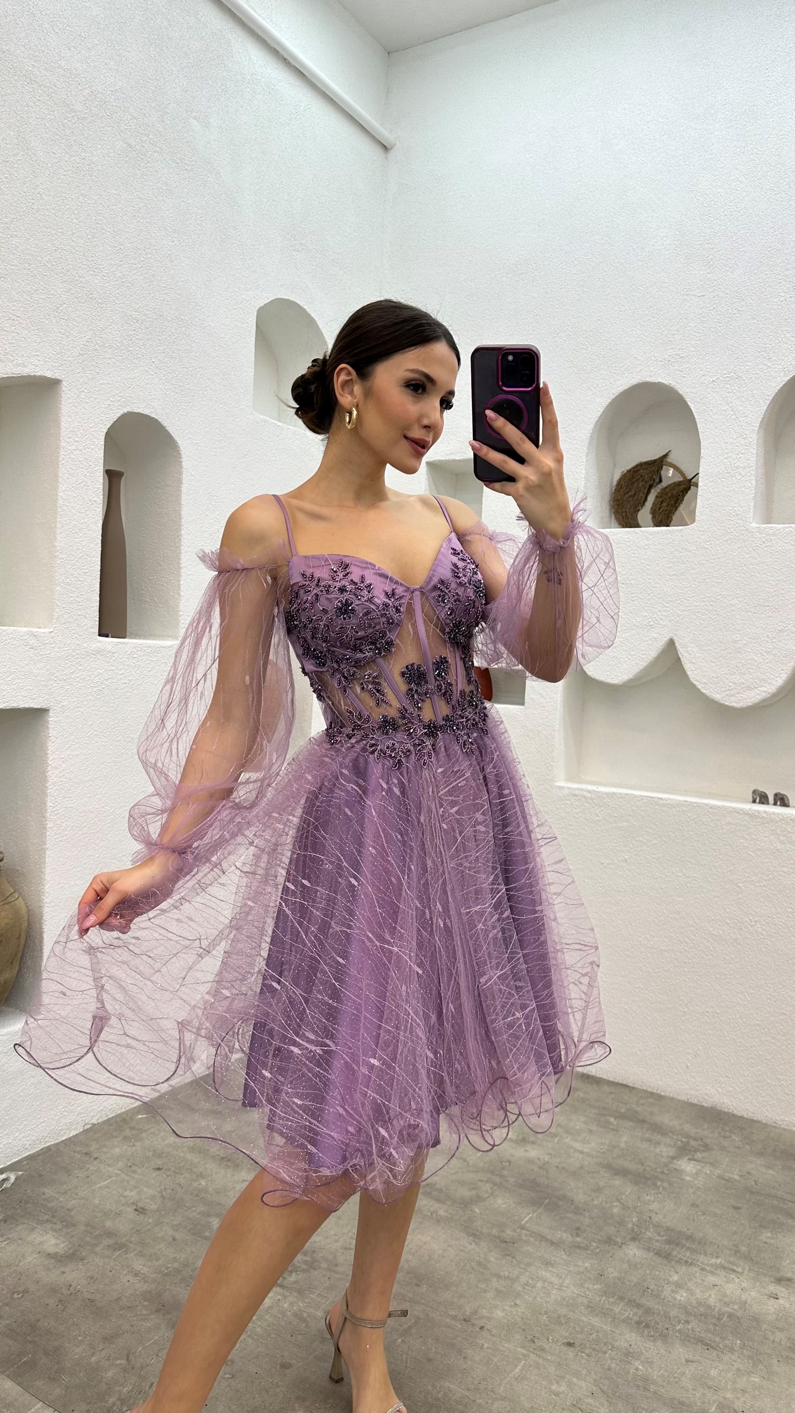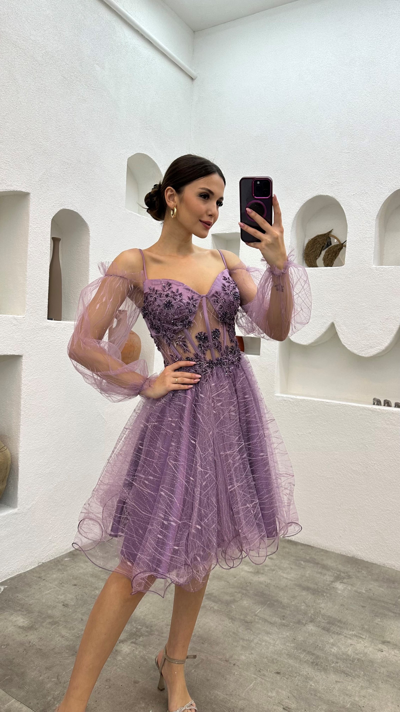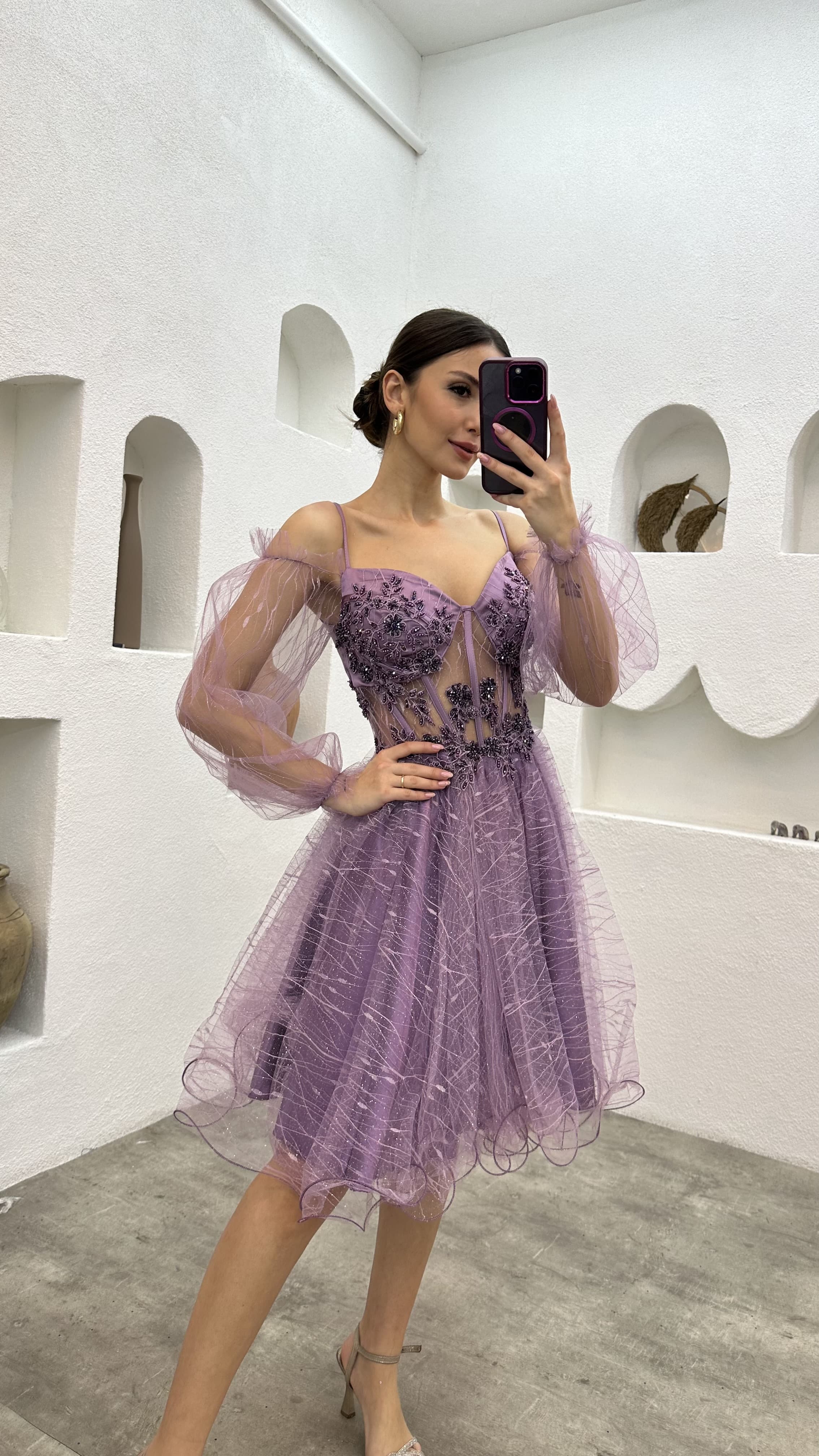 Lila Göğsü İşlemeli Mini Tül Abiye Elbise