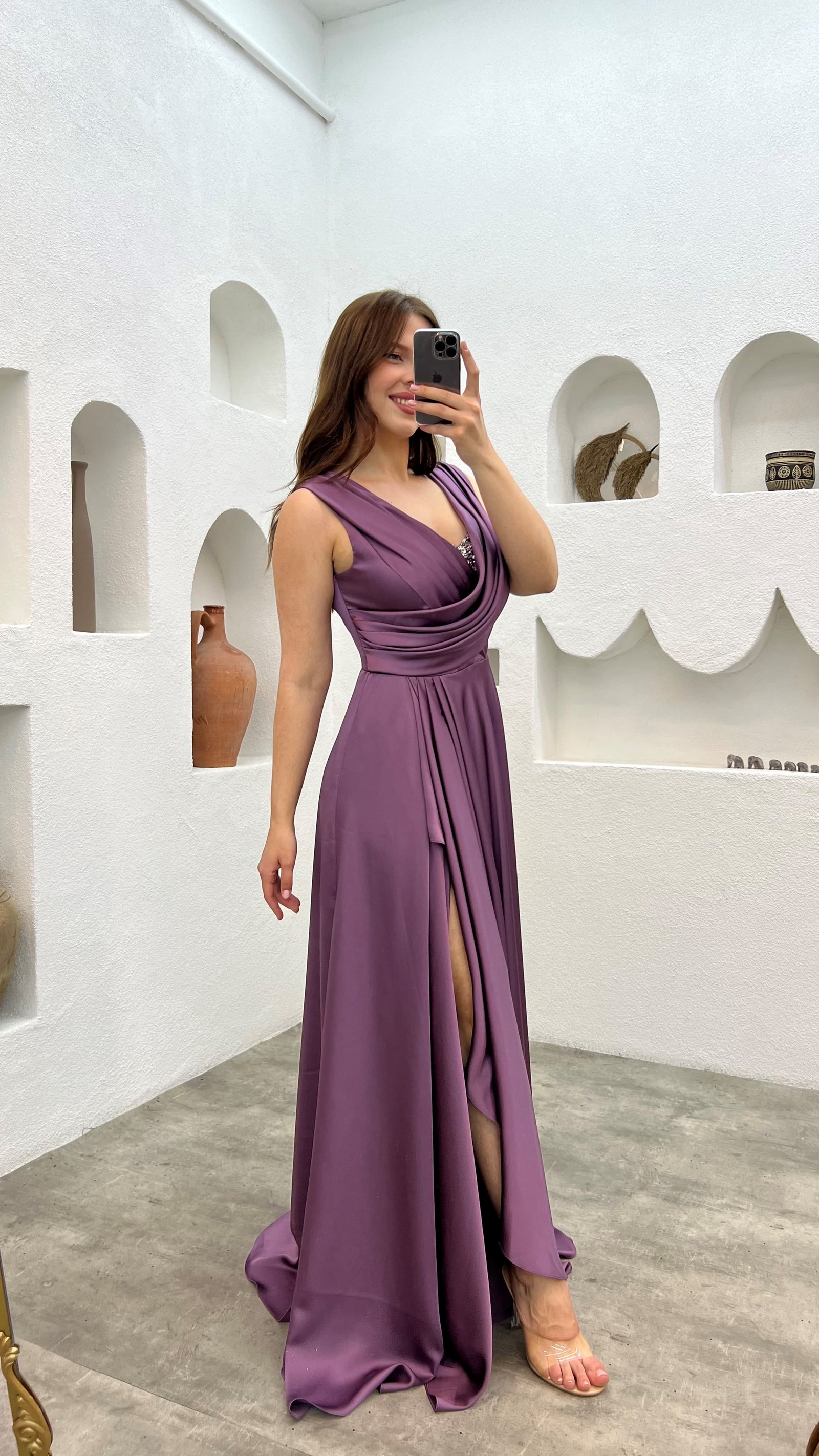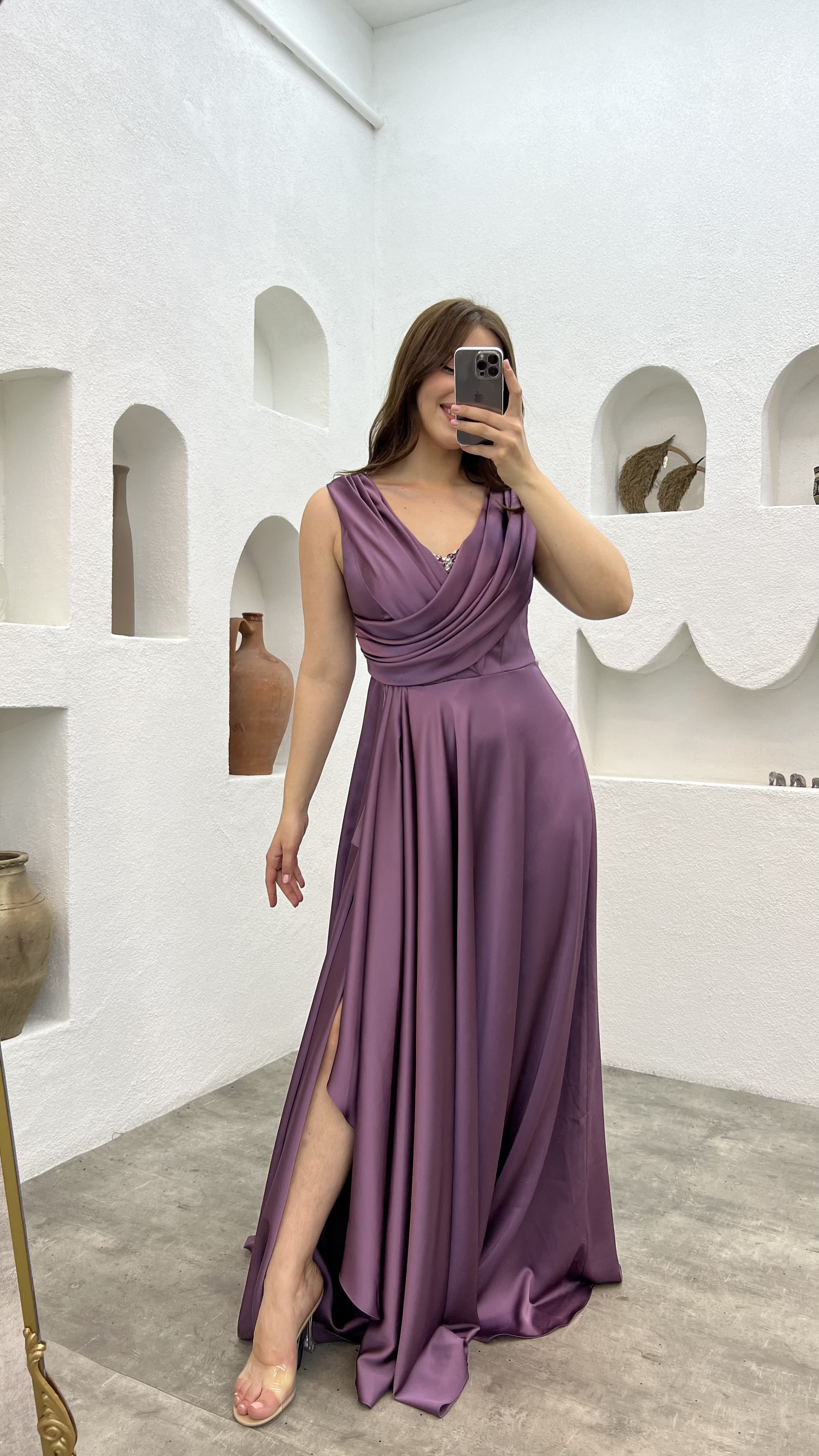 Lila Gögsü İşlemeli Volanlı Saten Büyük Beden Abiye Elbise