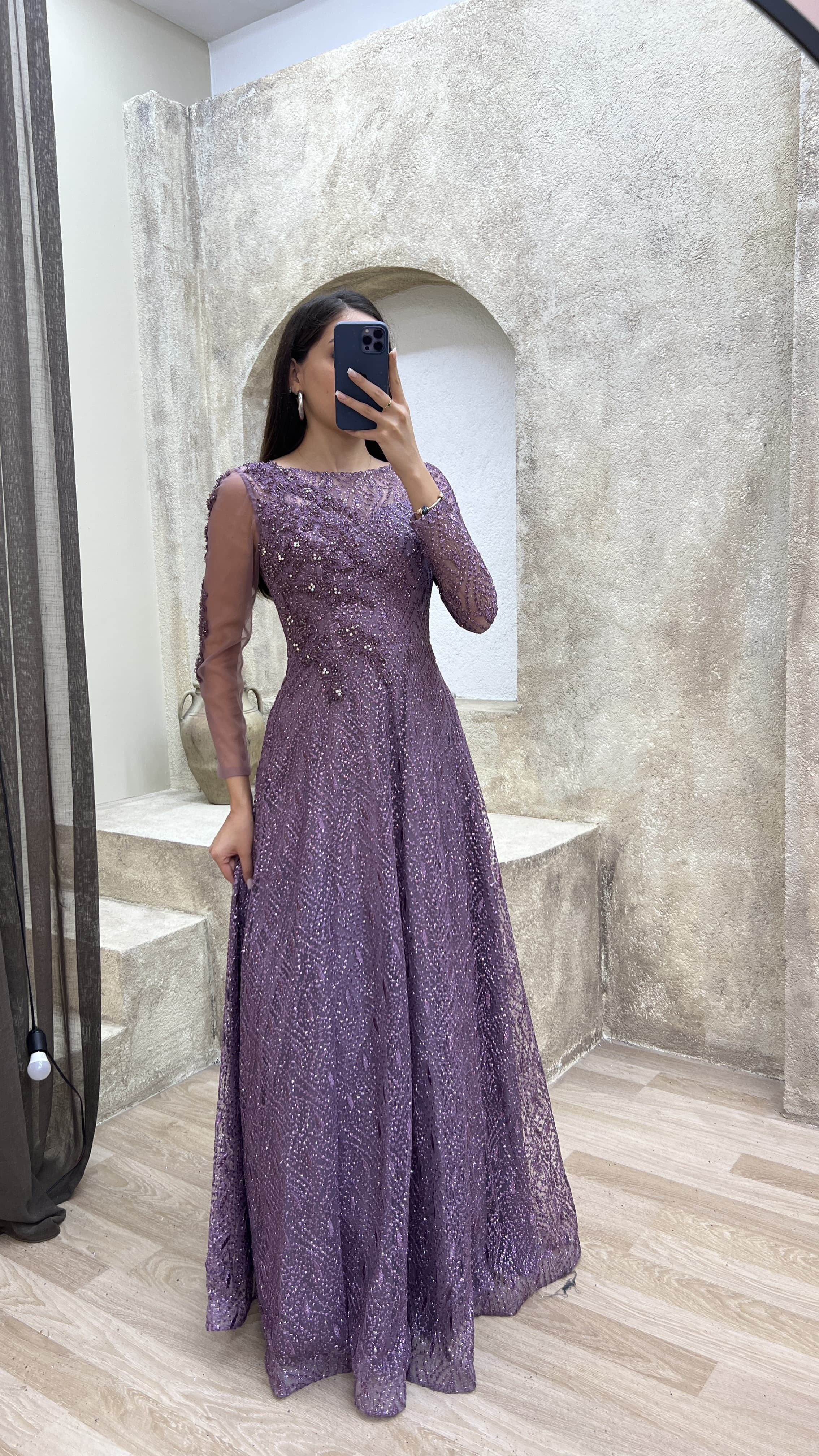 Lila Göğüs Detay Taş İşlemeli Tasarım Abiye Elbise