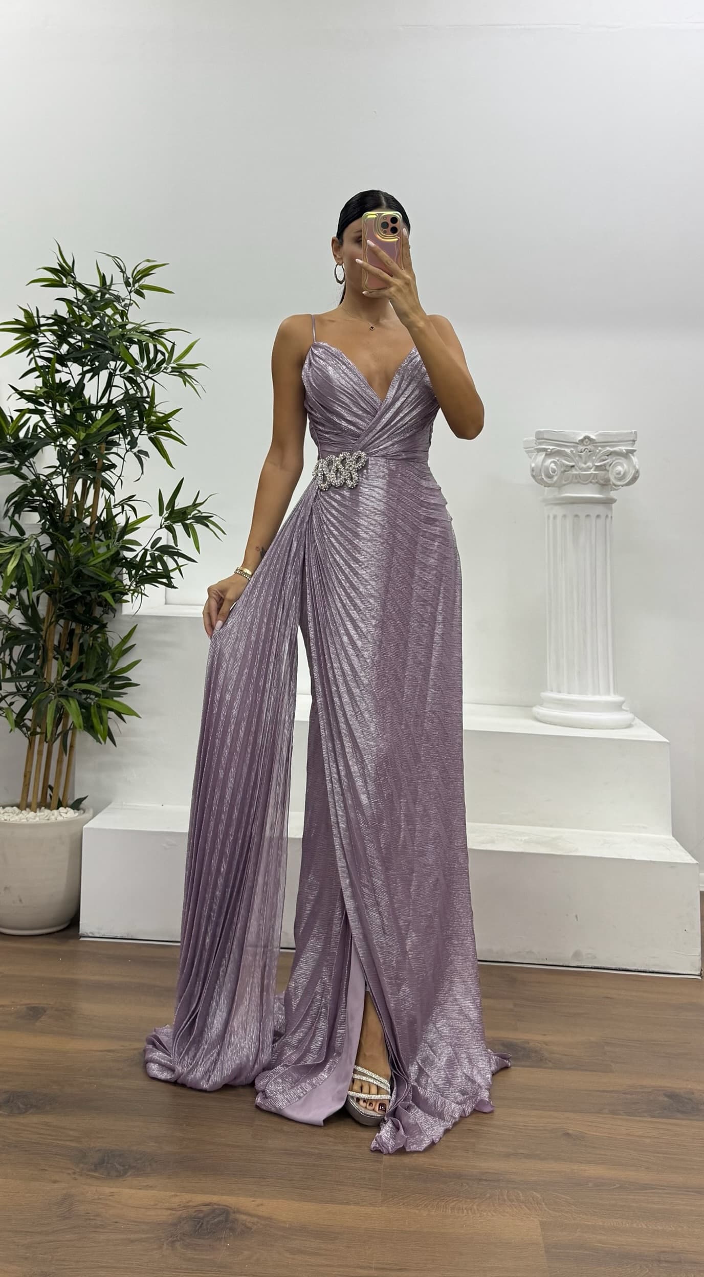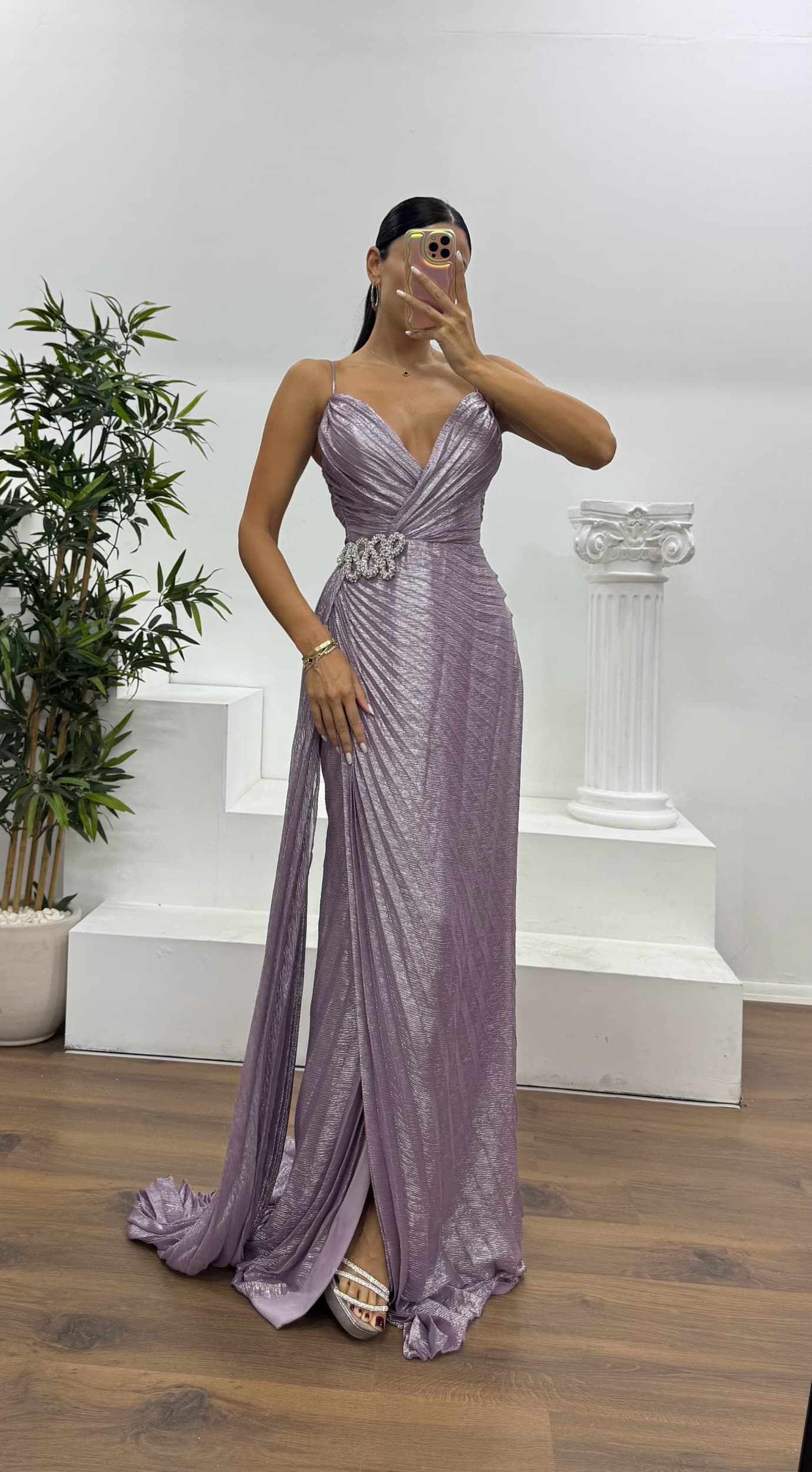 • Lila İp Askılı Bel Detay Abiye Elbise