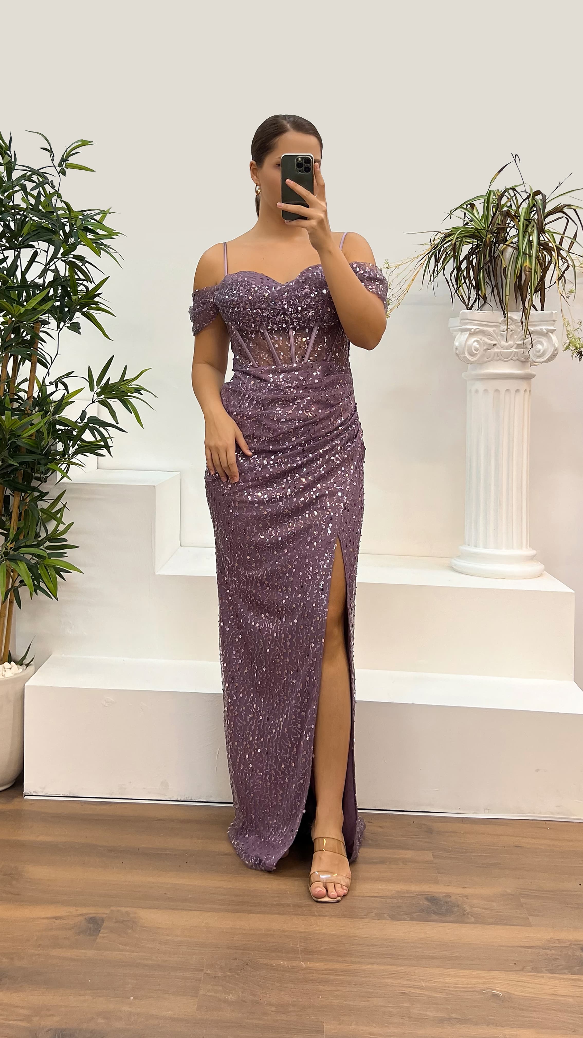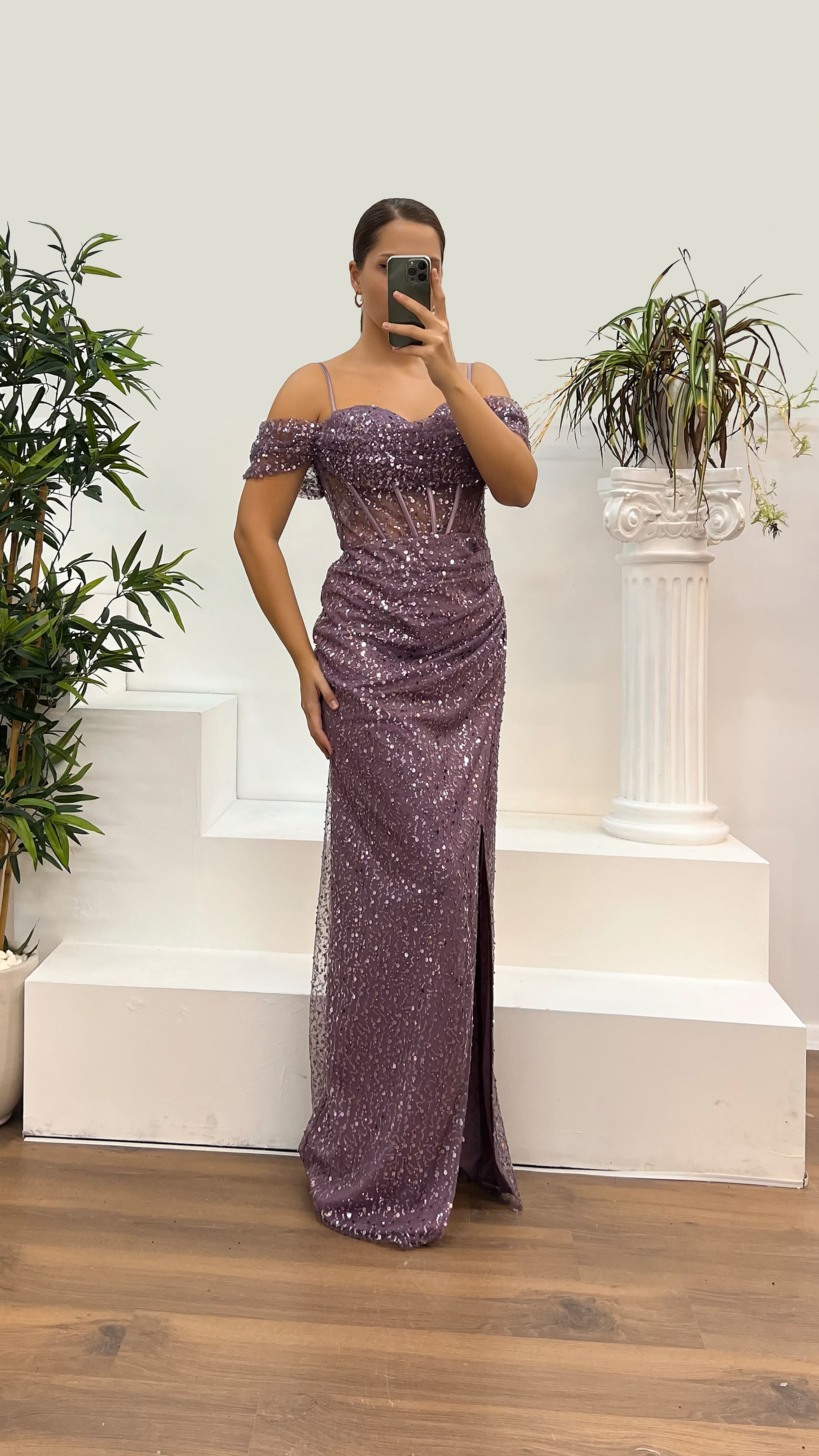 Lila İp Askılı Büyük Beden Pul Payet Abiye Elbise
