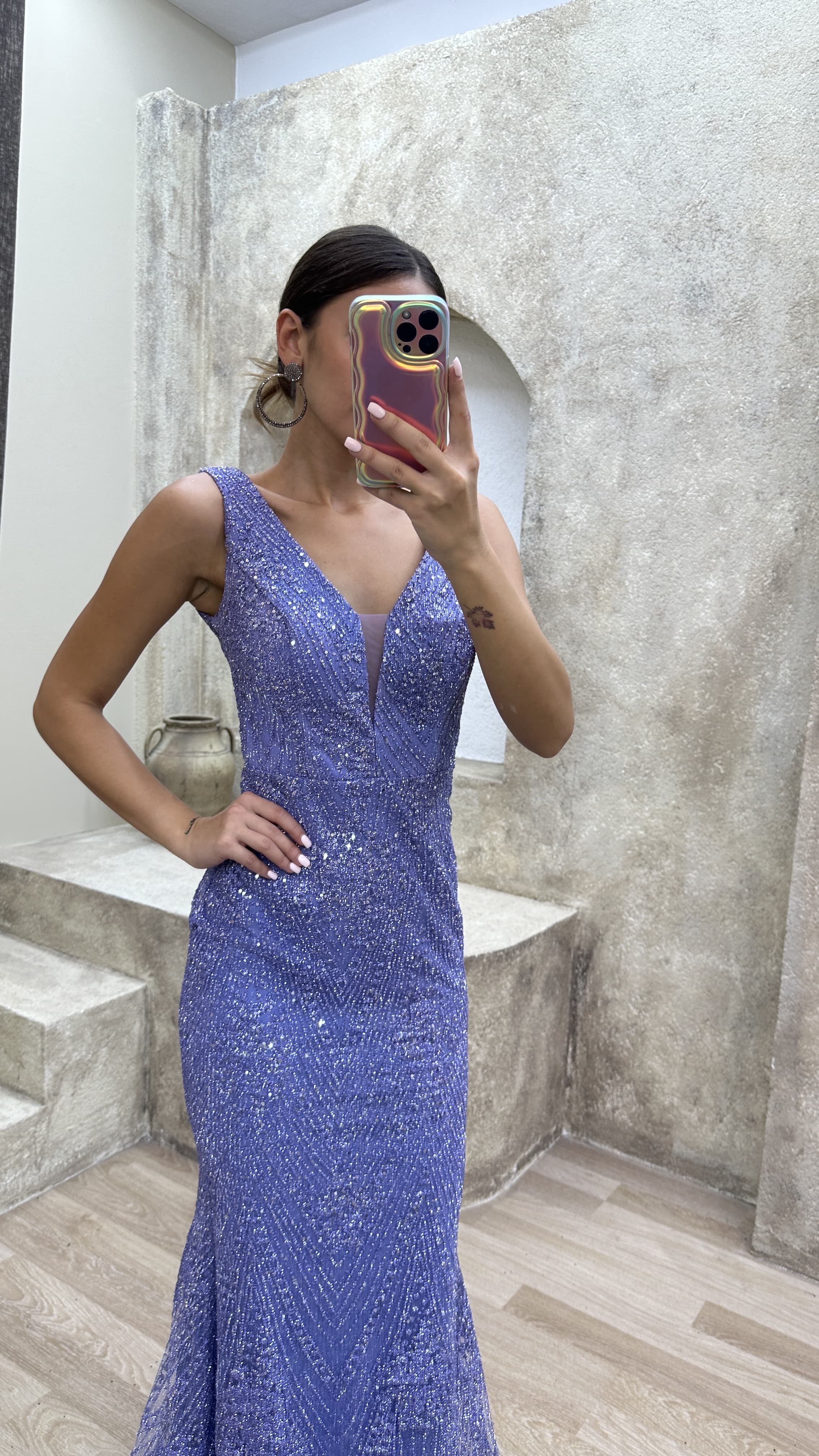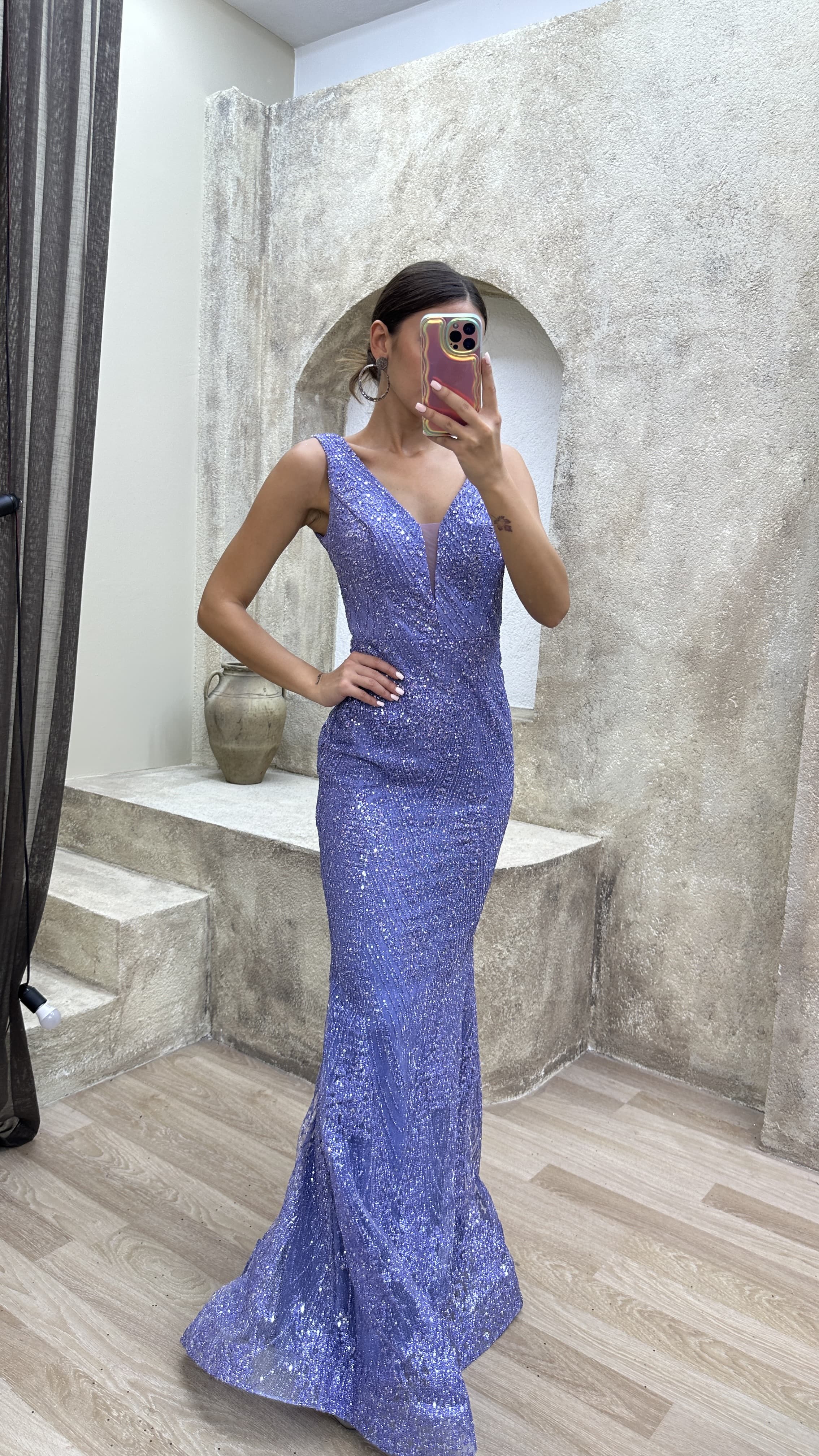 • Lila Kalp Yaka Tasarım Pul Payet Abiye Elbise
