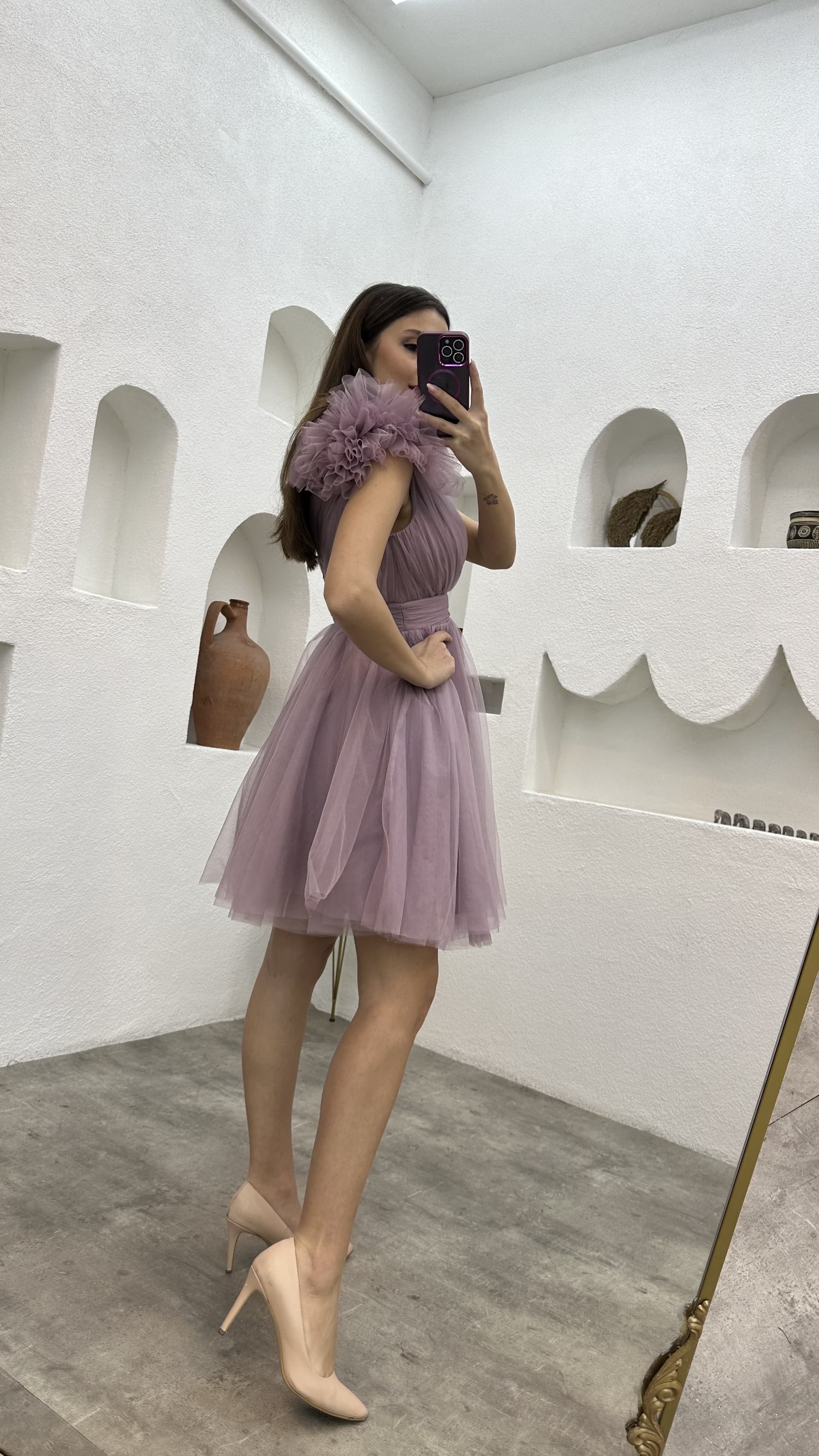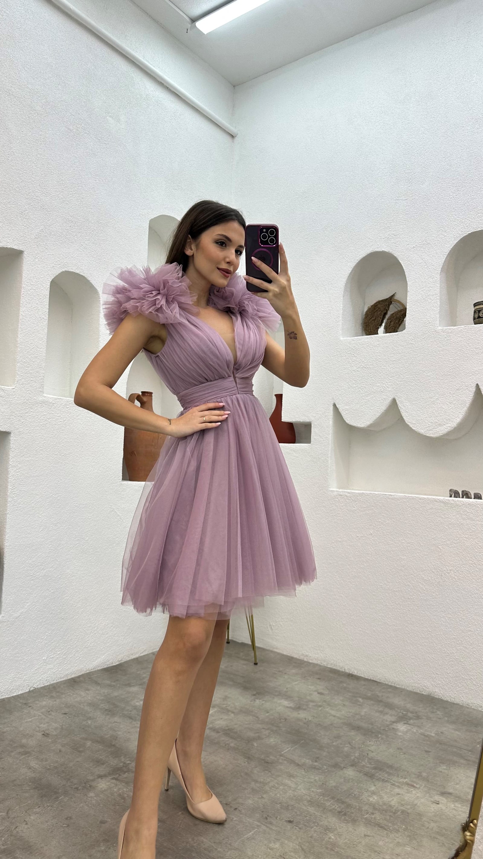 Lila Omuzları Volanlı Tül Abiye Elbise