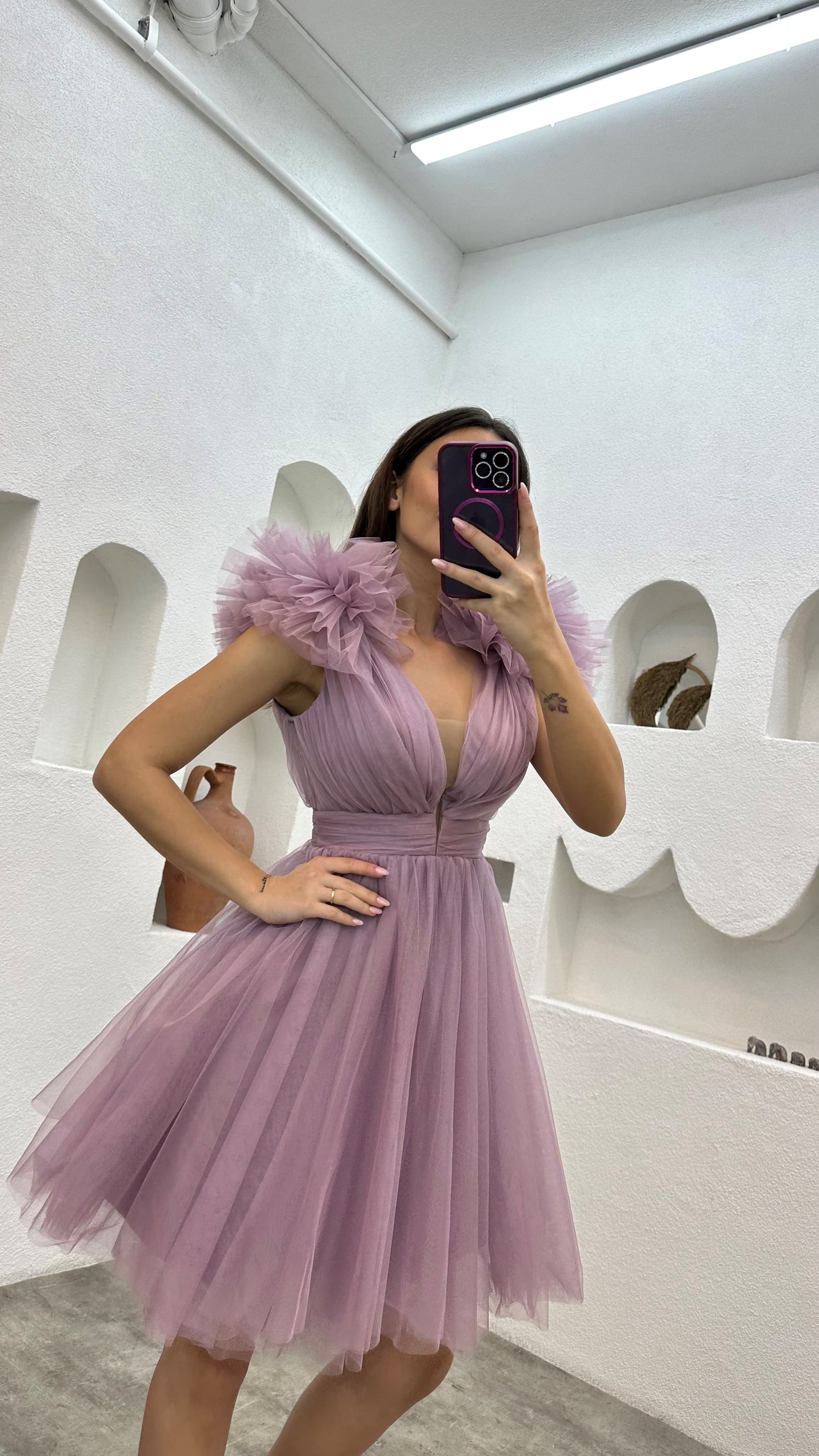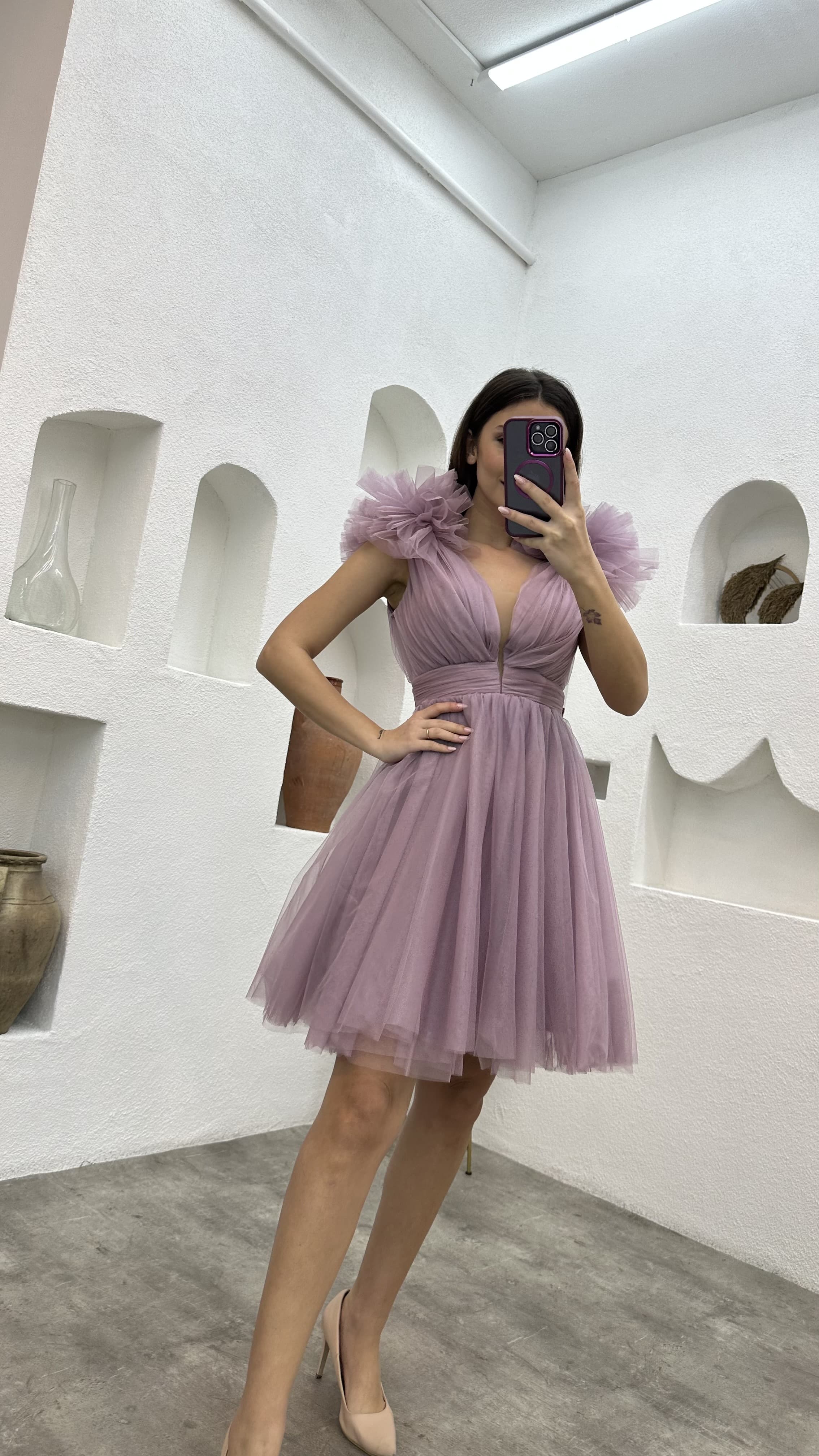 • Lila Omuzları Volanlı Tül Abiye Elbise