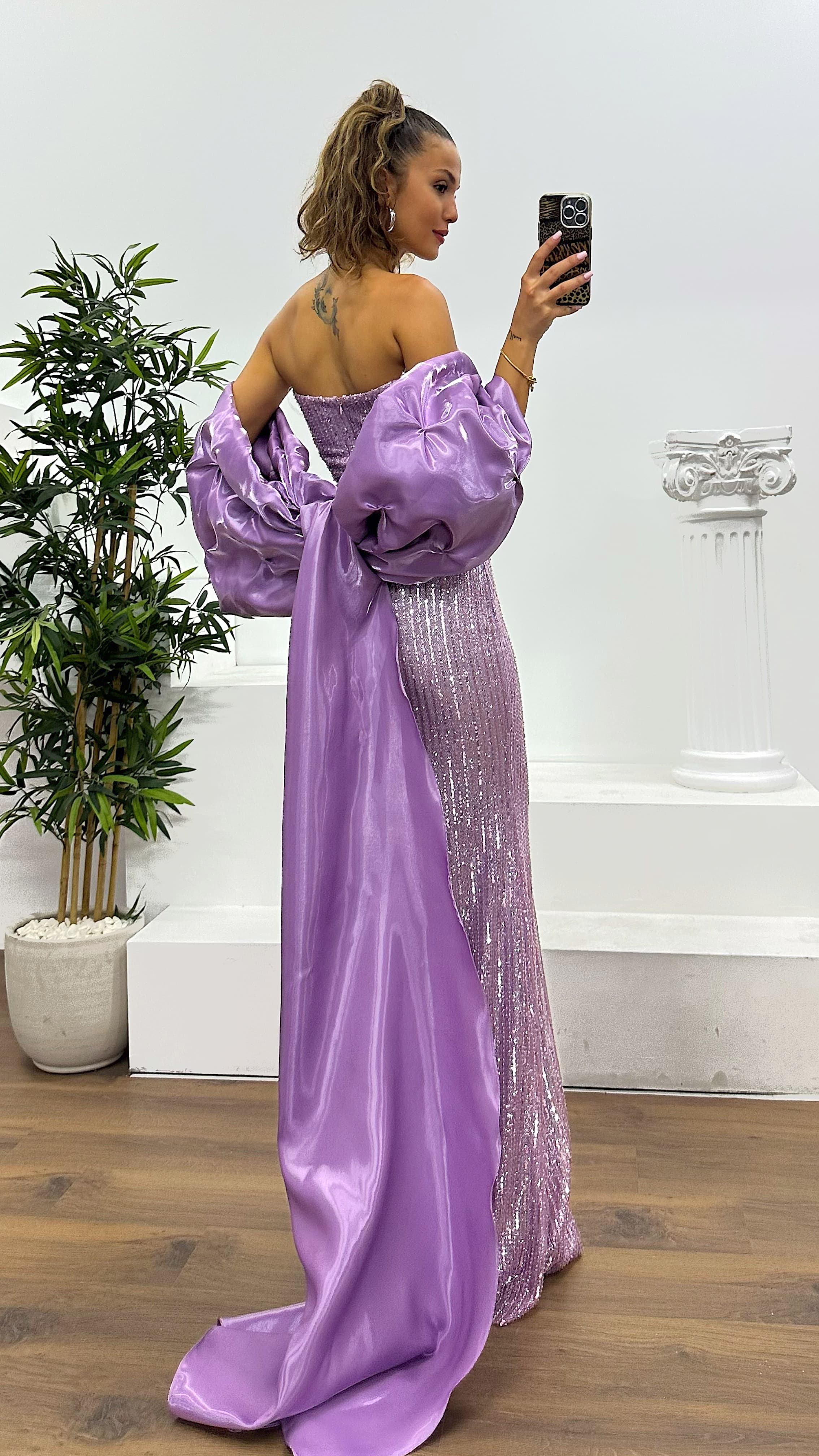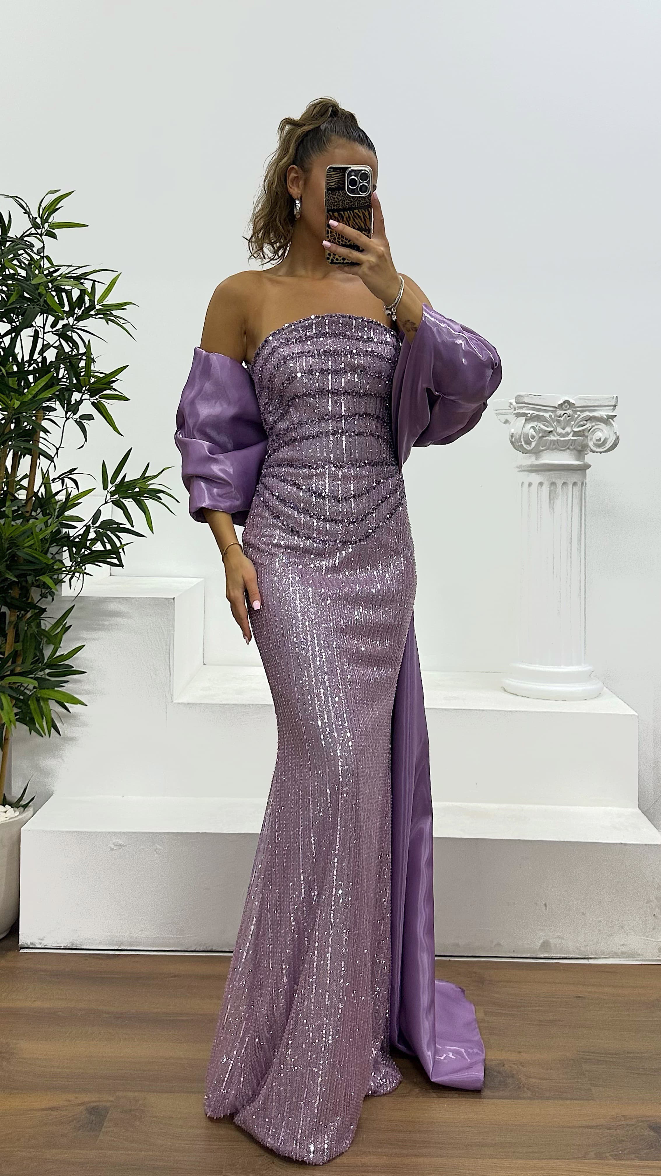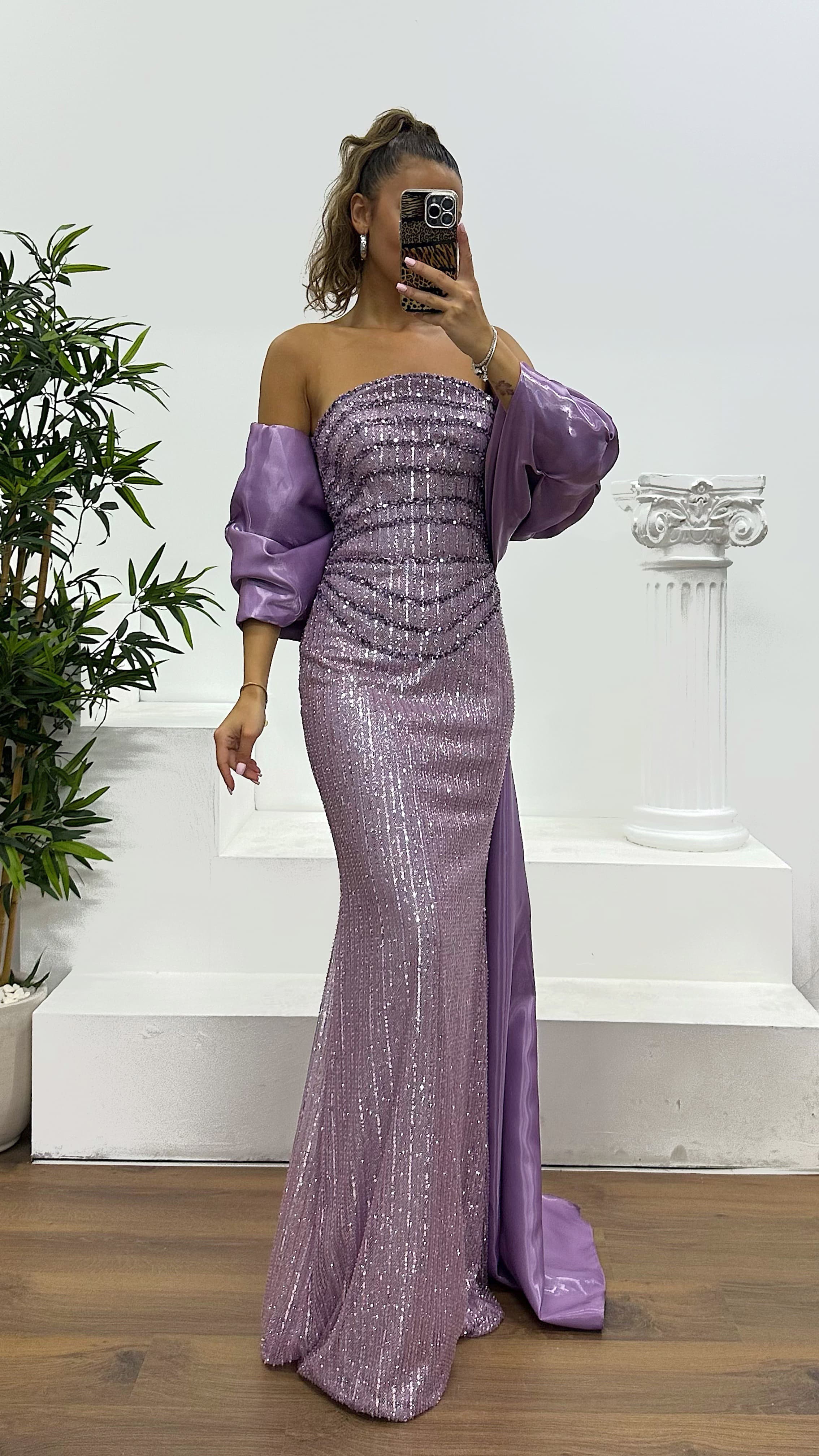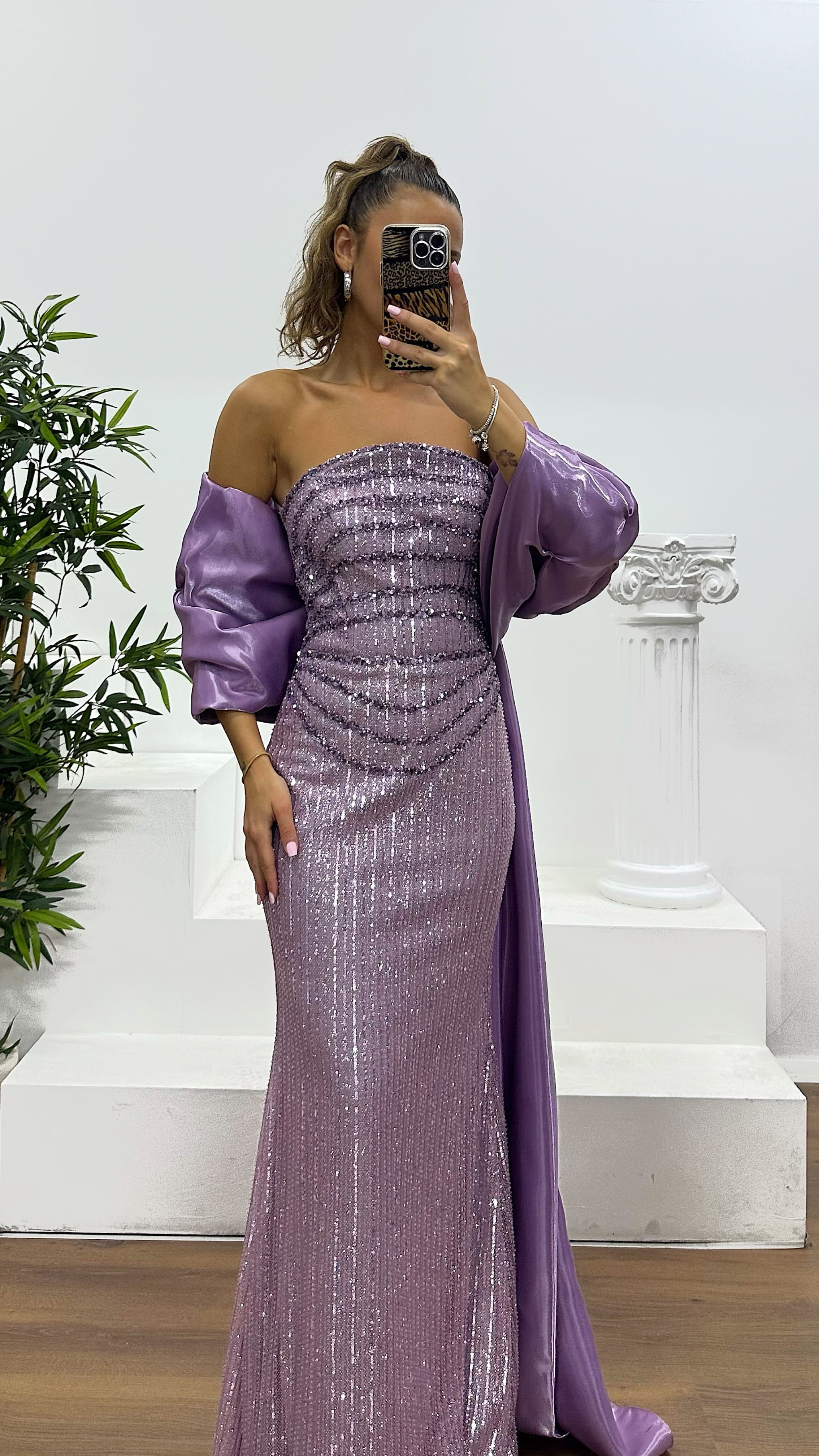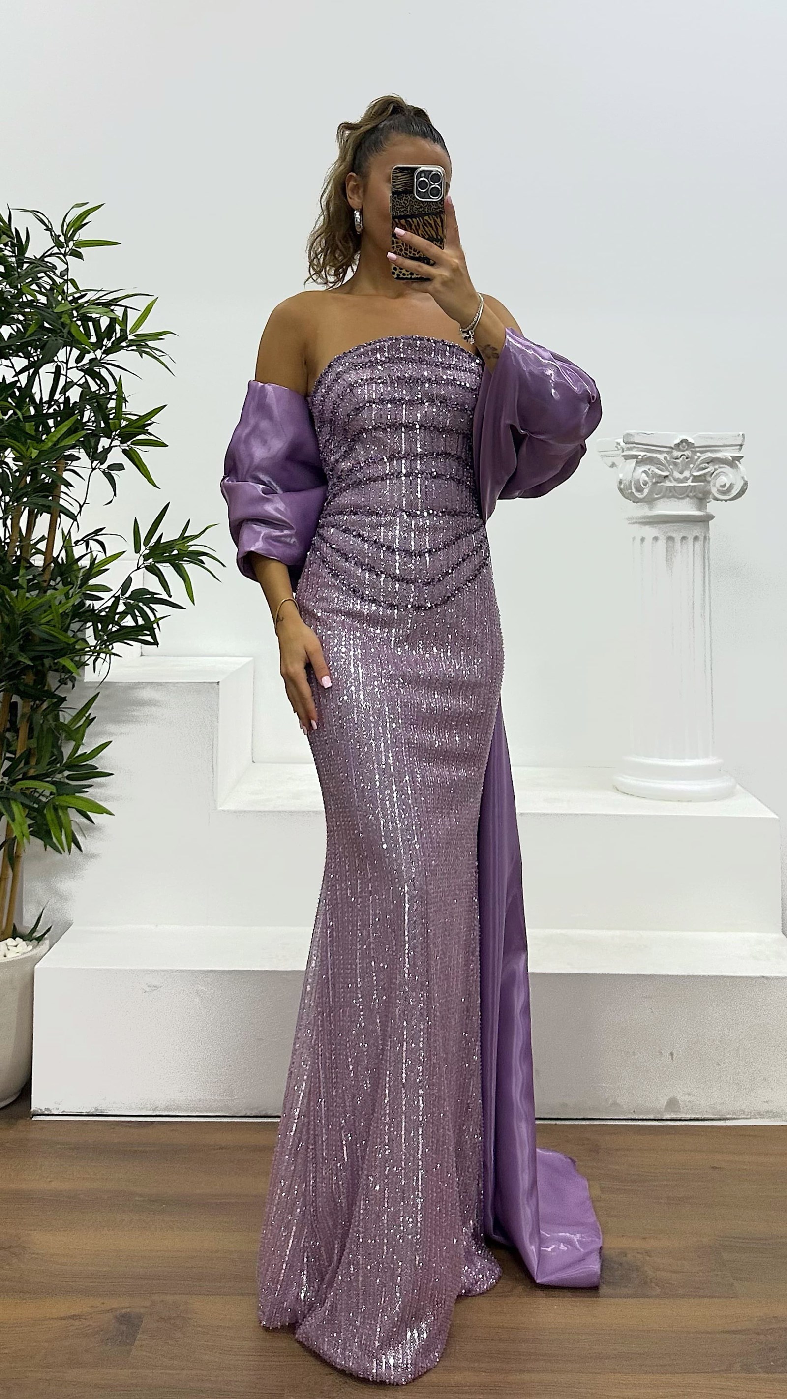 Ürün 36-42 bedene kadar uyumlu, göğüs pedli, astarlı, arka kapama fermuar, kol detay, işlemeli abiye olarak tasarlanmıştır.
