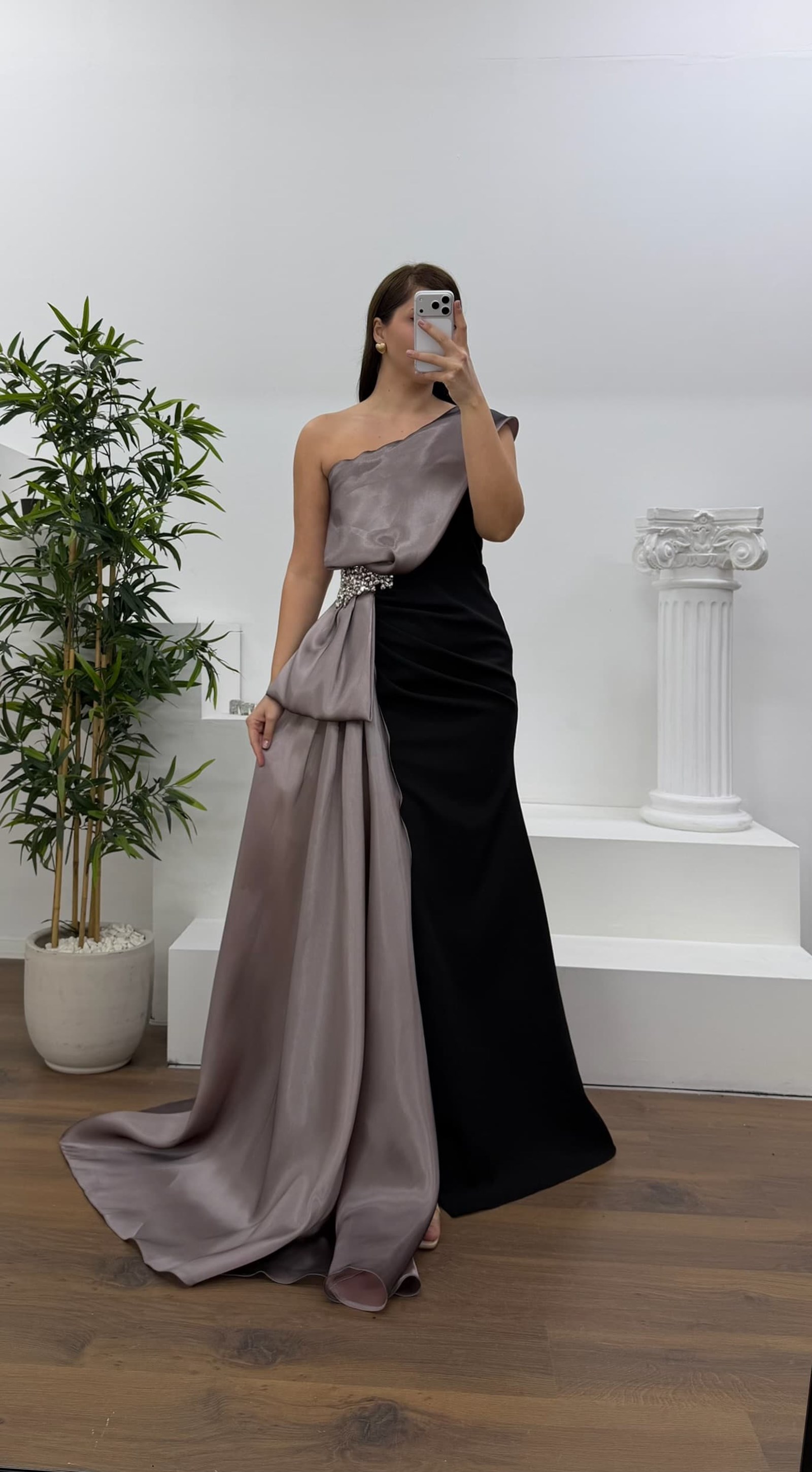 • Kahve Tek Omuz Taş Detay Büyük Beden Abiye Elbise