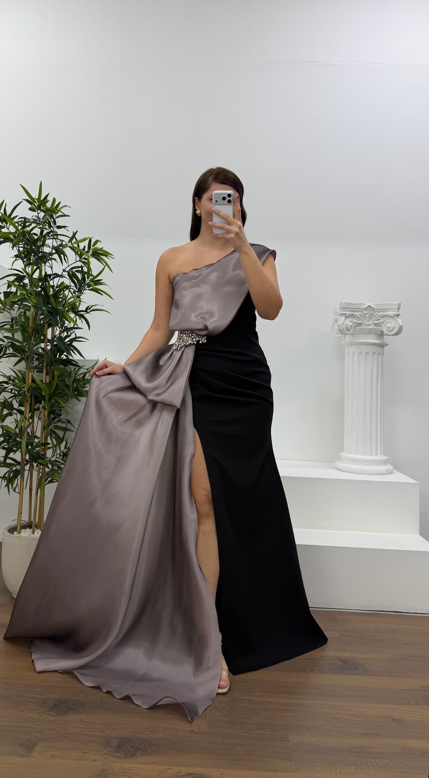 • Gümüş Tek Omuz Taş Detay Büyük Beden Abiye Elbise