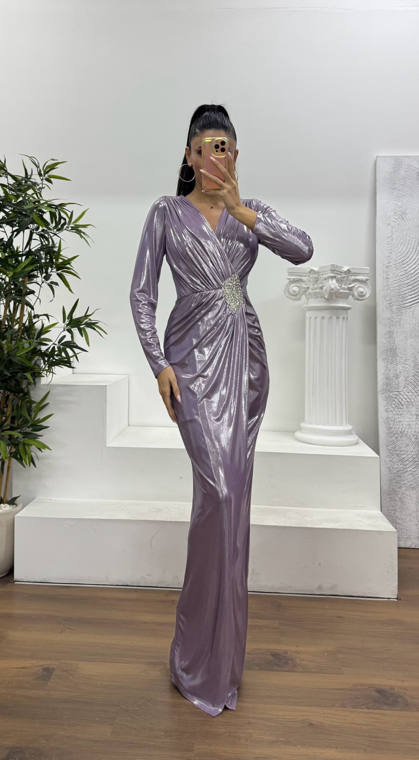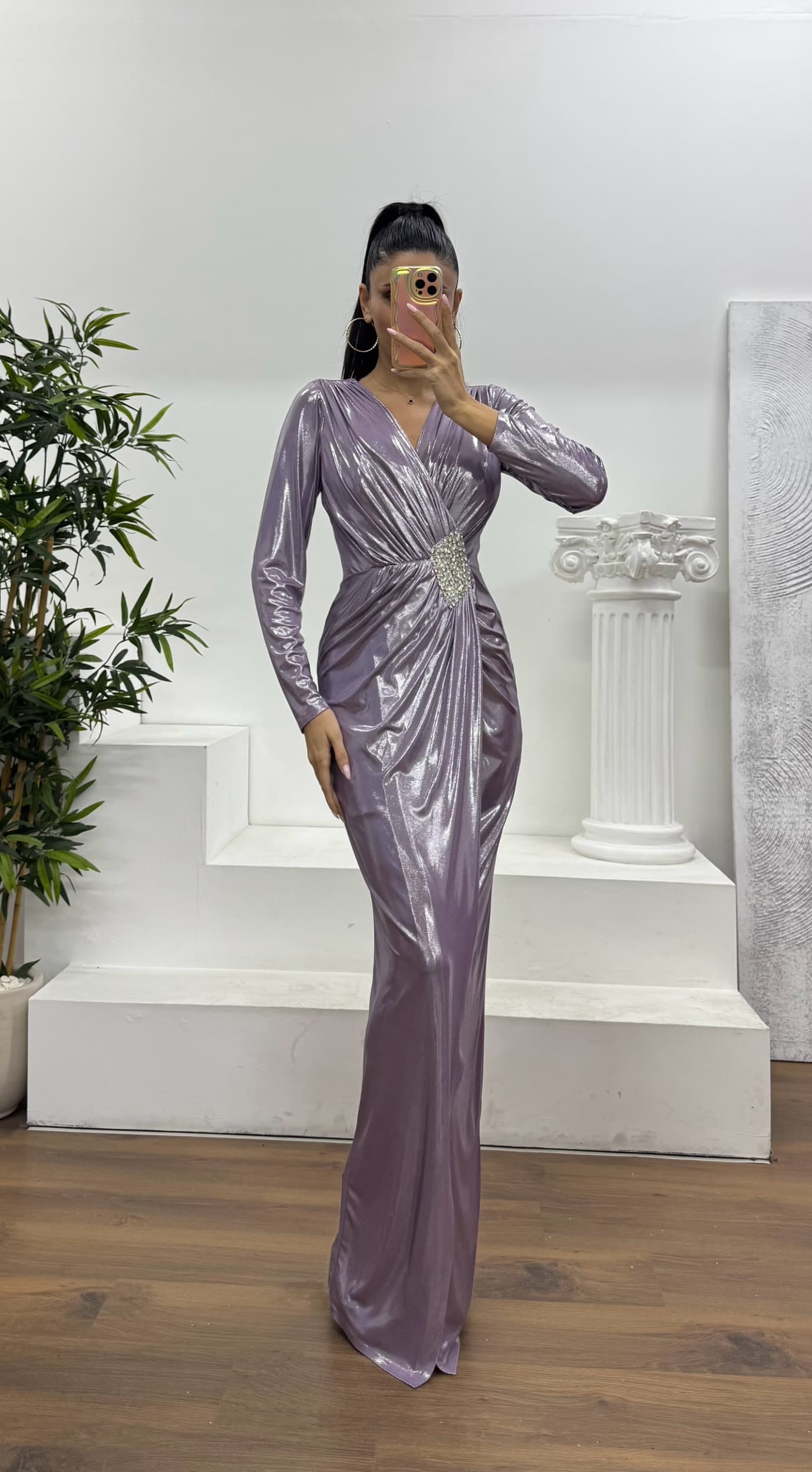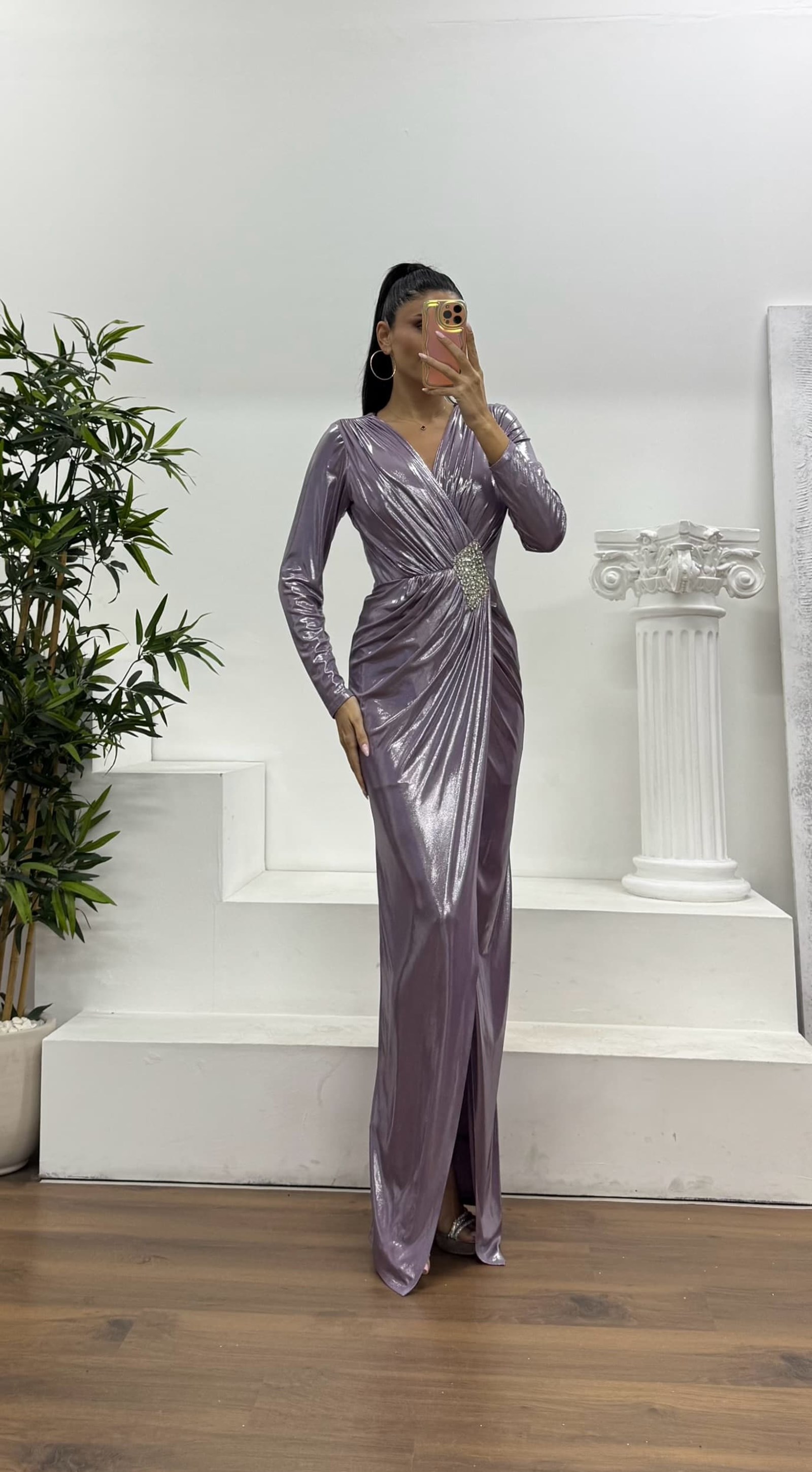 • Fıstık Yeşili V Yaka Metalik Abiye Elbise