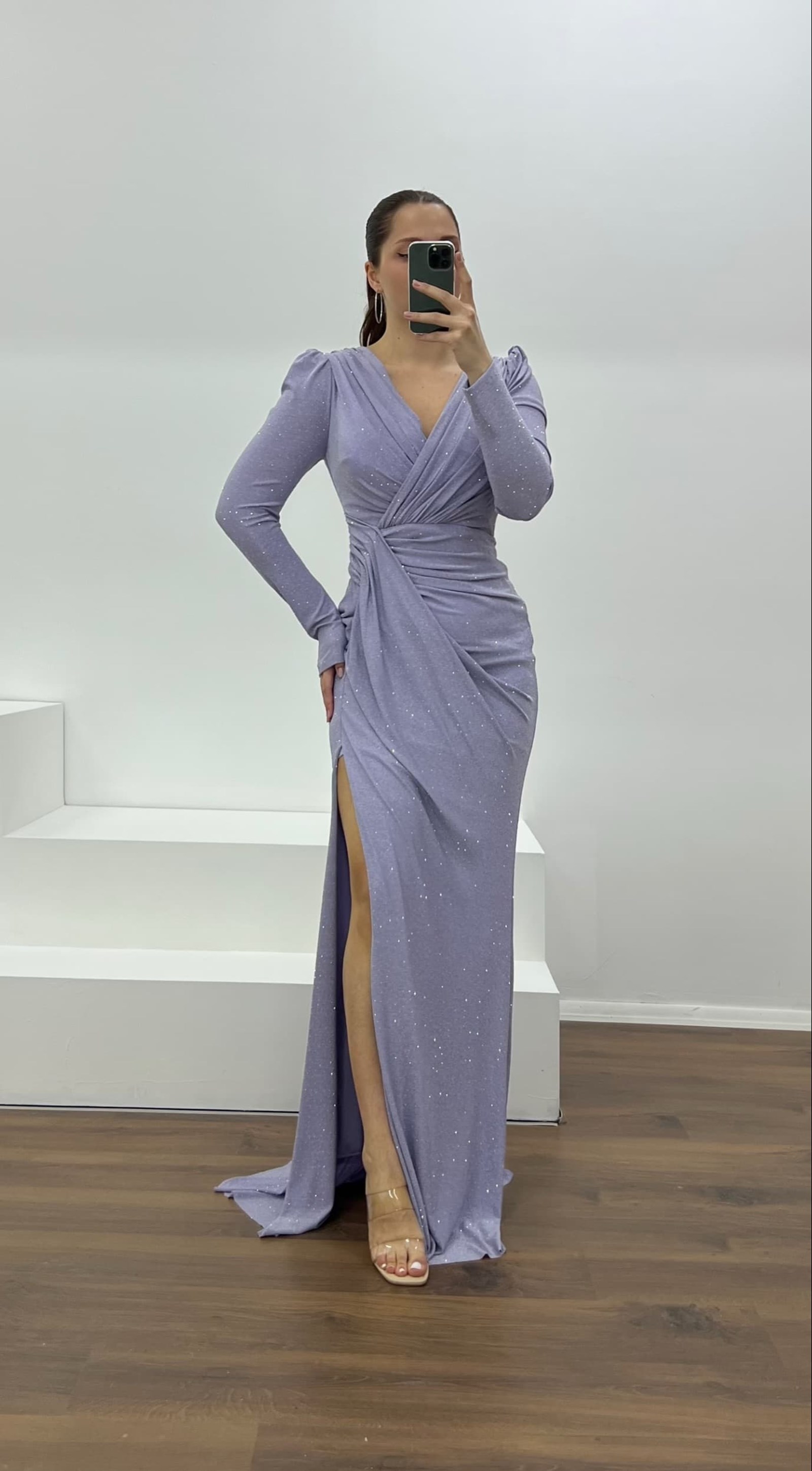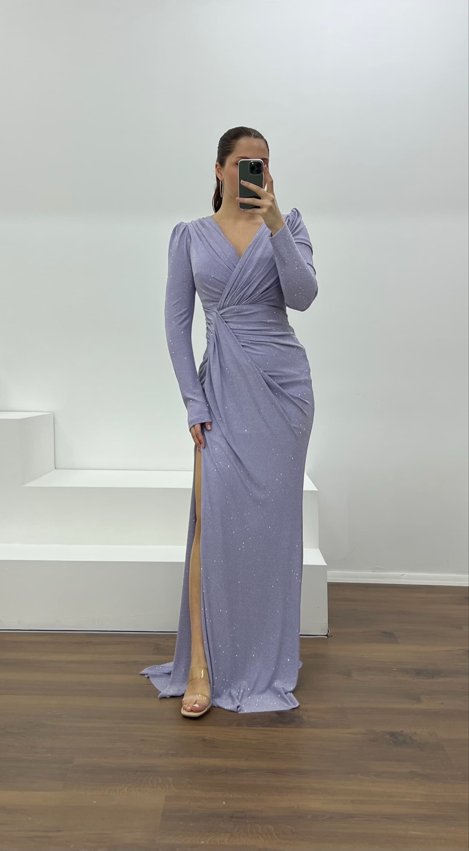 • Lila V Yaka Parıltılı Büyük Abiye Elbise