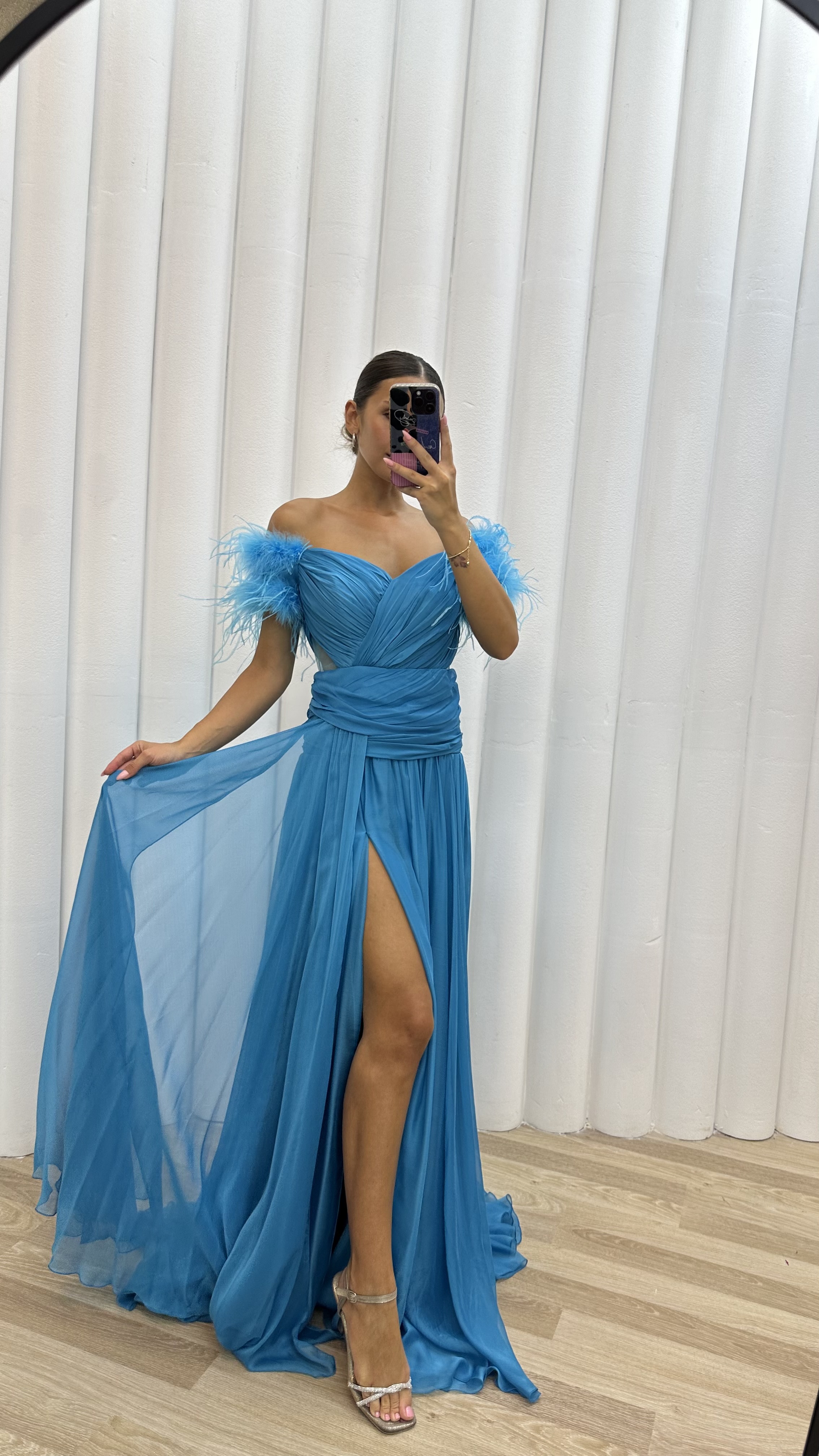 Mavi İp Askılı Omuzları Tüylü Tül Abiye Elbise