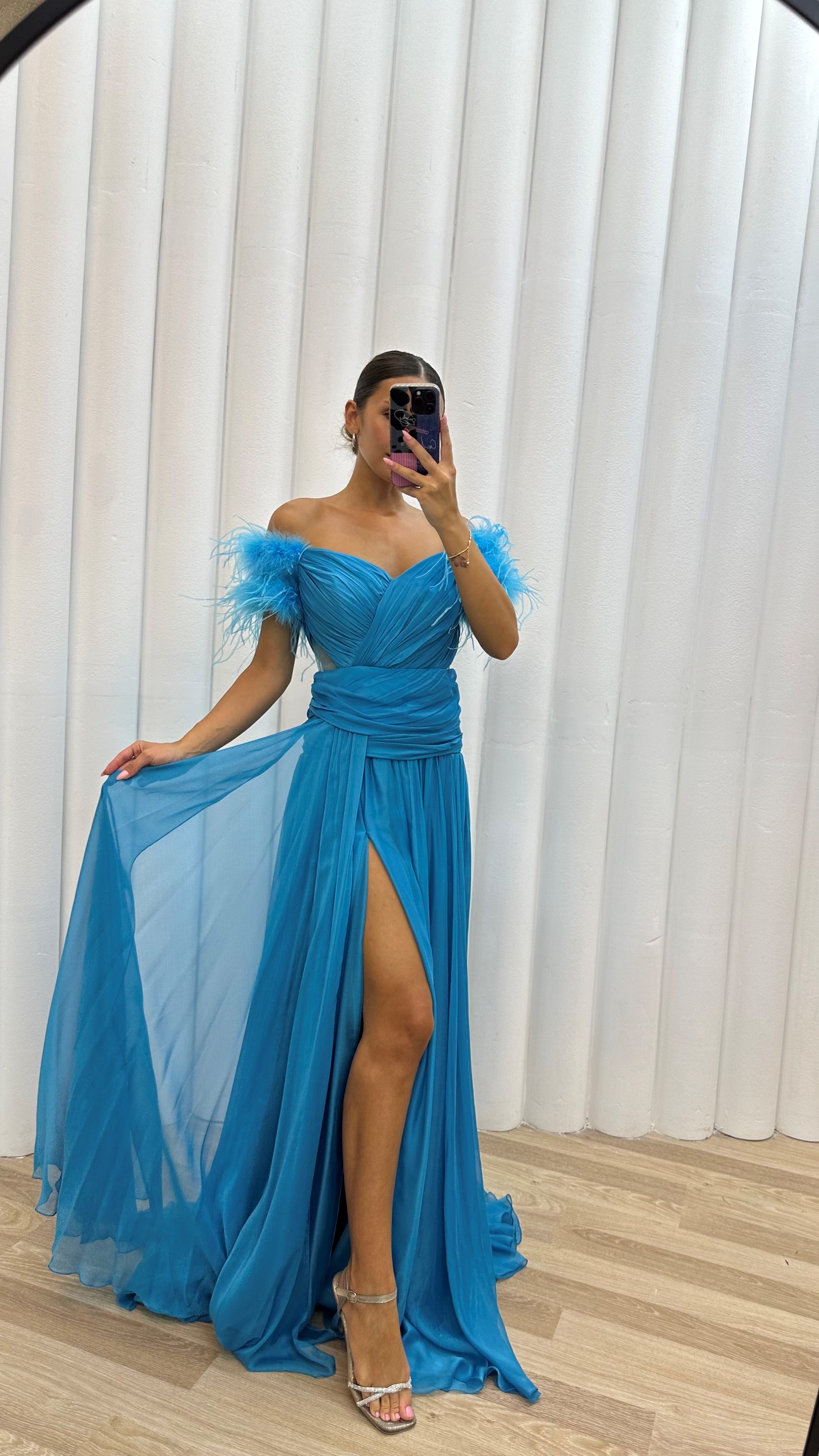 • Mavi İp Askılı Omuzları Tüylü Tül Abiye Elbise