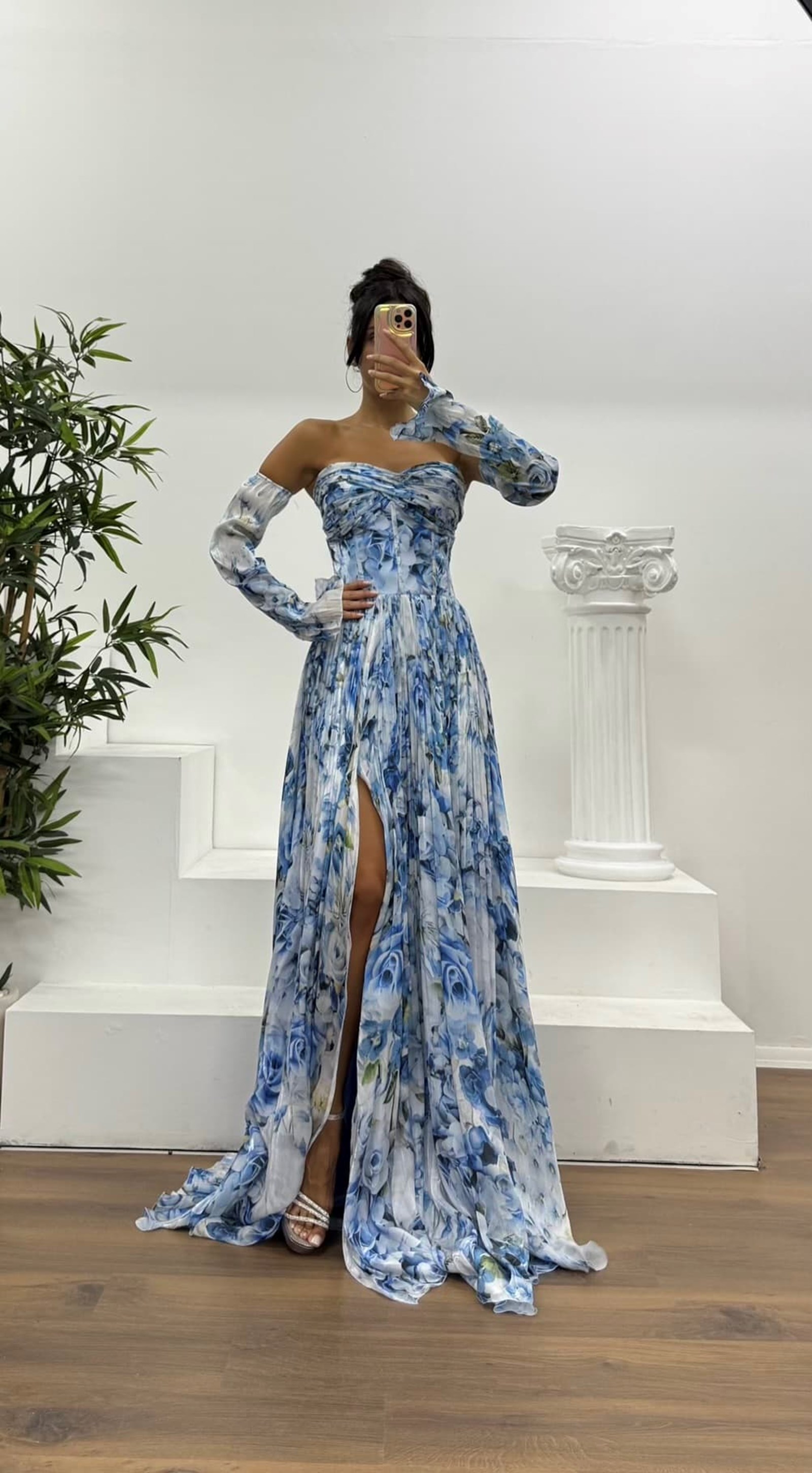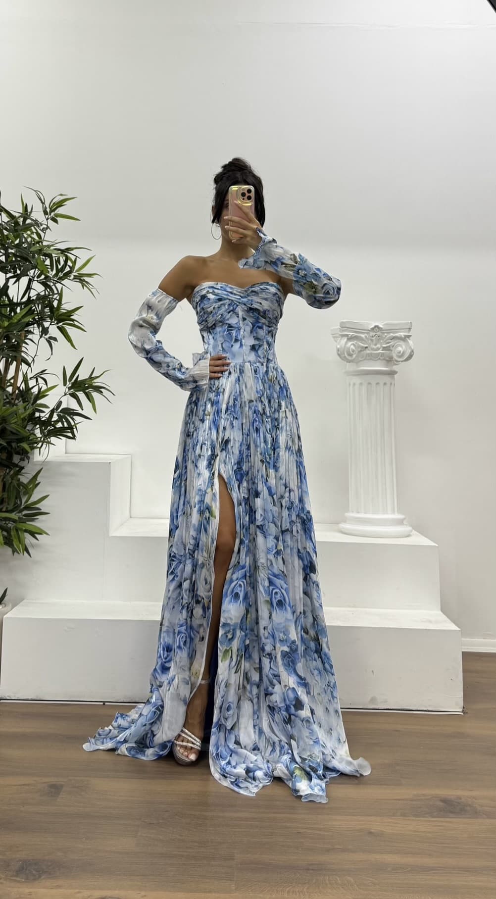 Ürün 36-42 bedene kadar uyumlu, göğüs pedli, astarlı, arka kapama fermuar, yırtmaçlı, lastikli şifon kol detay abiye olarak tasarlanmıştır.