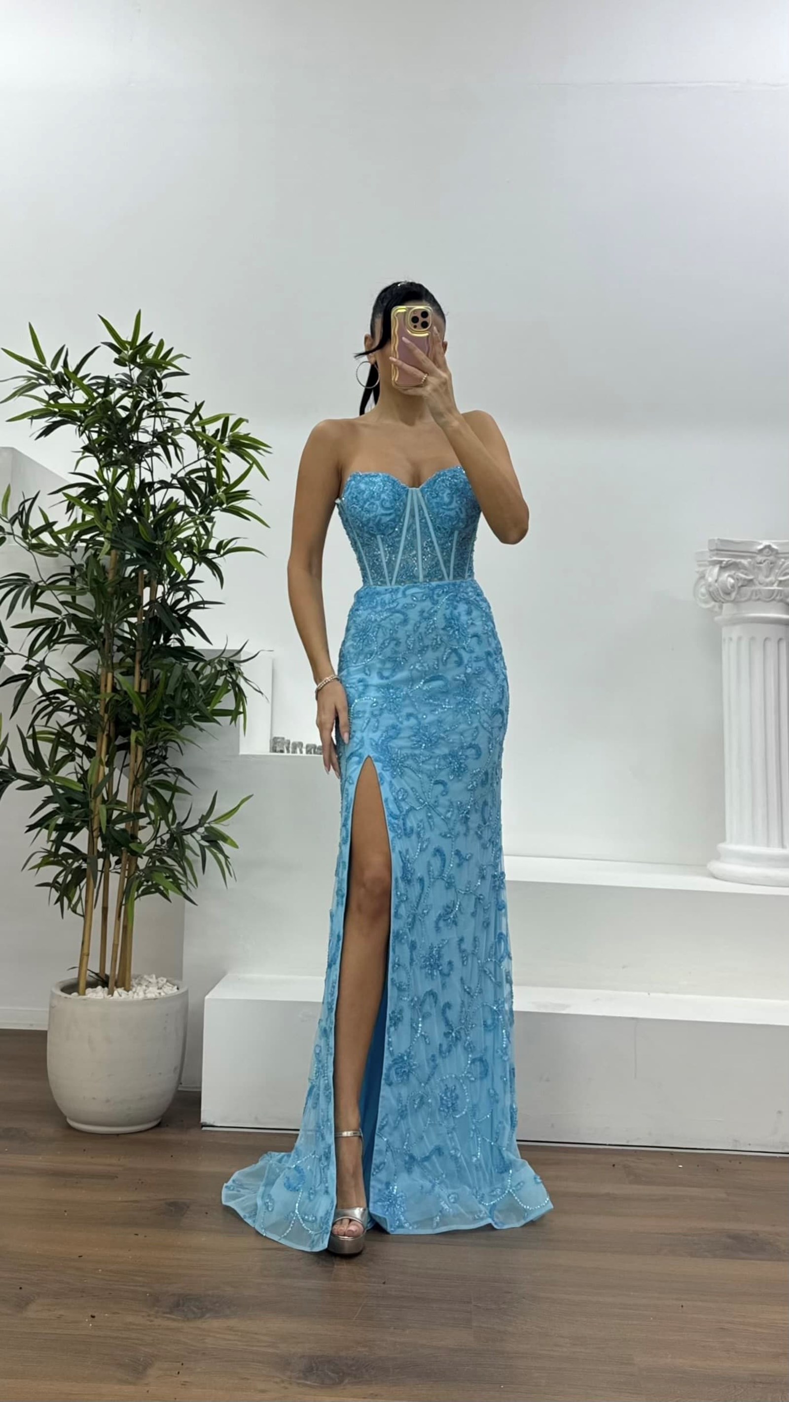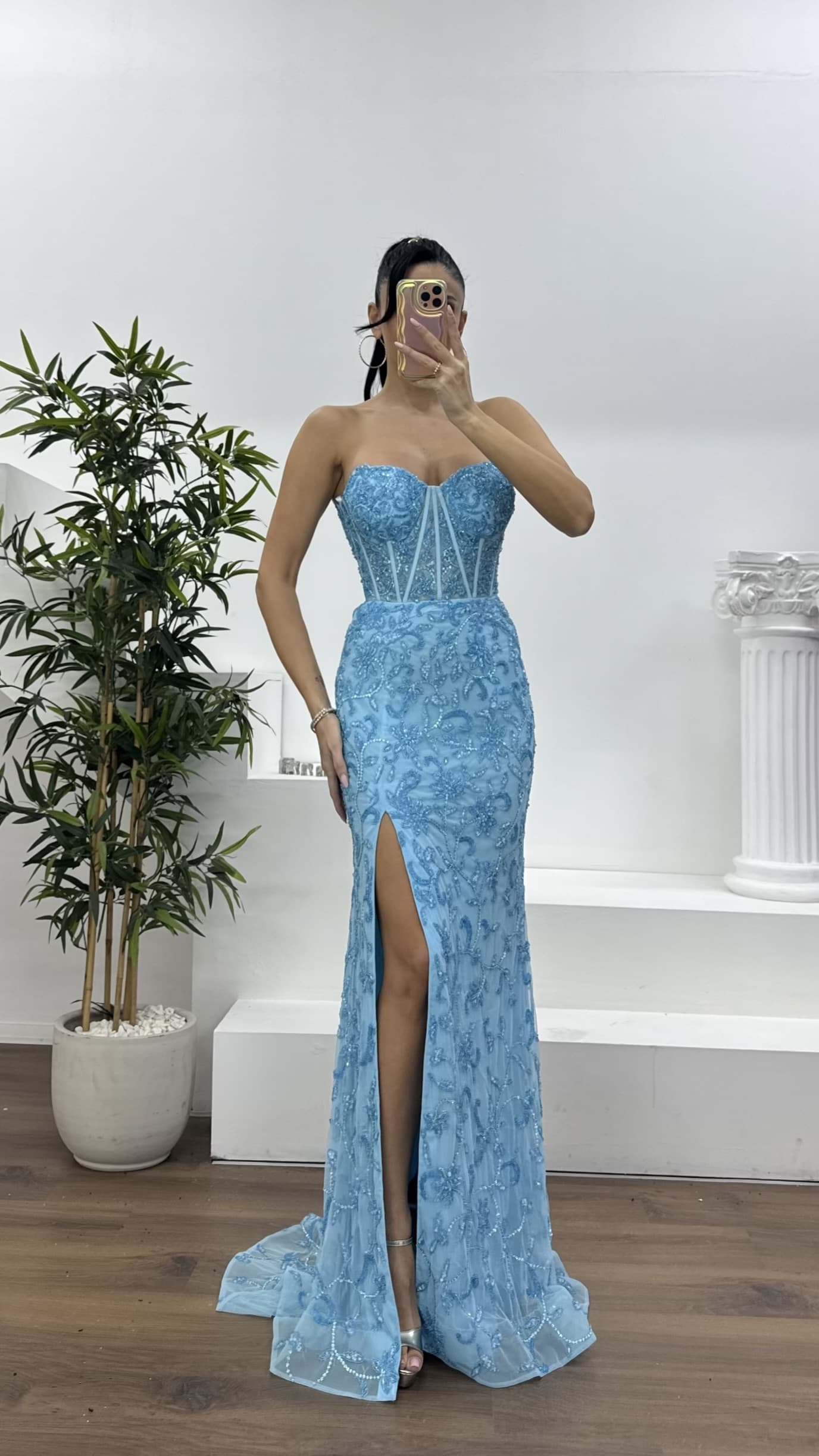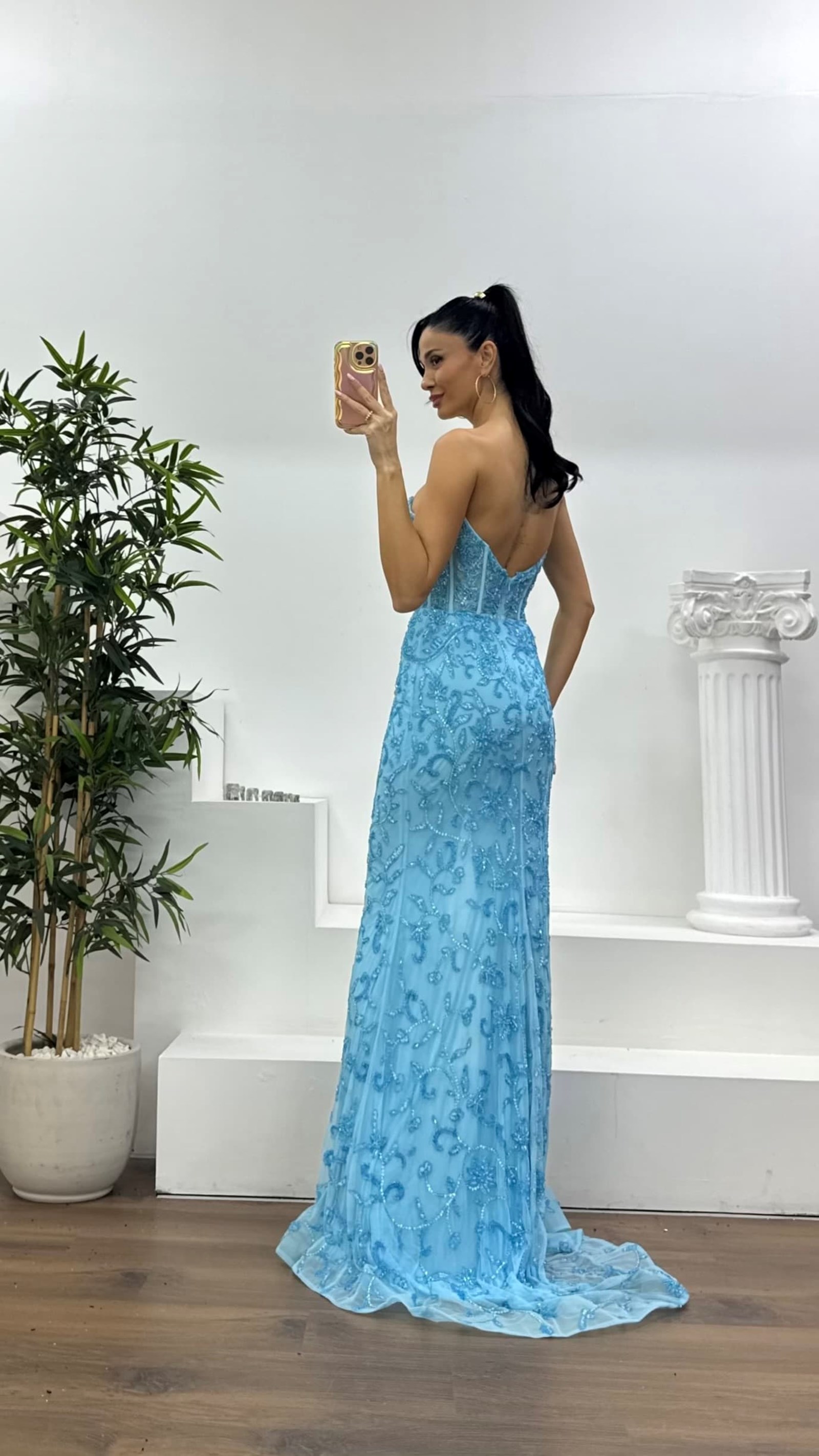 • Mavi Korse Detaylı Kalın Askılı Abiye Elbise