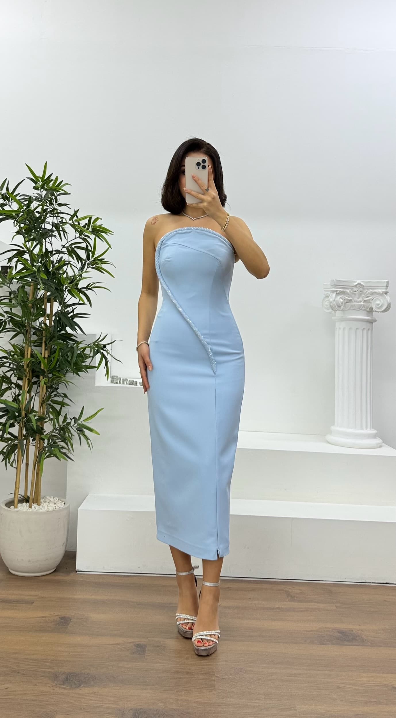 • Mavi Kristal Şerit Detaylı Straplez Abiye Elbise