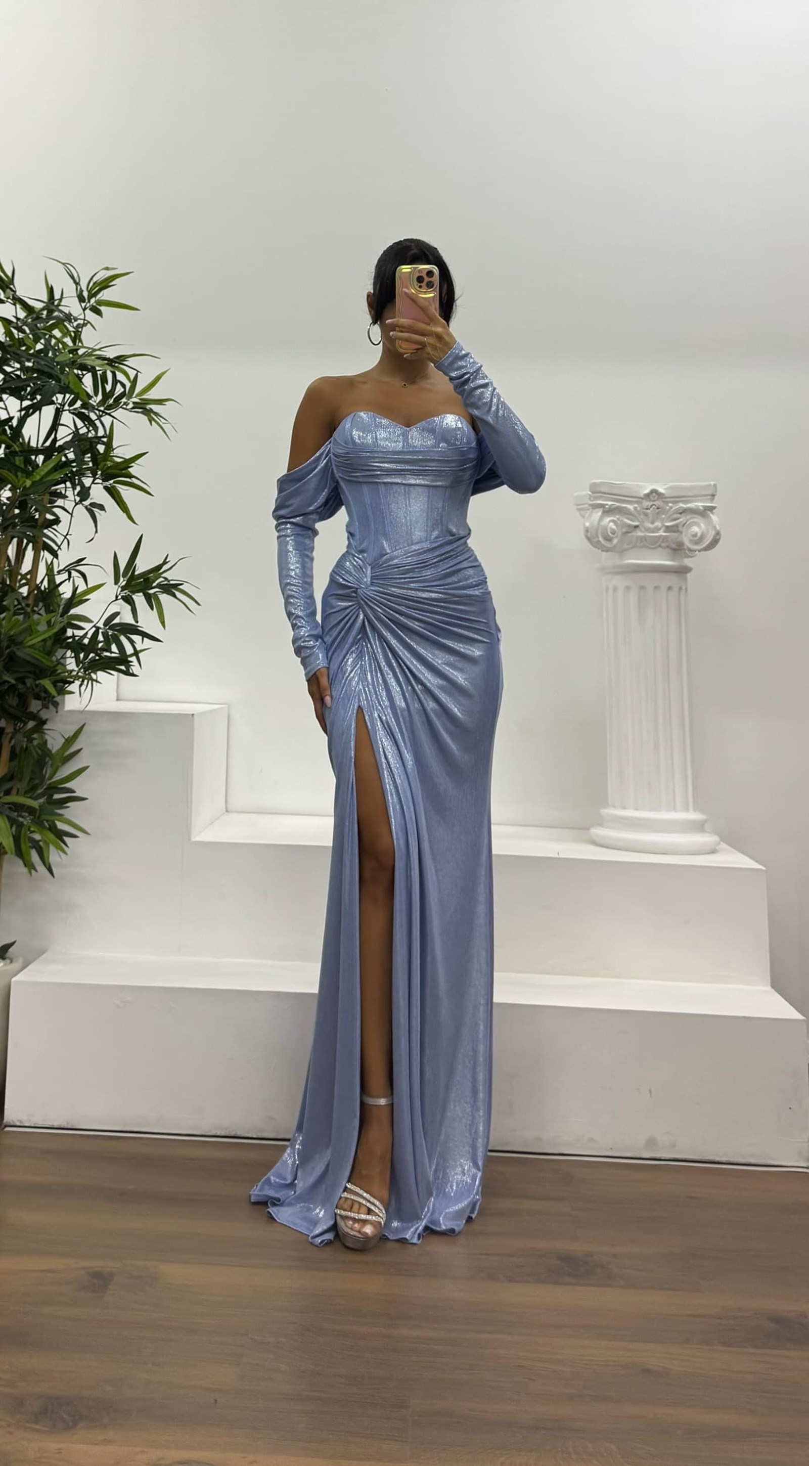 Ürün 36-44 bedene kadar uyumlu, göğüs pedli, astarlı, sırt capraz ip ve fermuar kapamalı, yırtmaçlı, eldivenli abiye olarak tasarlanmıştır.
