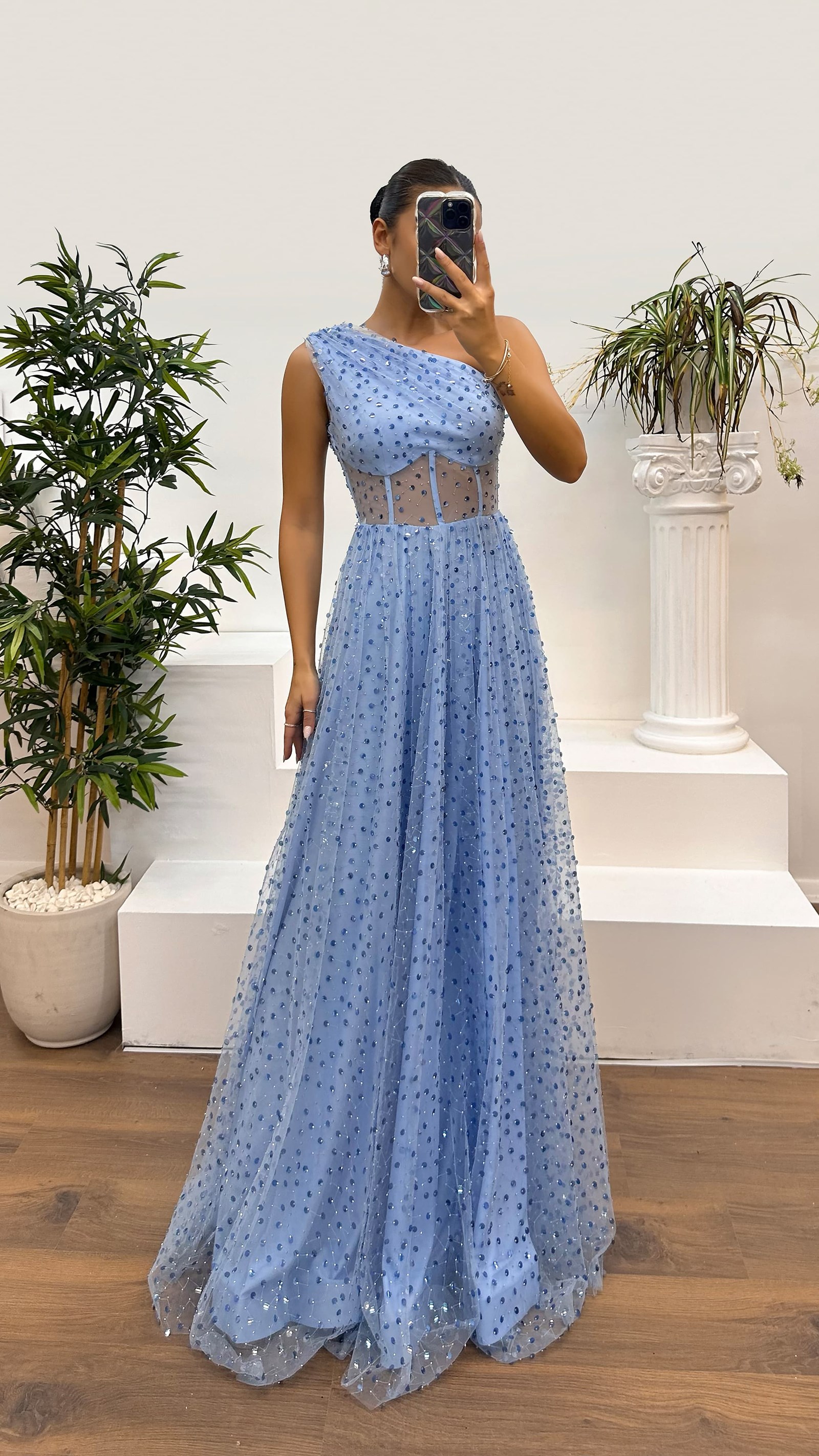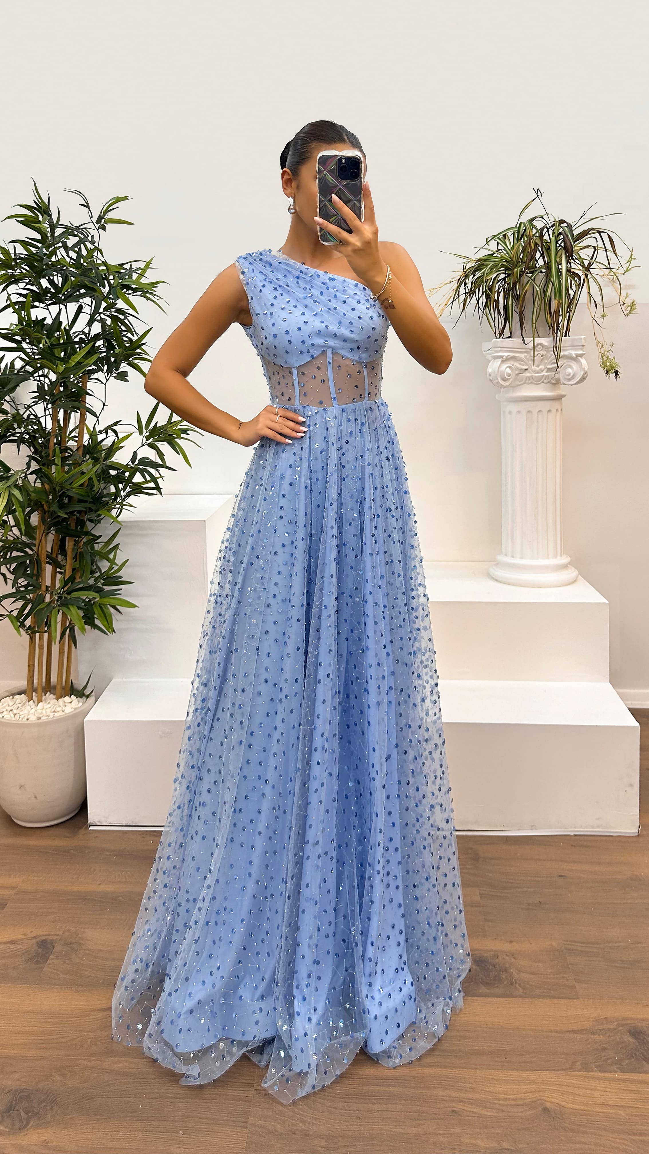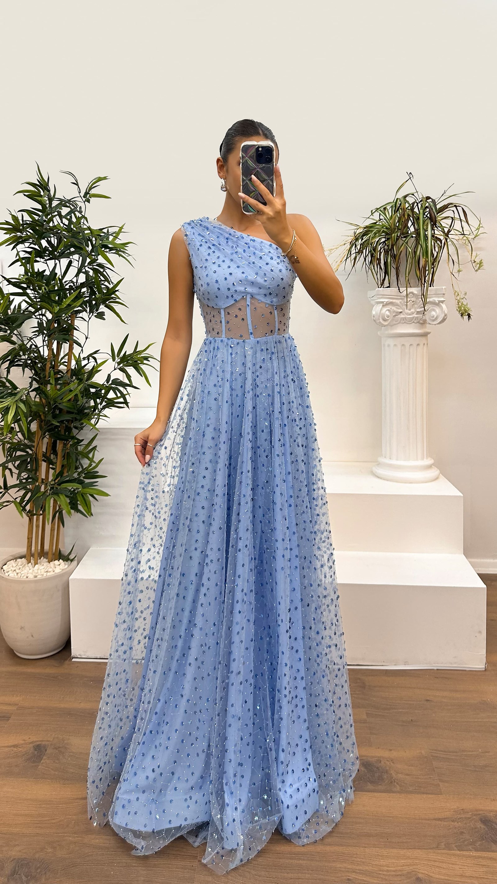 Mavi Tek Omuz Transparan İşlemeli Tasarım Elbise