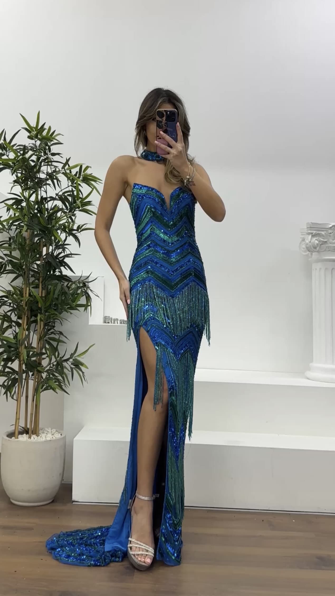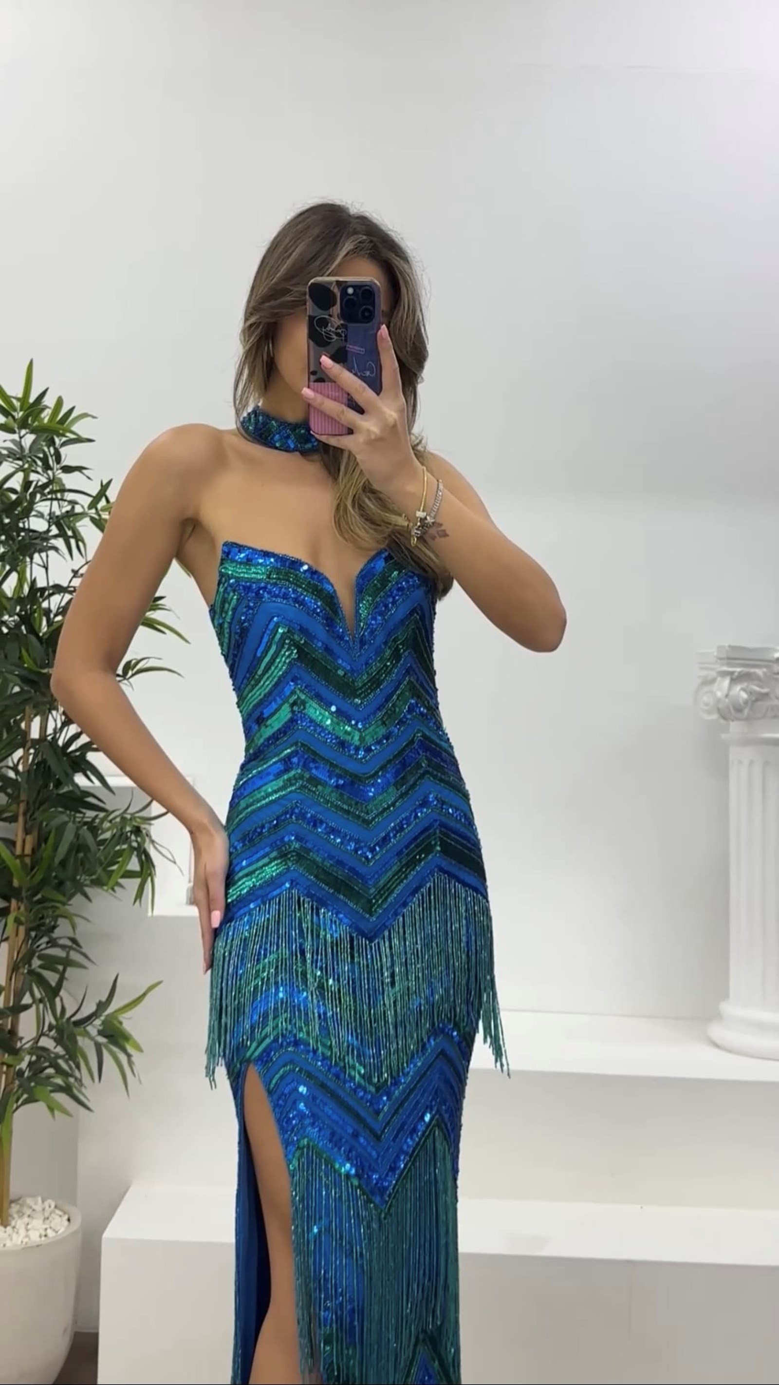 Püskül detaylı boyundan bağlamalı abiye elbise