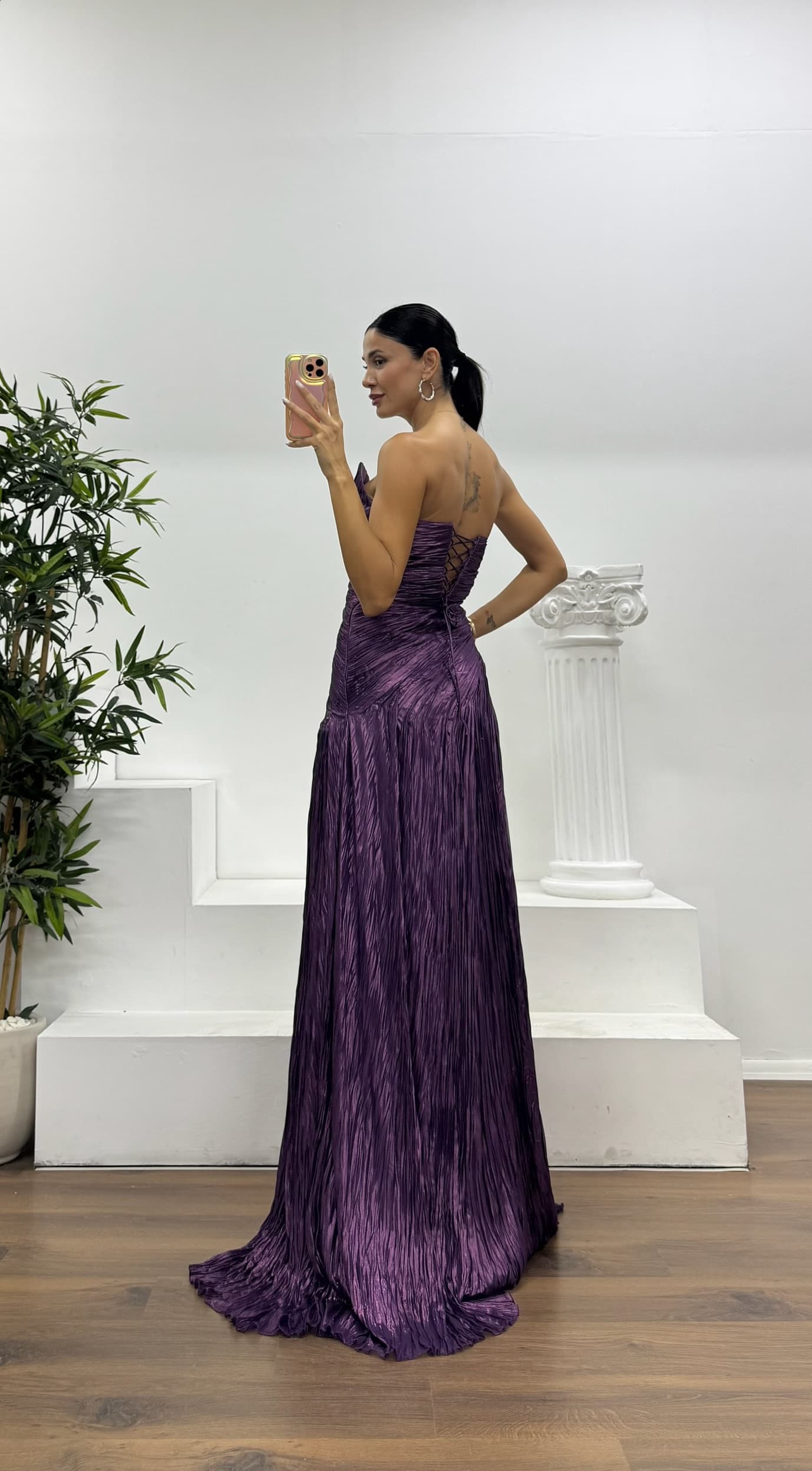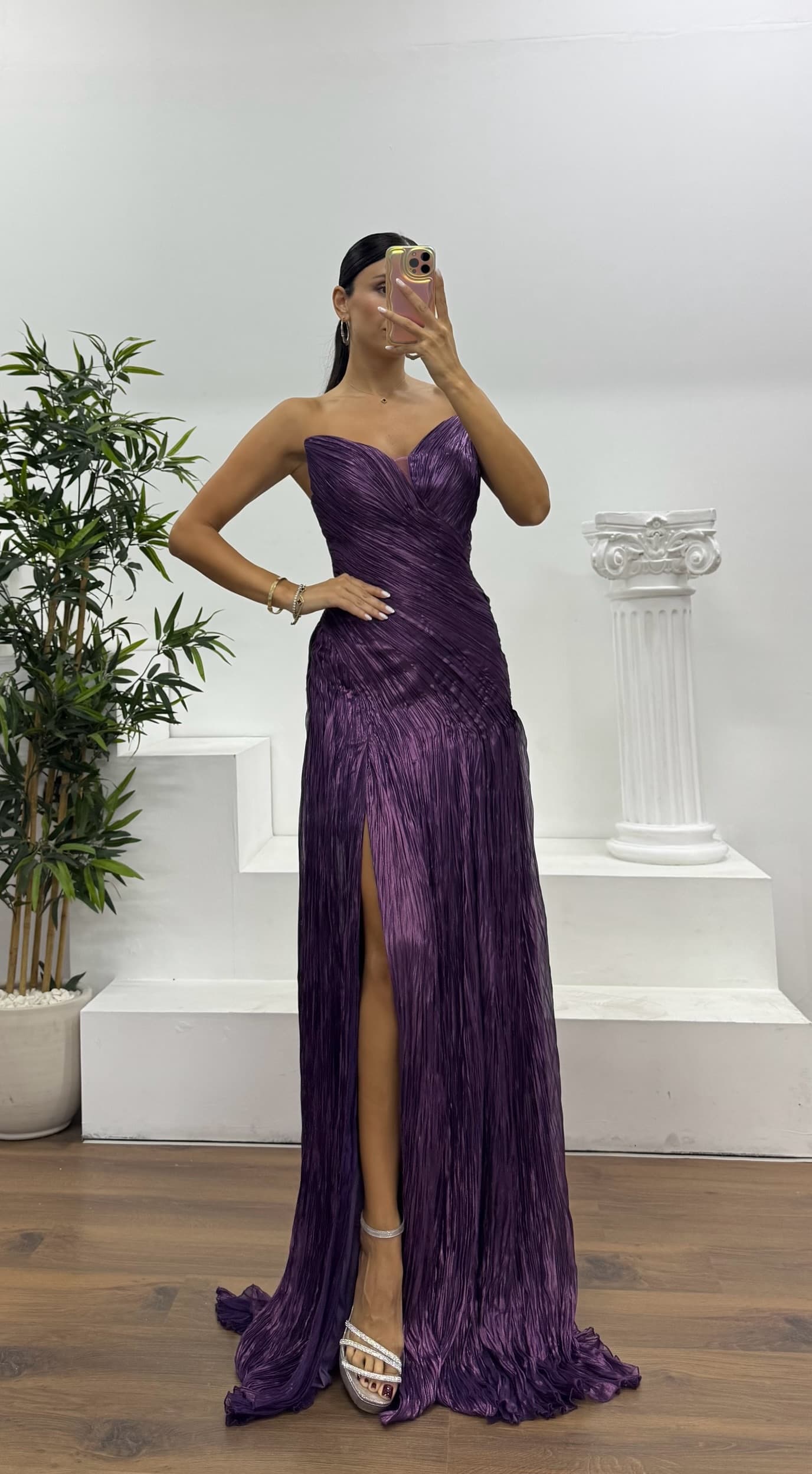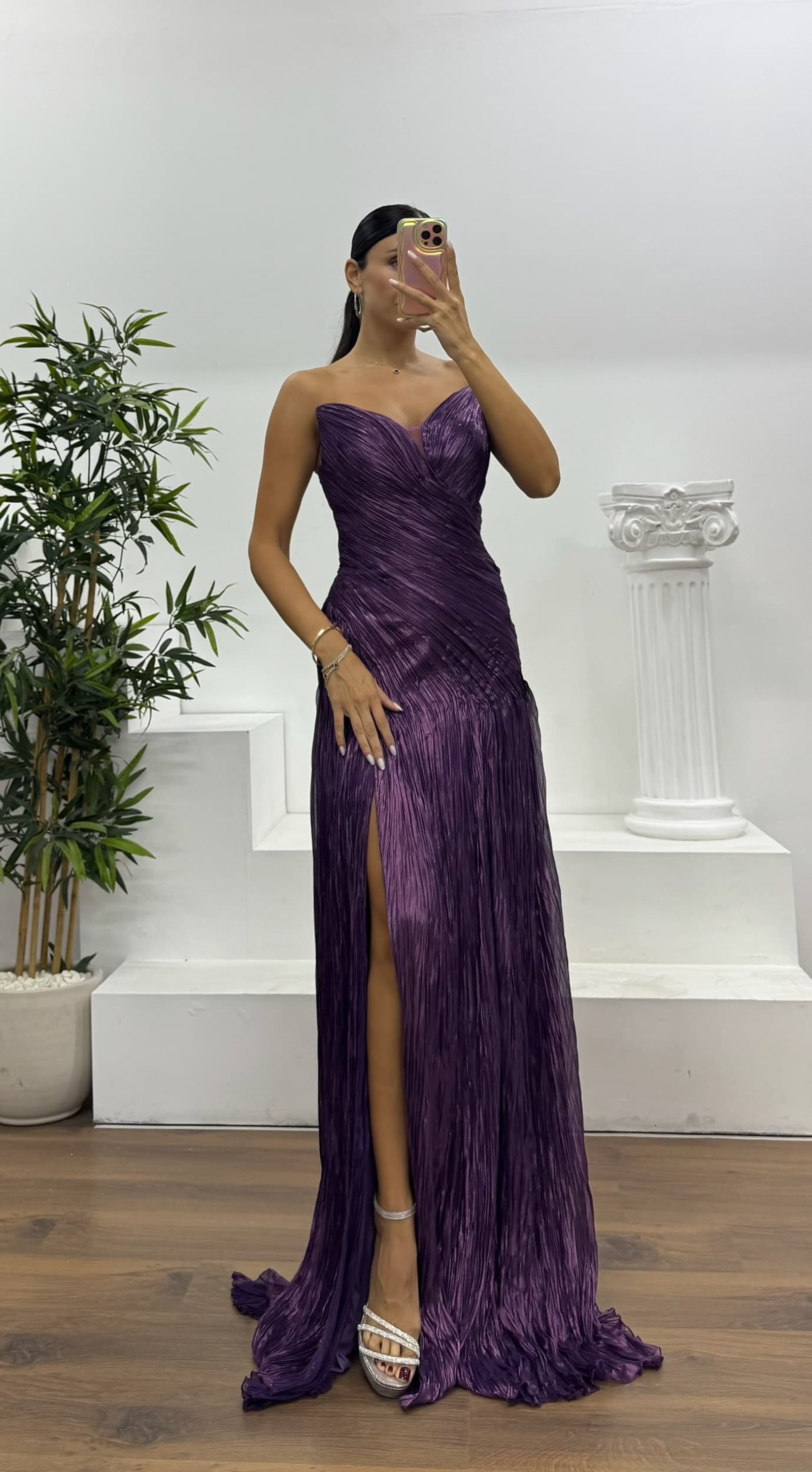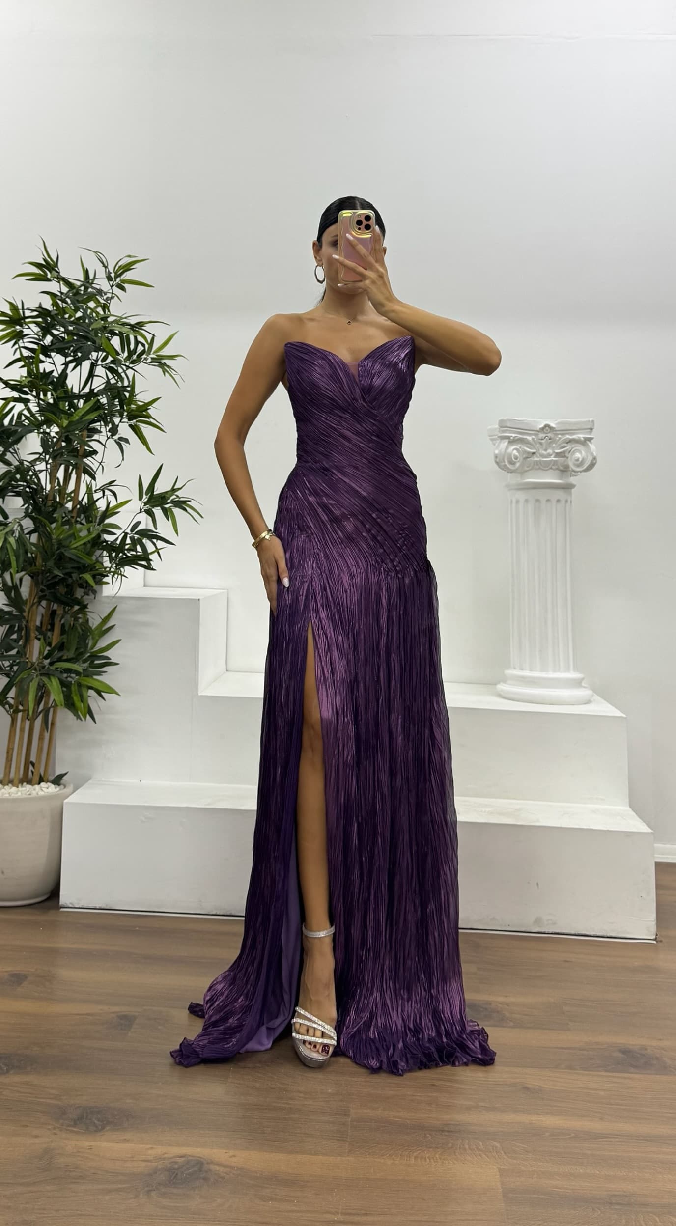 Ürün 36-44 bedene kadar uyumlu, göğüs pedli, astarlı, fermuarlı,sırt capraz ip kapamalı, yırtmaçlı, straplez abiye olarak tasarlanmıştır.