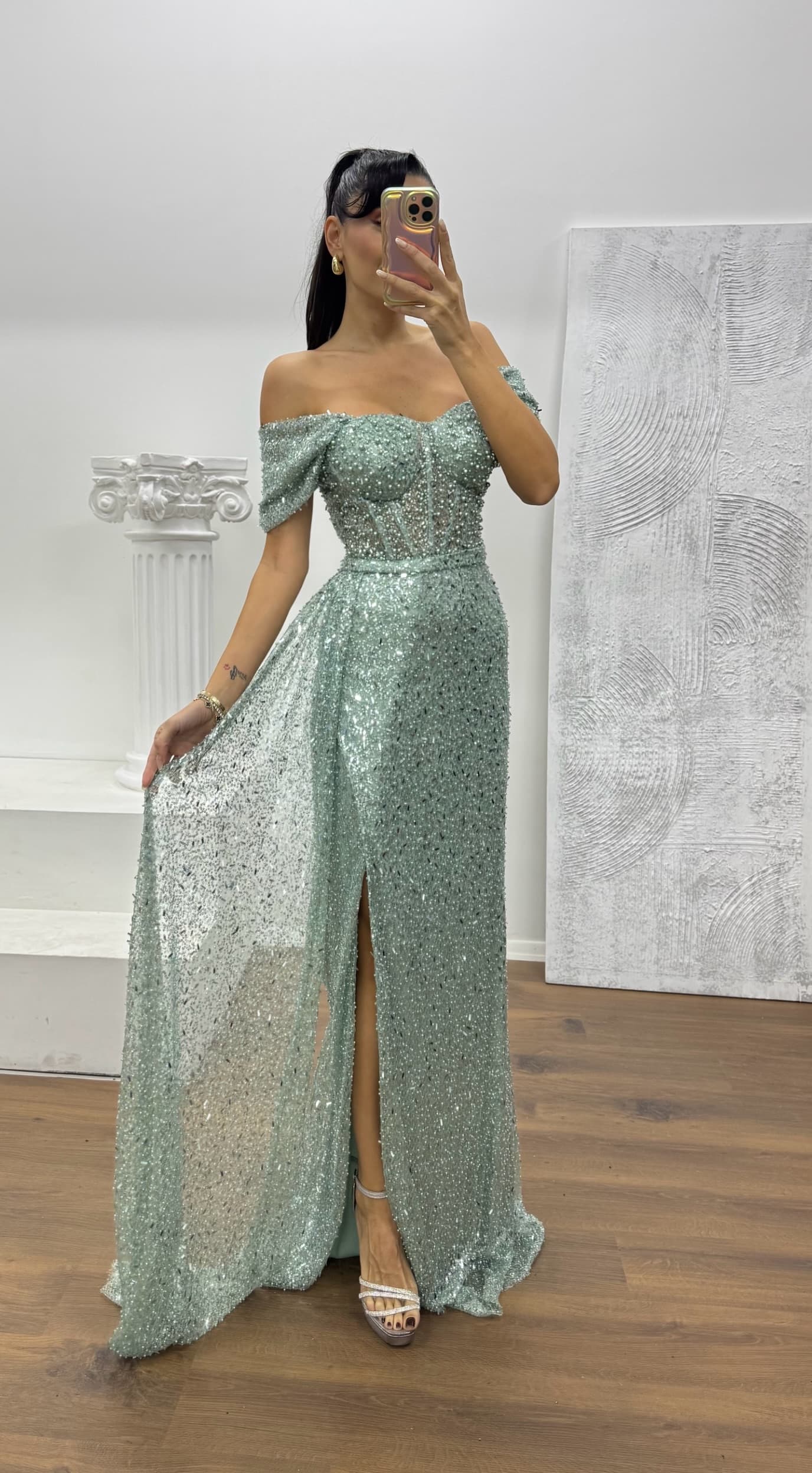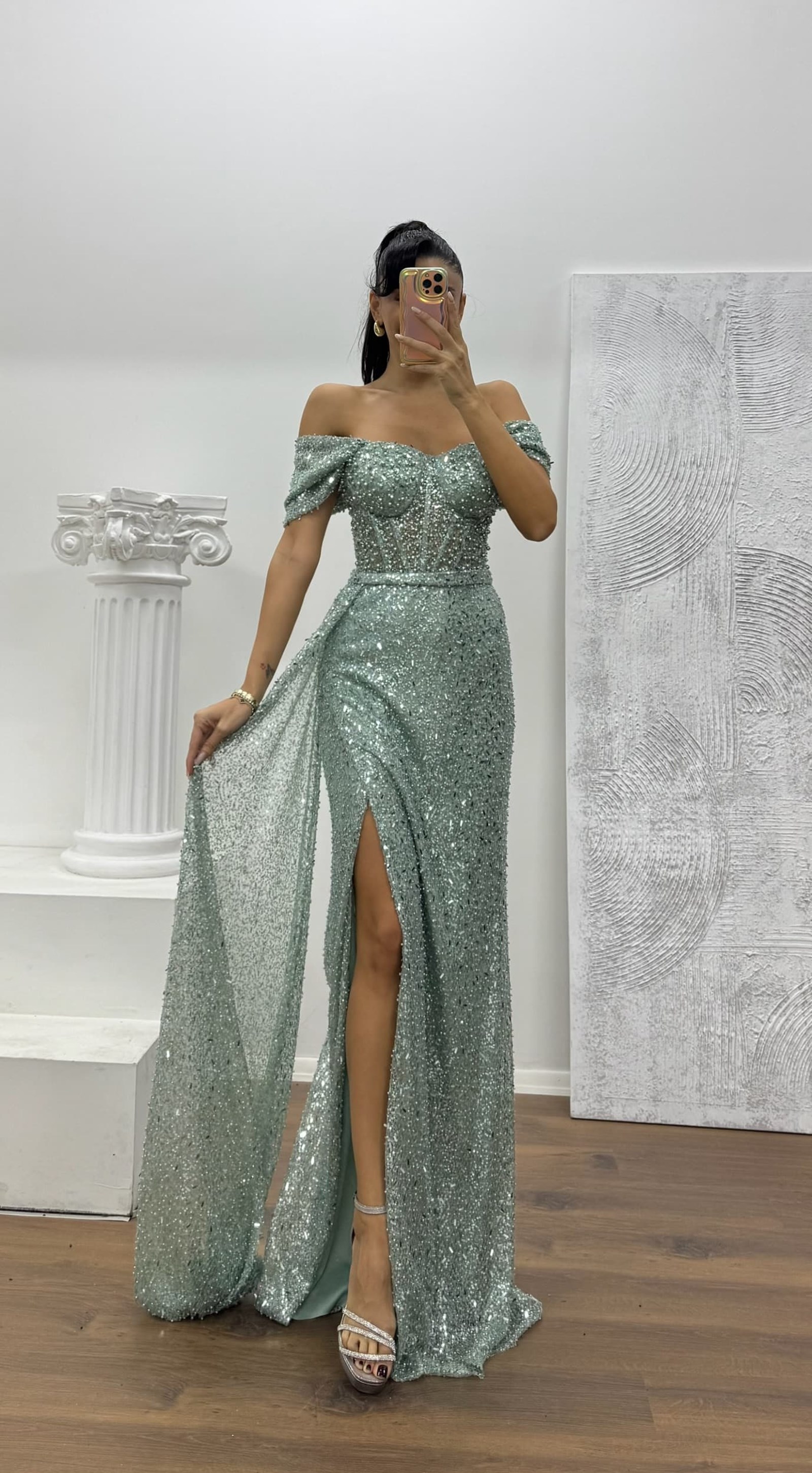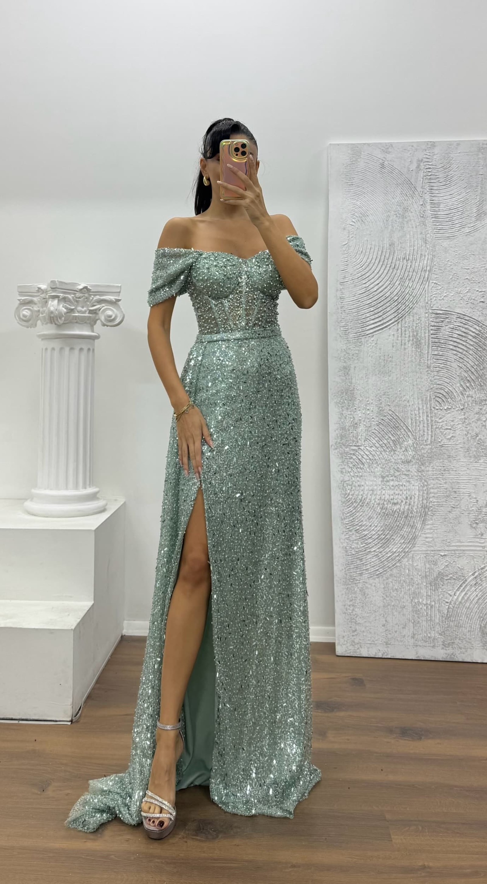Ürün 36-44 bedene kadar uyumlu, göğüs pedli, astarlı, arka kapama fermuar, yırtmaçlı abiye olarak tasarlanmıştır.