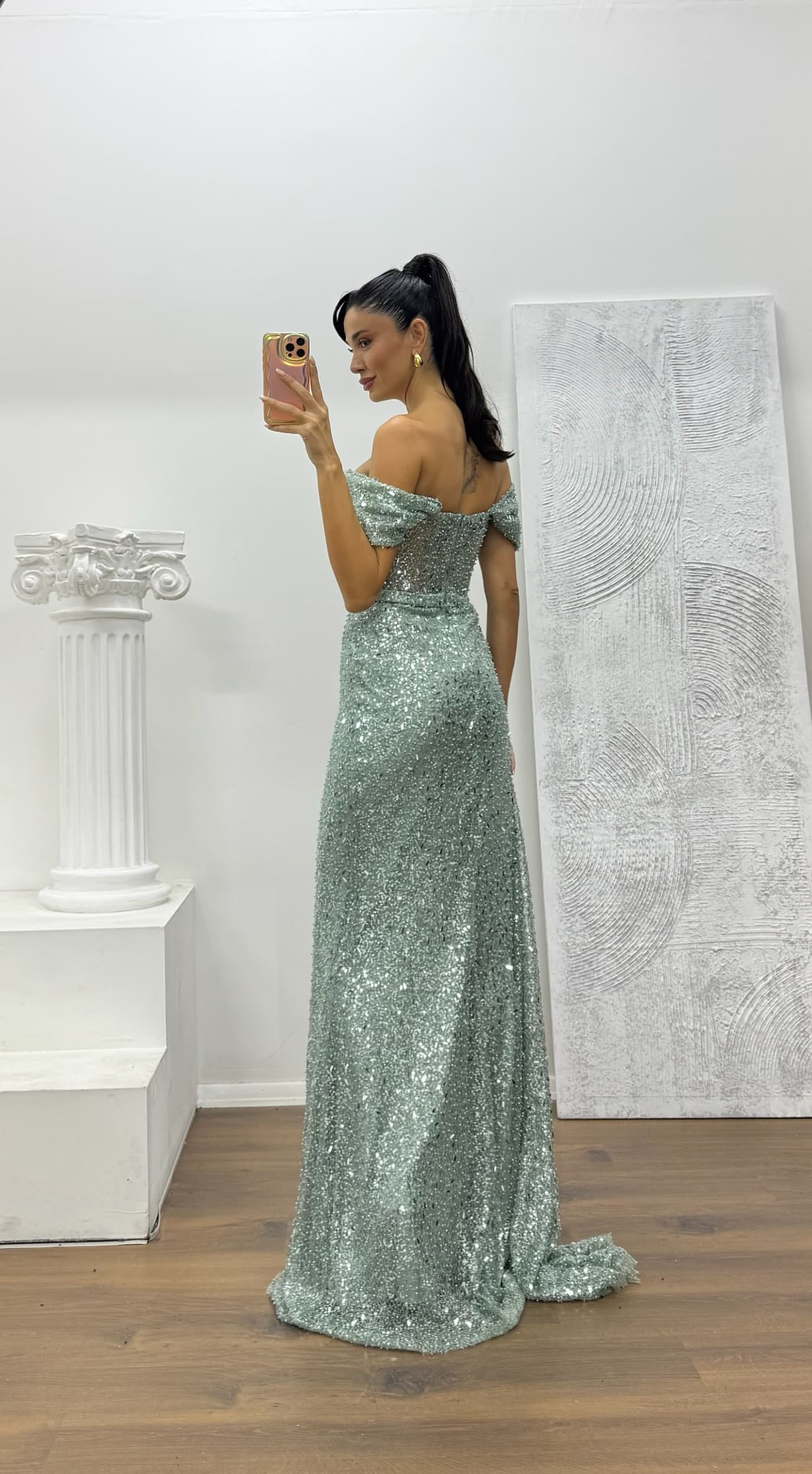 • Fıstık Bel Transparan Detay Abiye Elbise