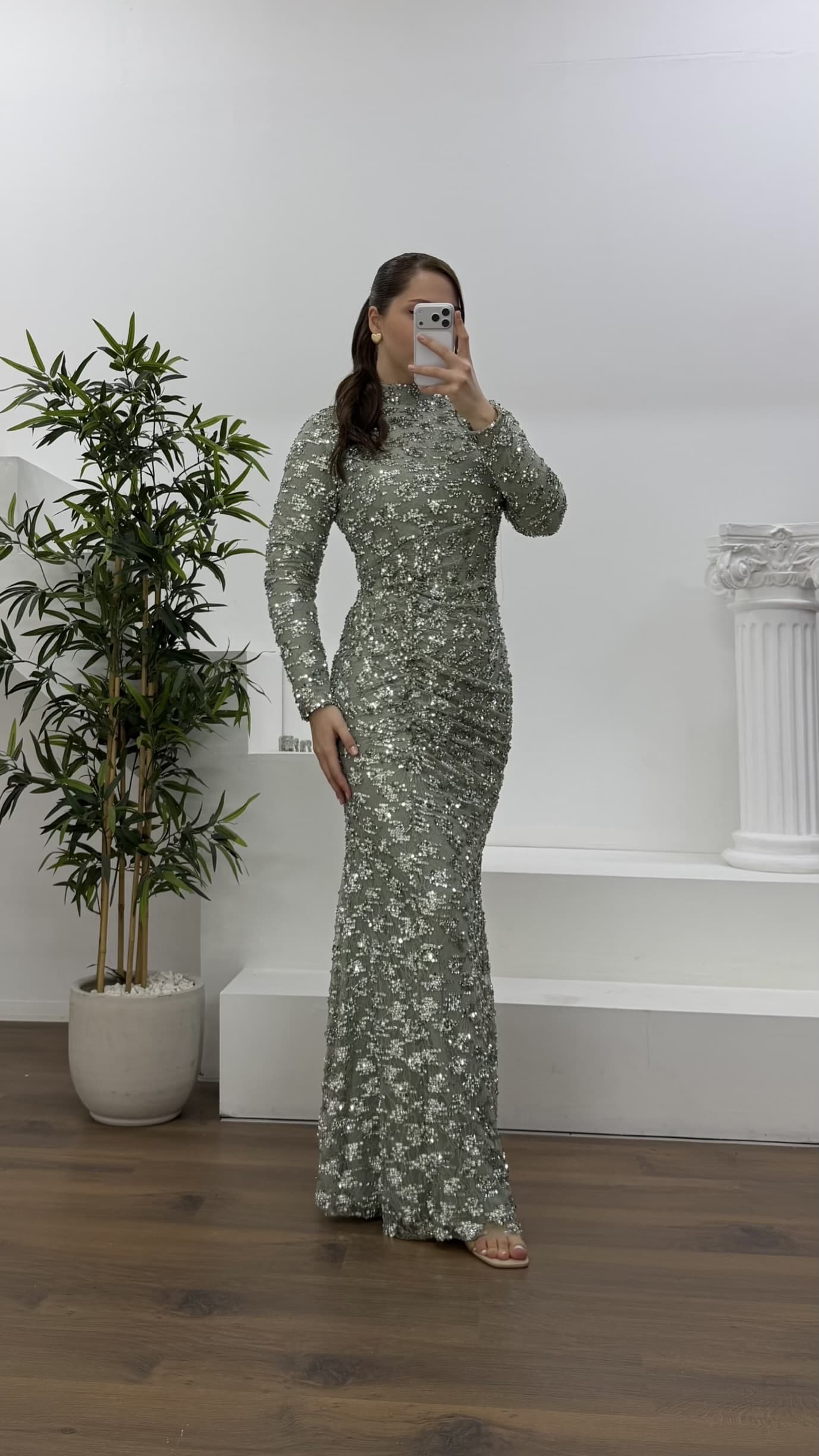 Ürün 42-46 bedene kadar uyumludur. göğüs pedli, astarlı, arka kapama fermuar, uzun kollu, drapeli abiye olarak tasarlanmıştır.