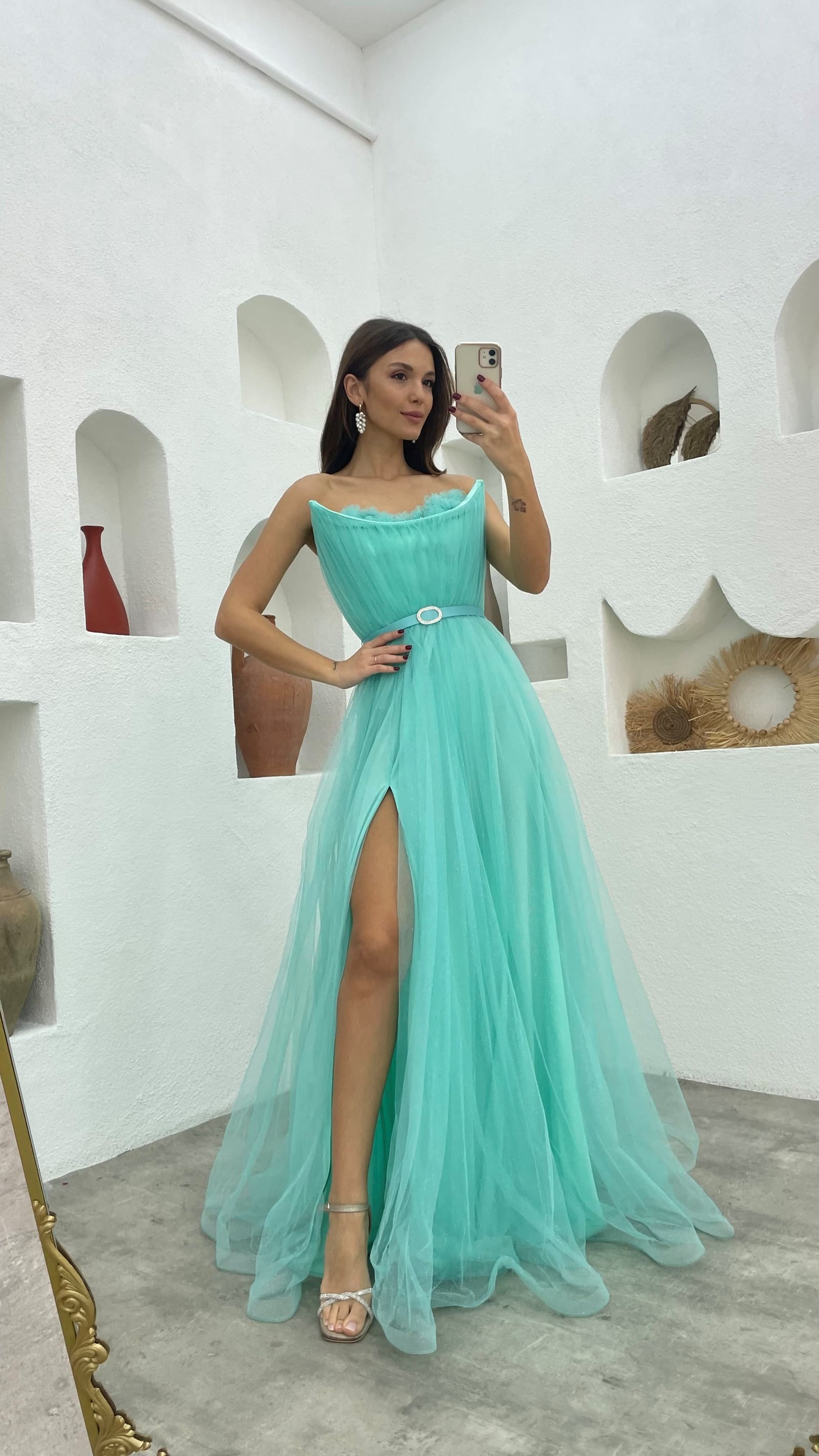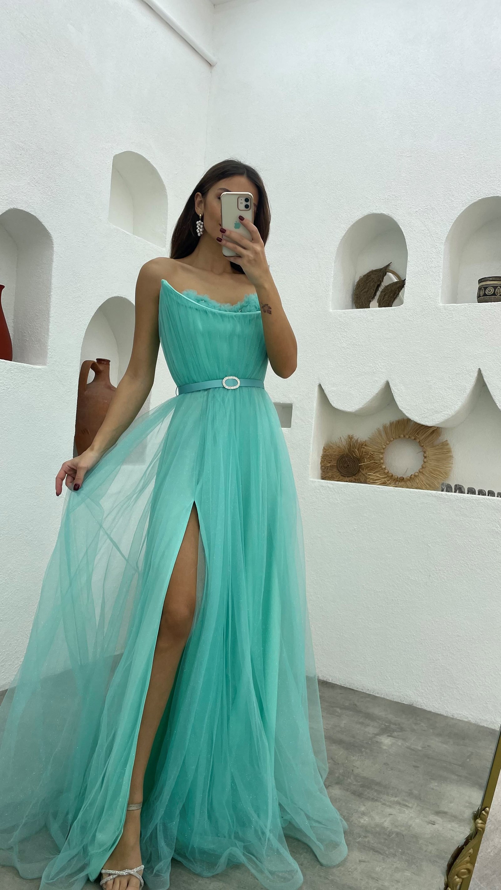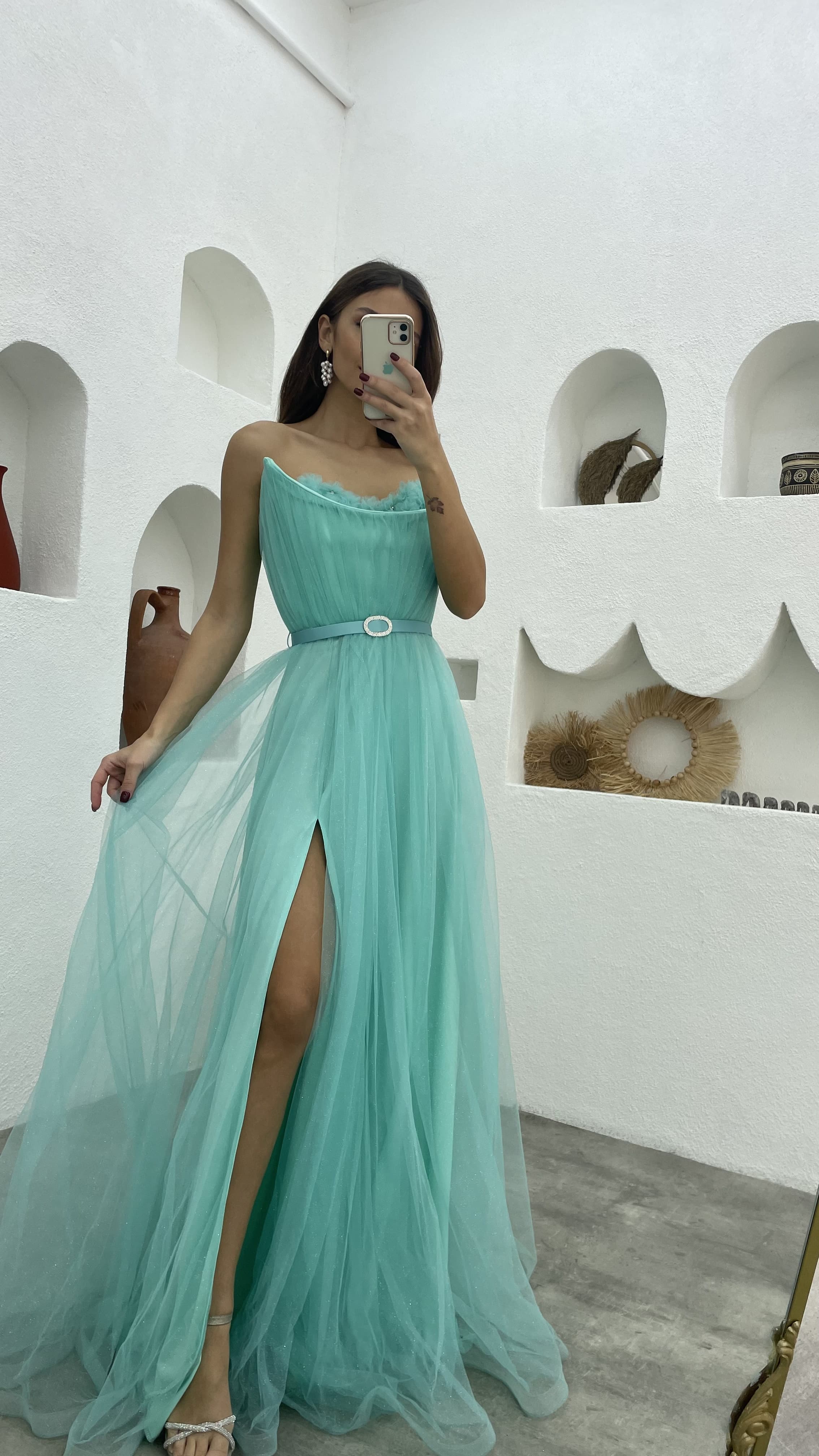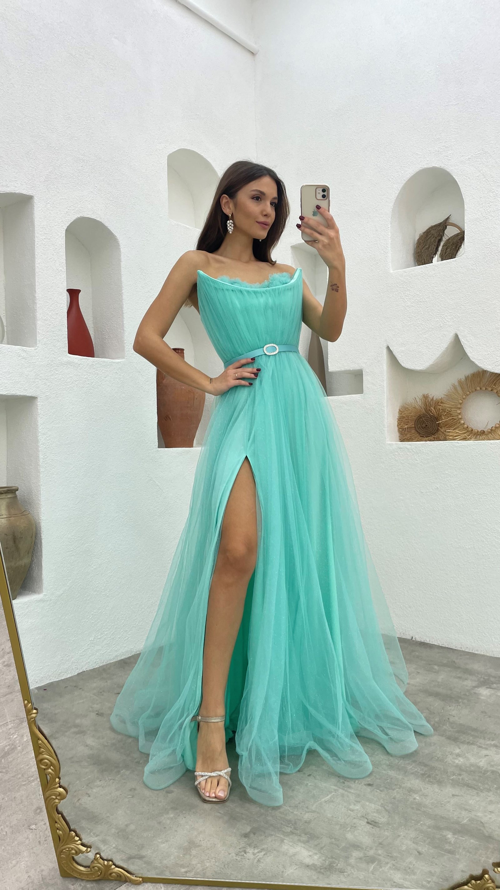 • Mint Yeşili Göğsü Çiçek Detay Straplez Kemerli Tül Abiye Elbise