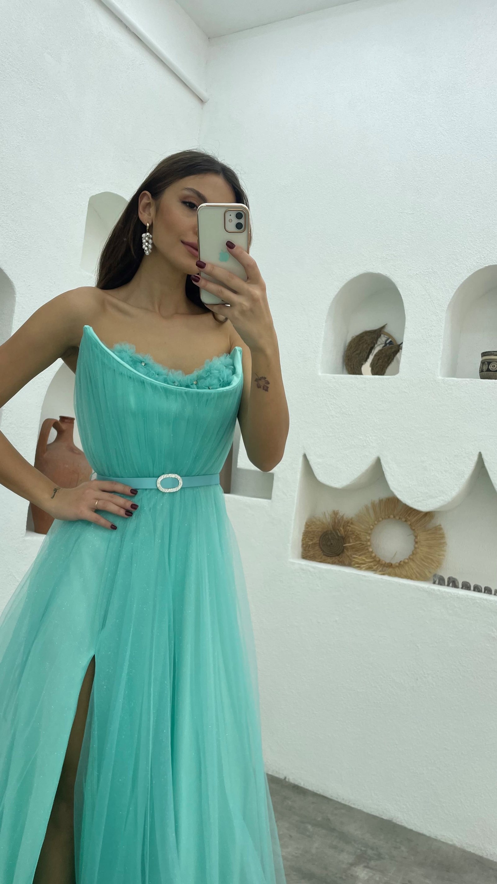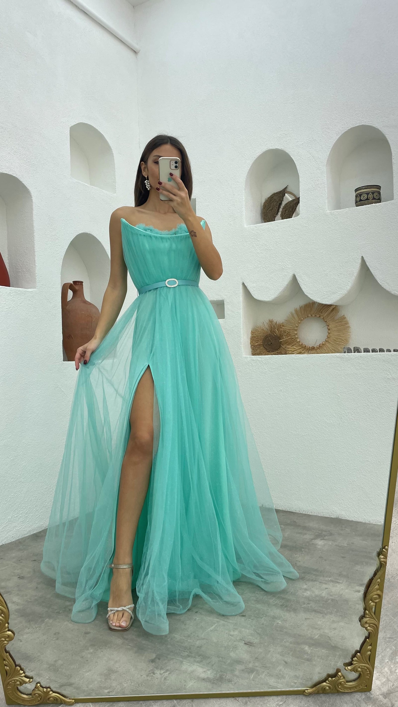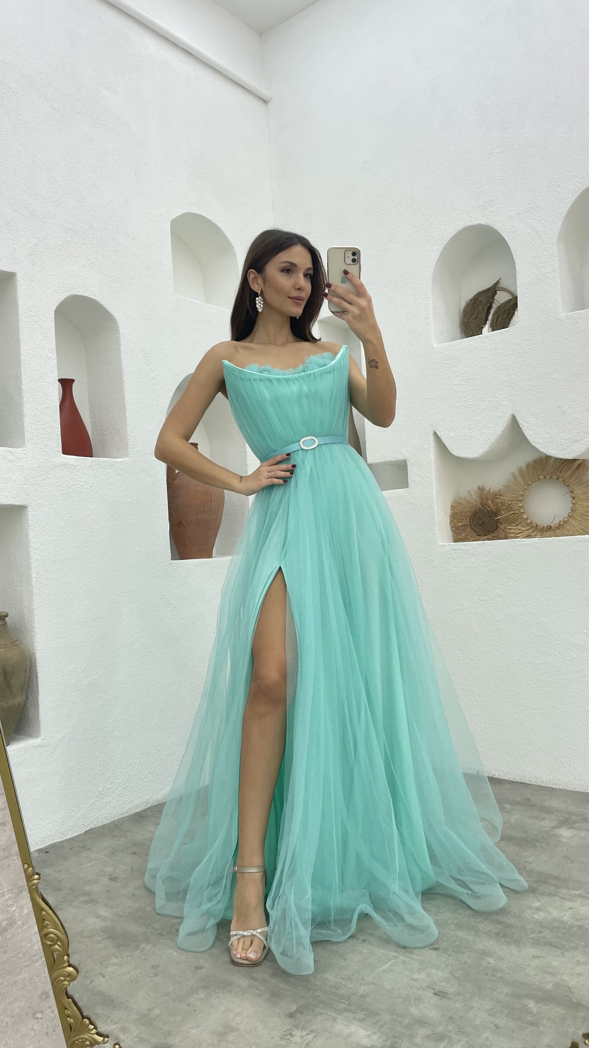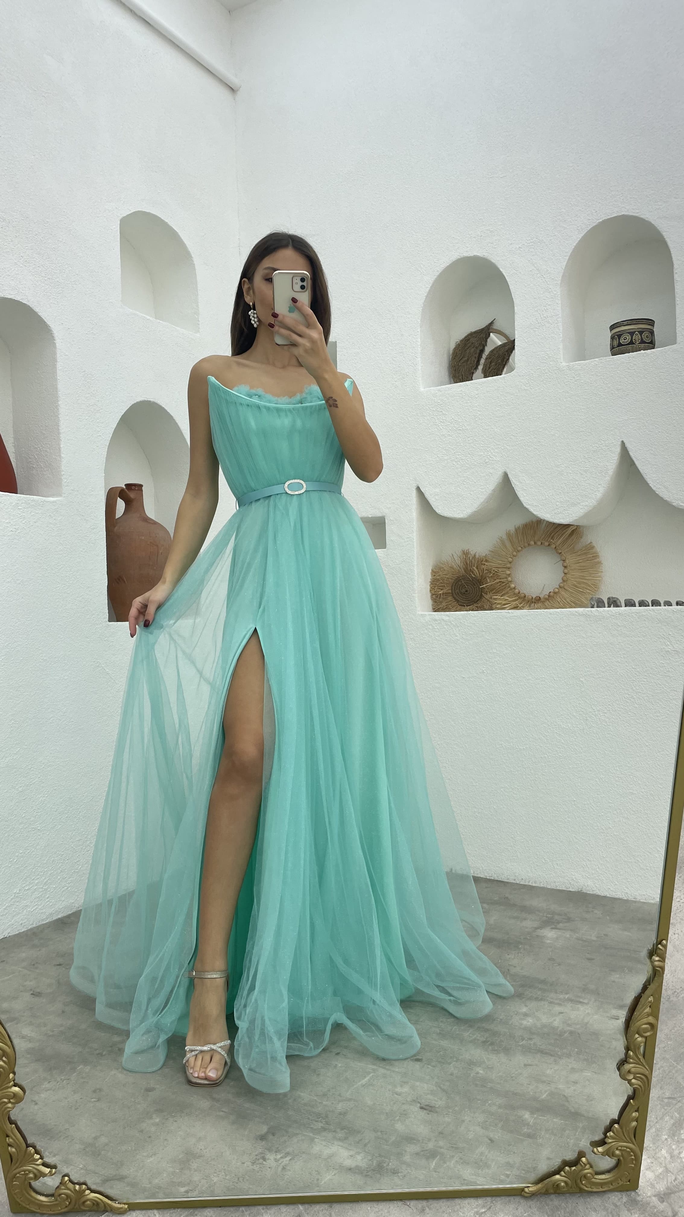 • Mint Yeşili Göğsü Çiçek Detay Straplez Kemerli Tül Abiye Elbise
