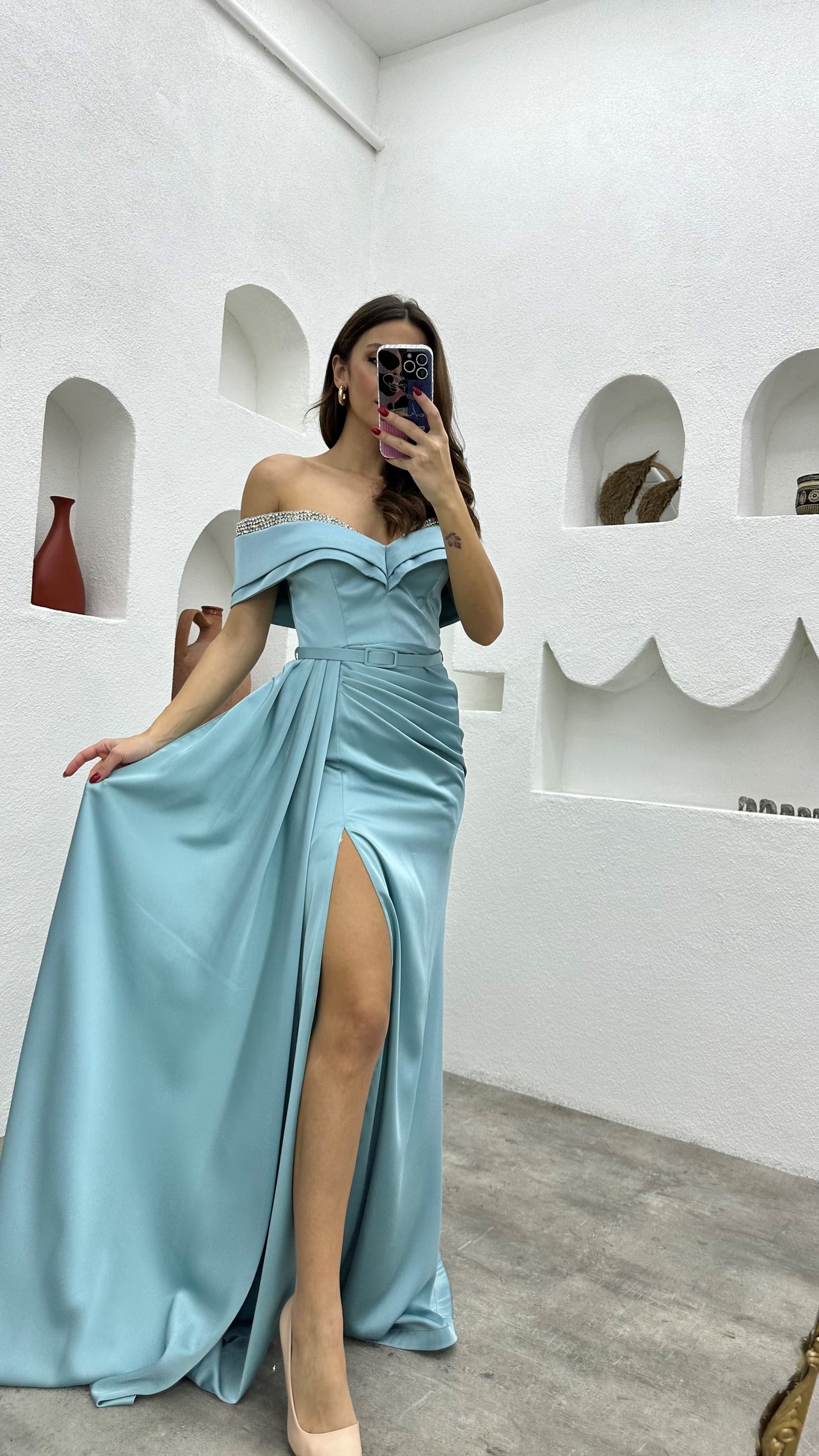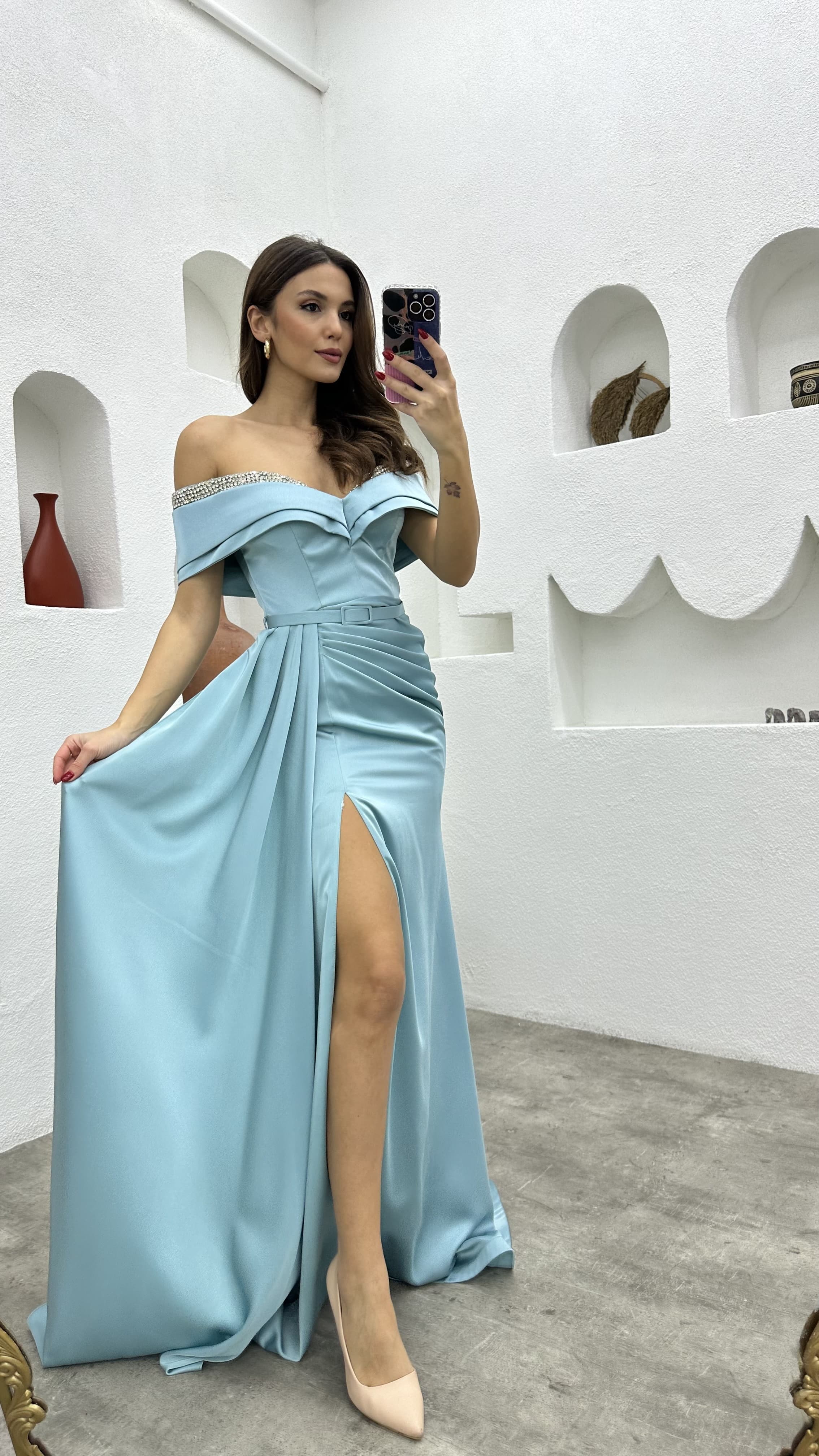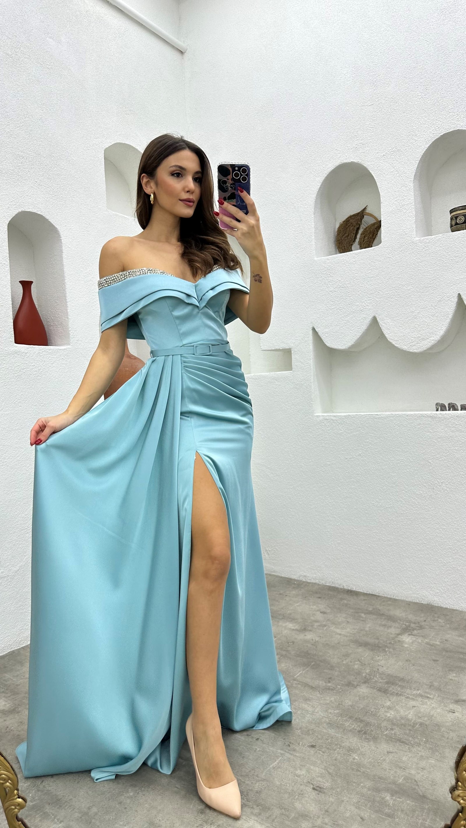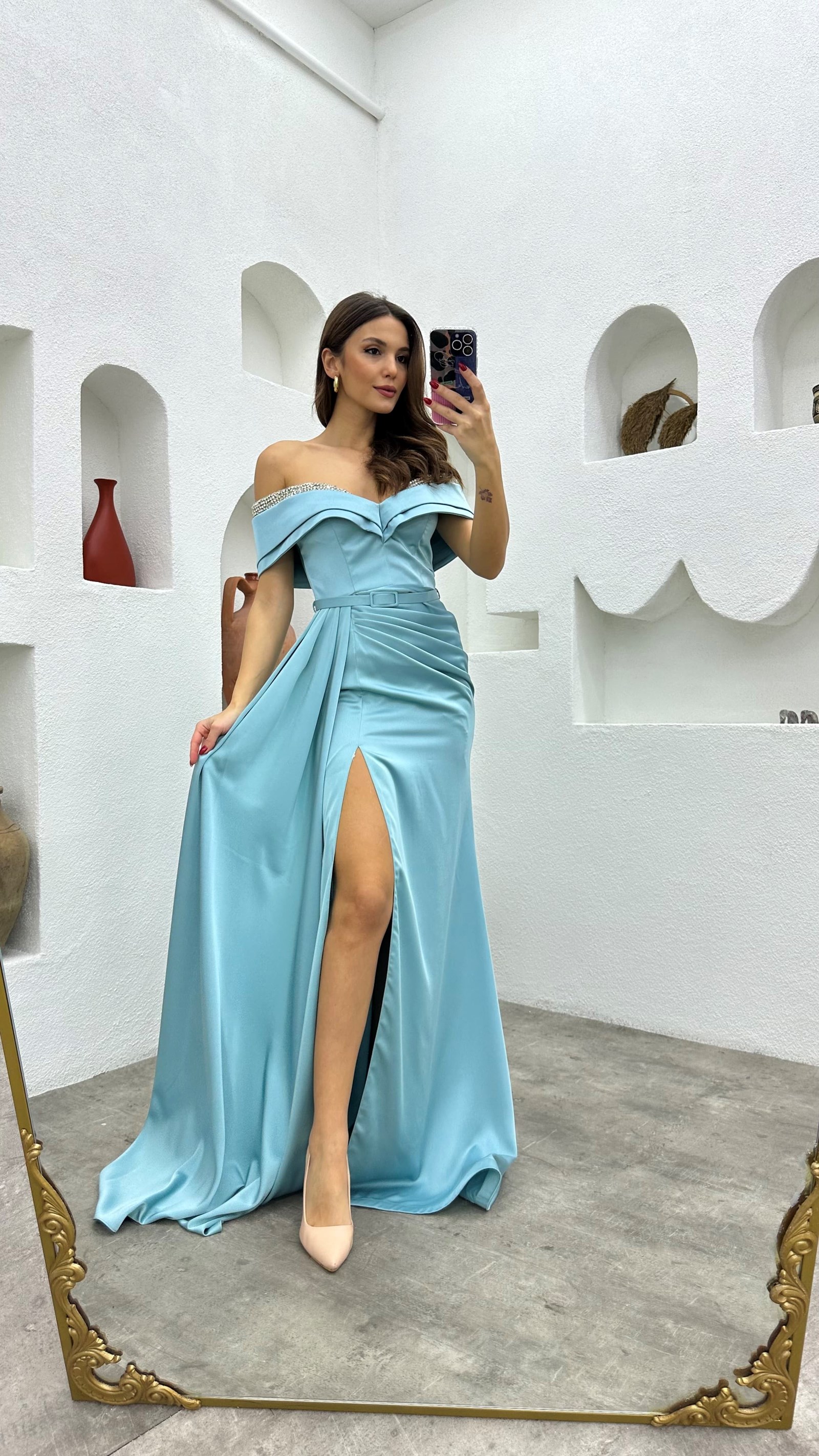 • Mint Yeşili Göğüs İşlemeli Drapeli Saten Abiye Elbise