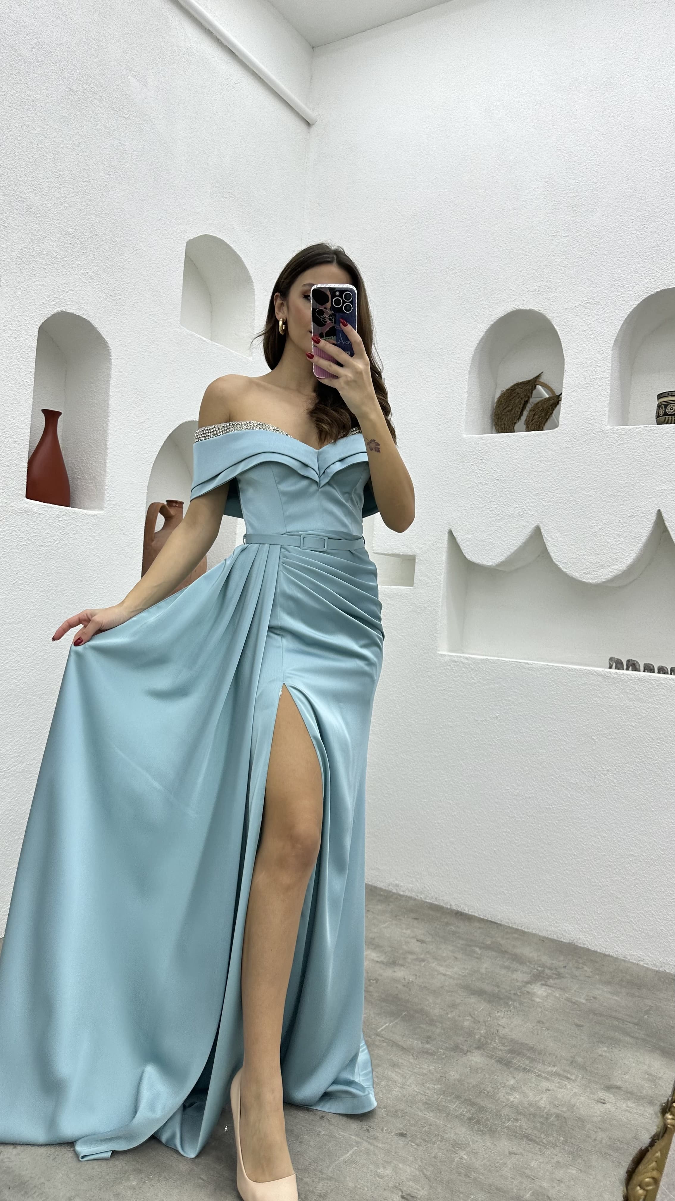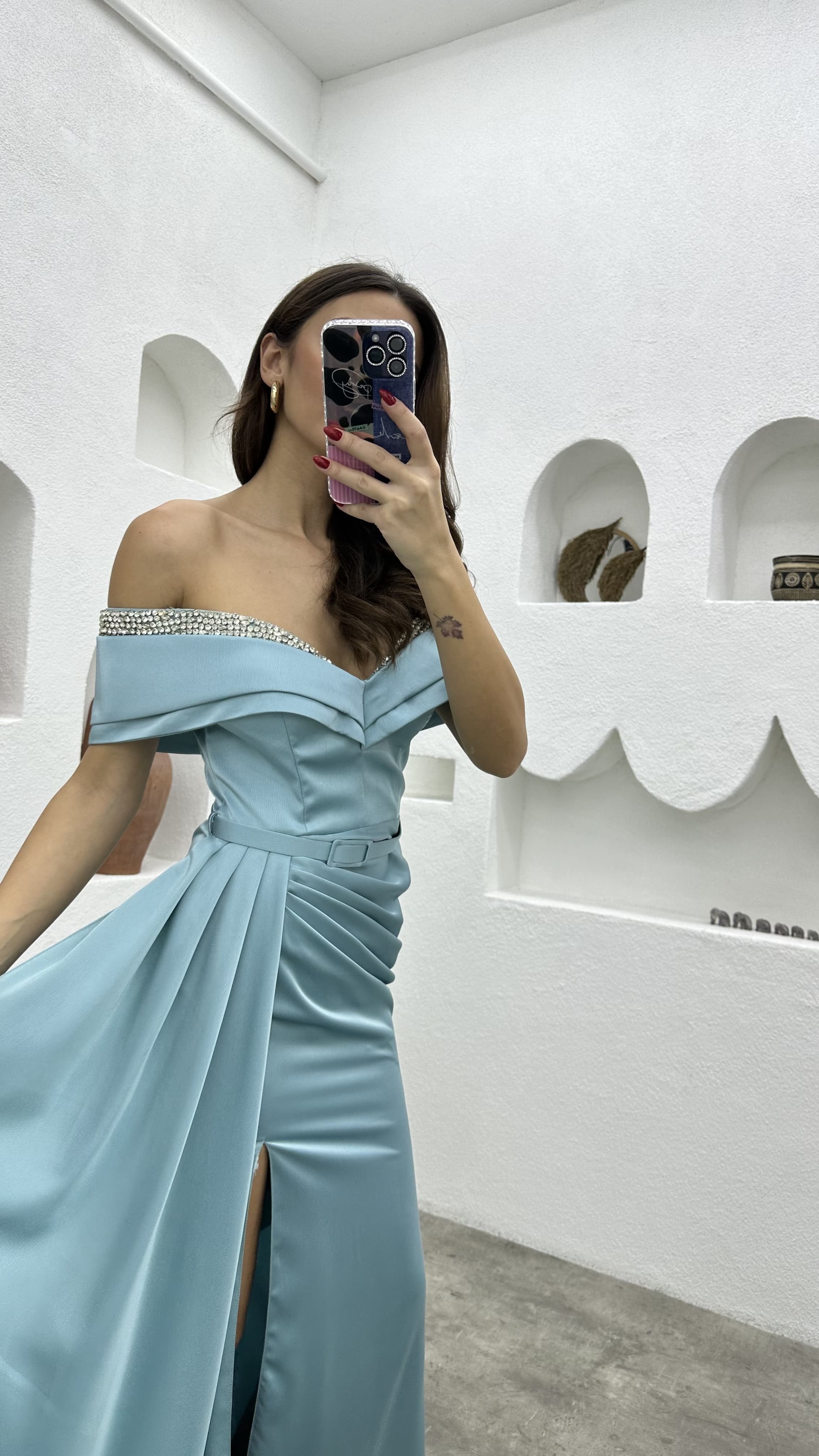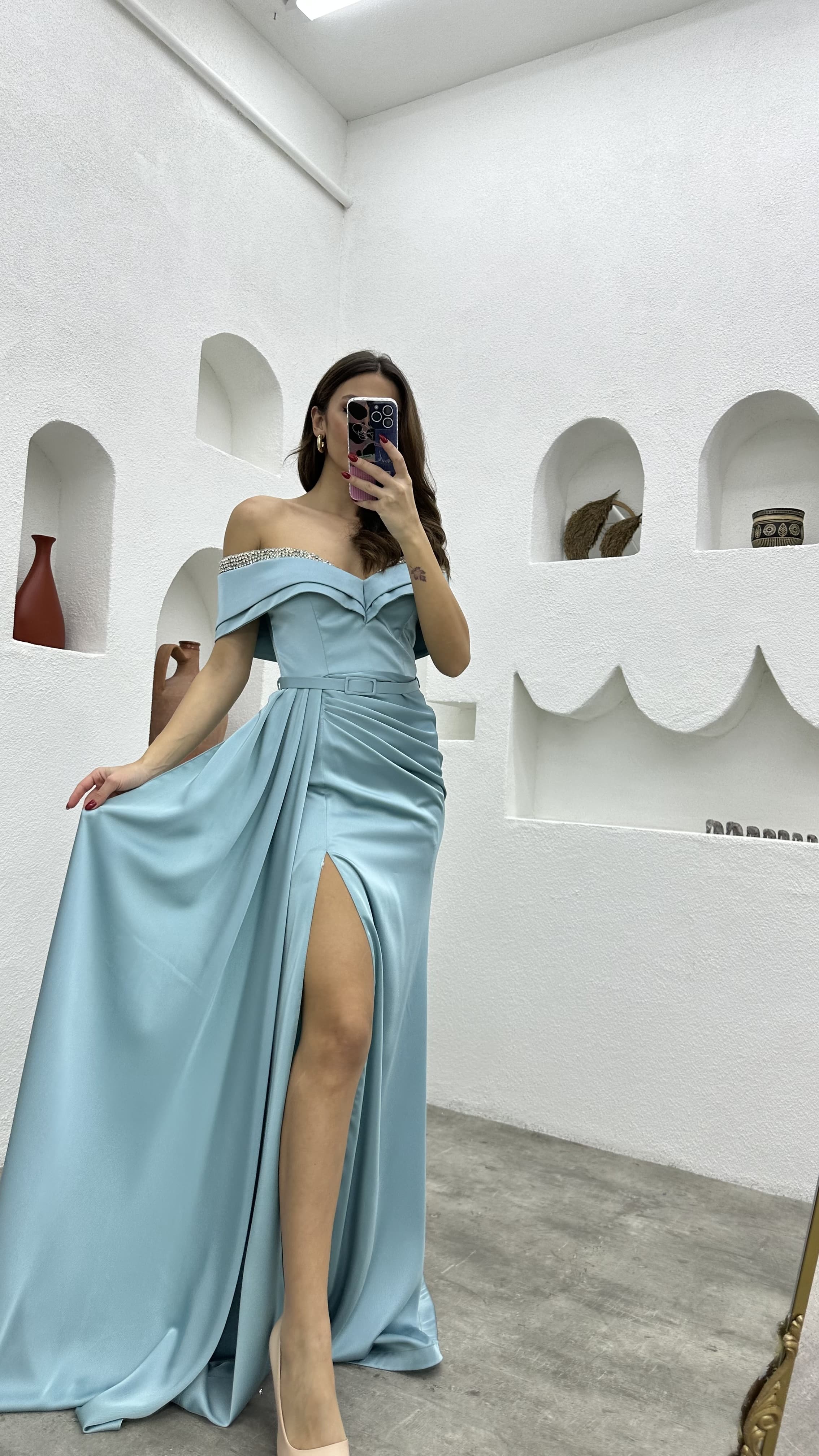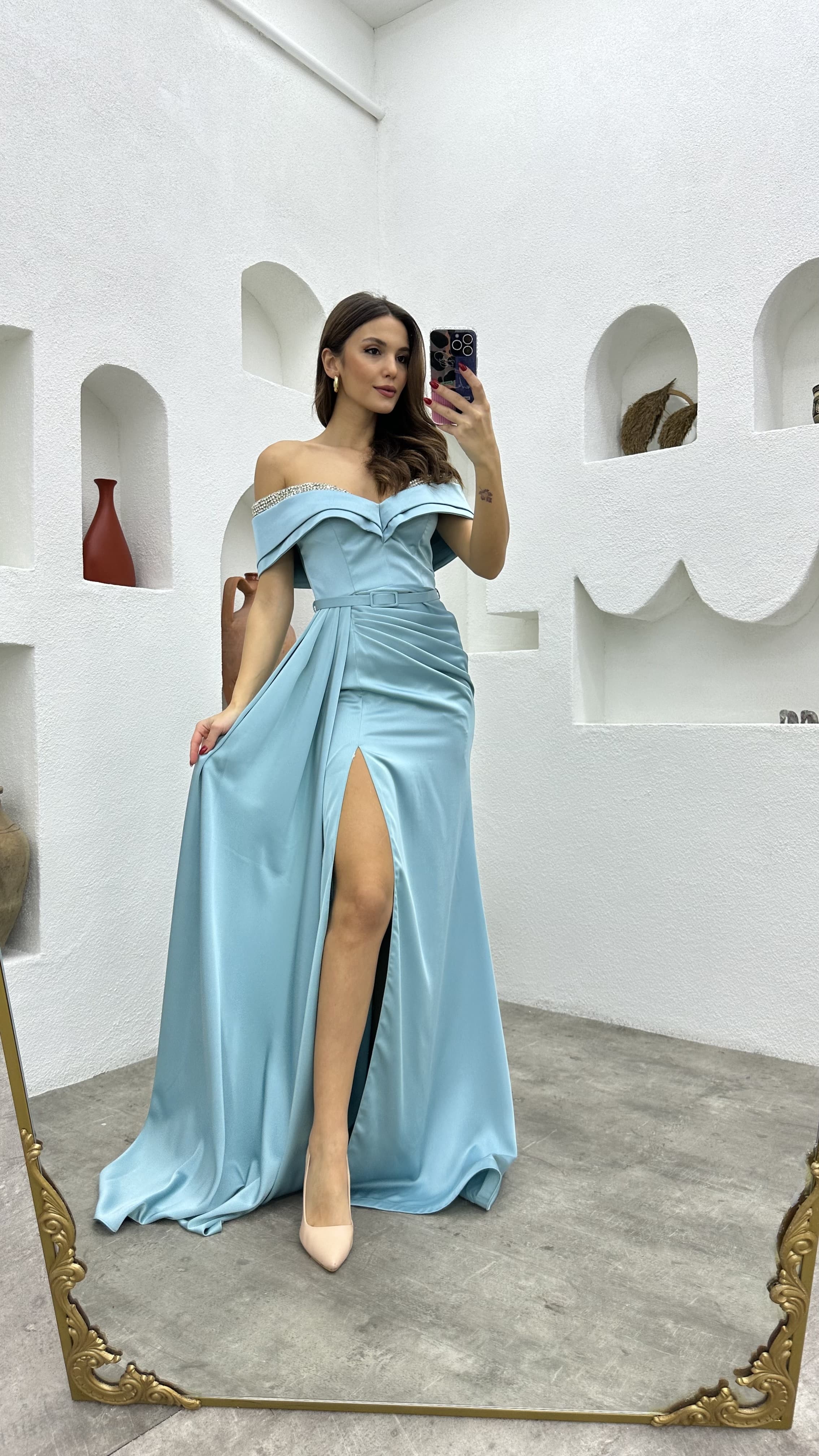 • Mint Yeşili Göğüs İşlemeli Drapeli Saten Abiye Elbise
