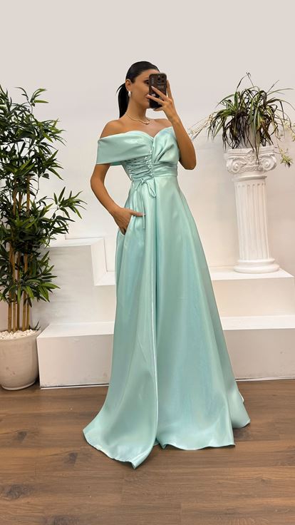 Ürün 36-42 bedene kadar uyumlu, göğüs pedli, astarlı, arka kapama fermuar, cepli, yırtmaçlı, bel detay abiye olarak tasarlanmıştır.