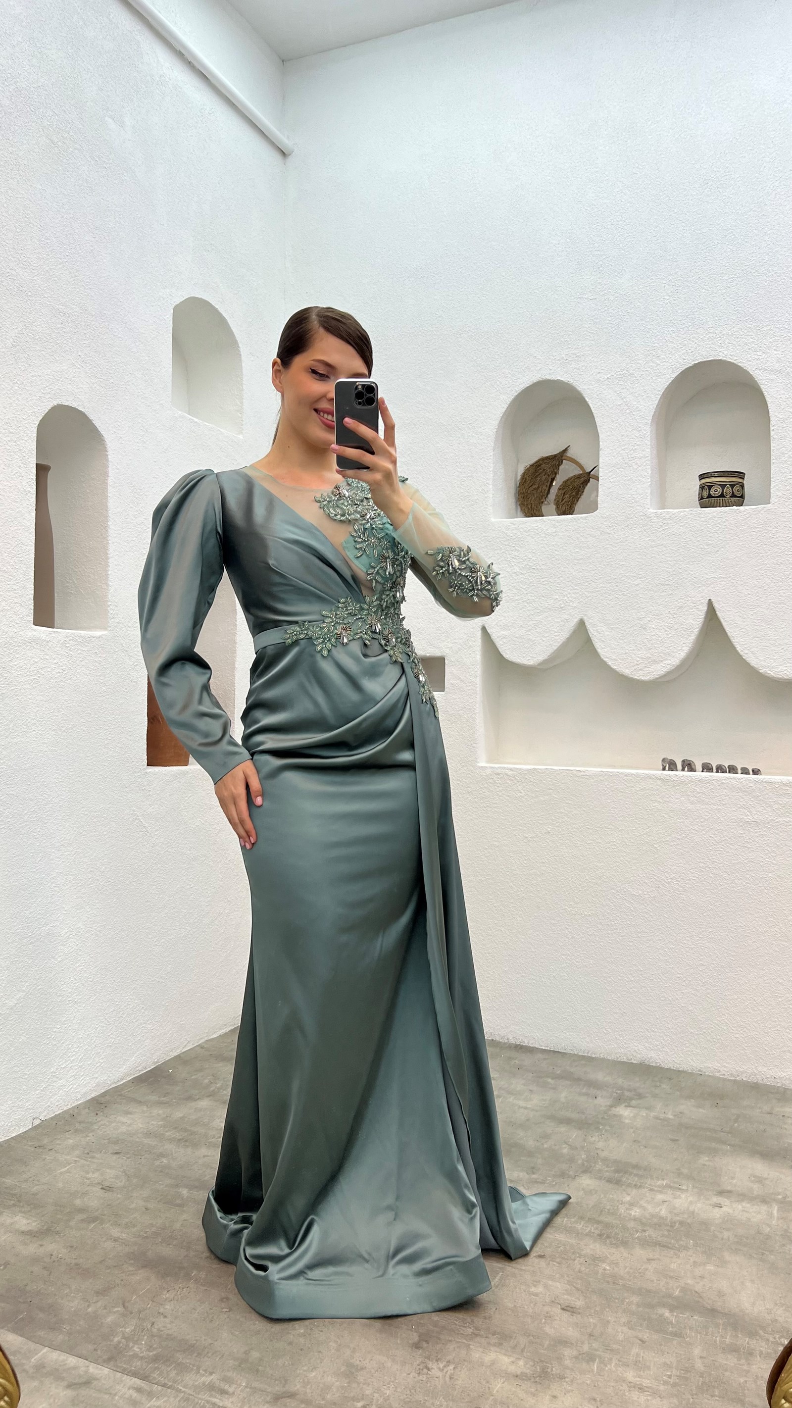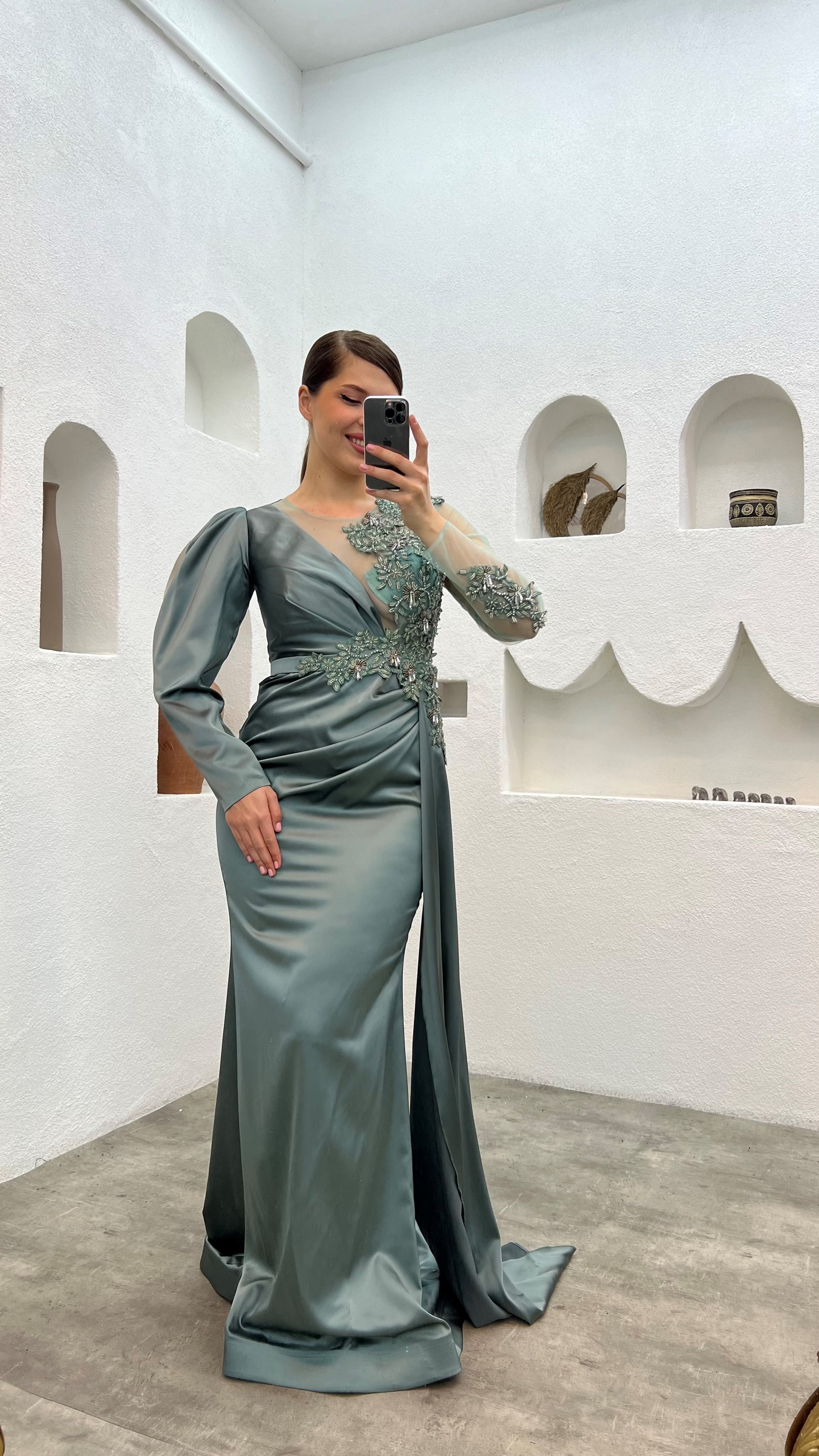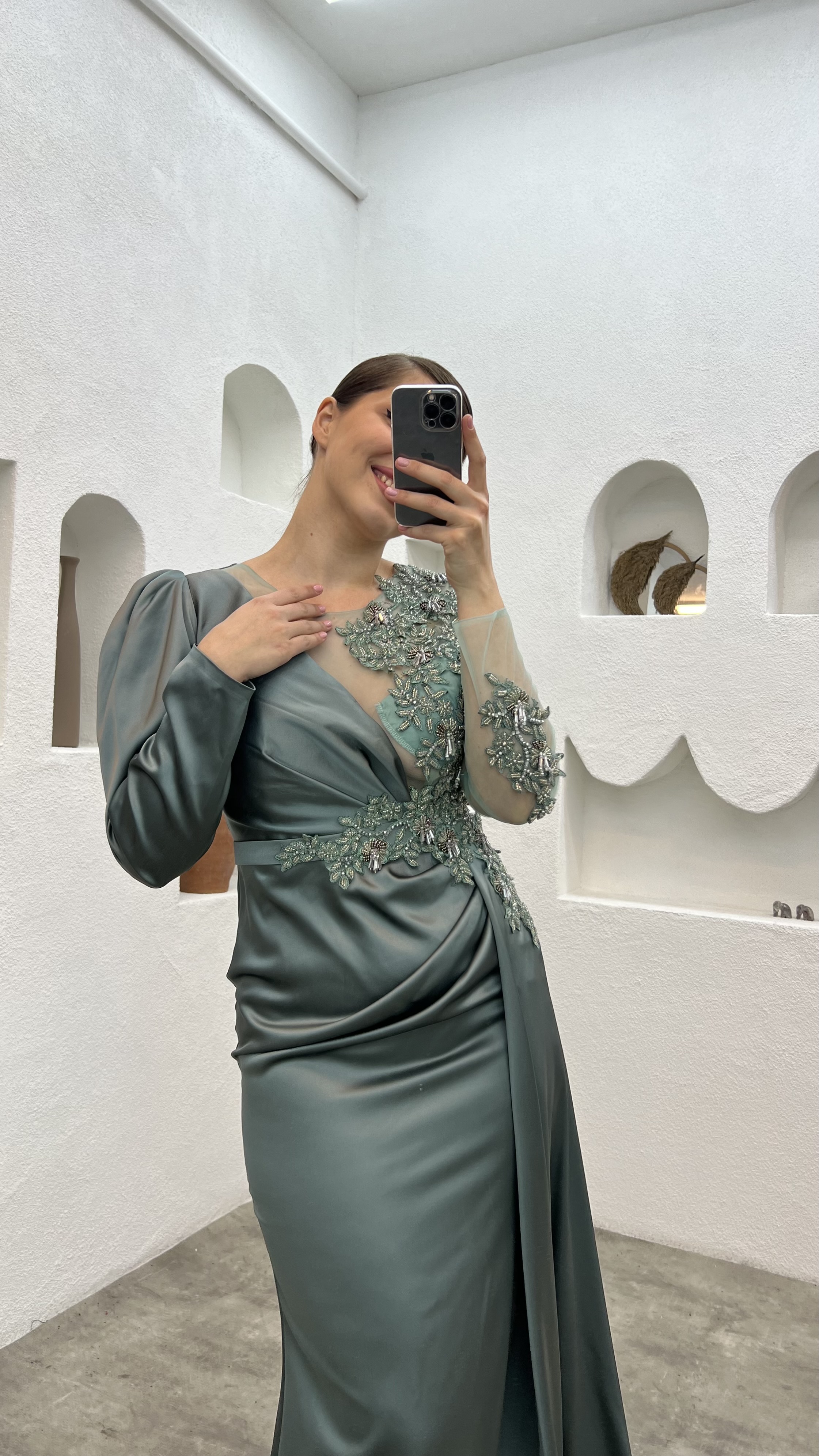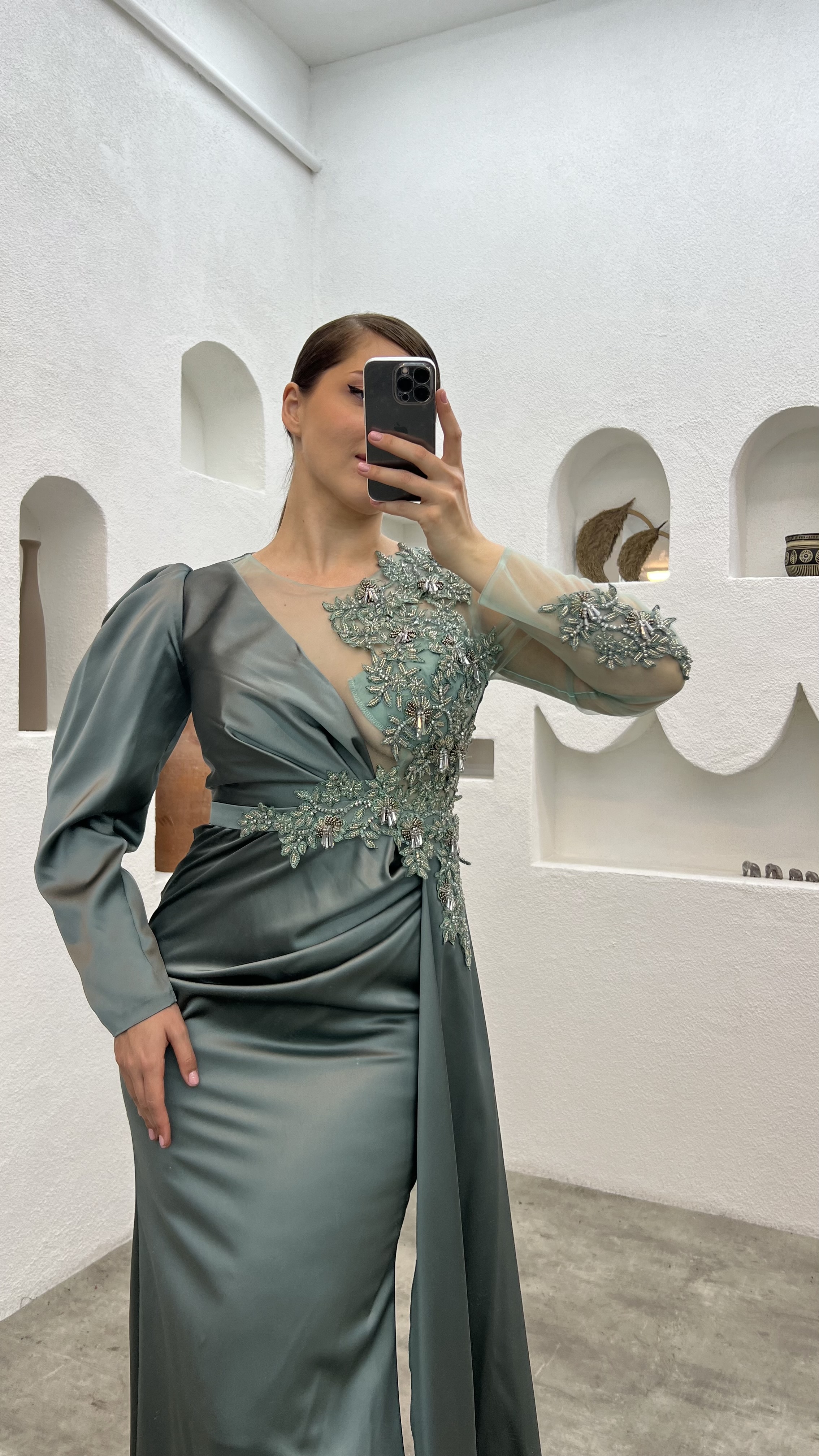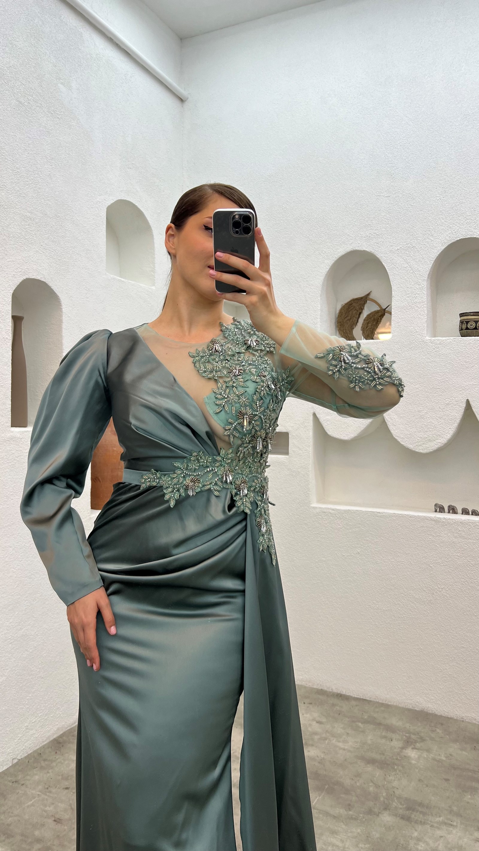 • Mint Yeşili Tek Kolu Tül Detay İşlemeli Büyük Beden Abiye Elbise